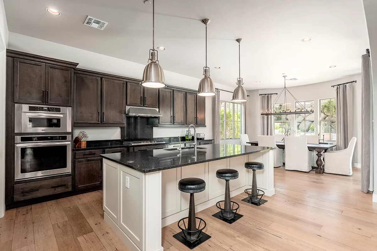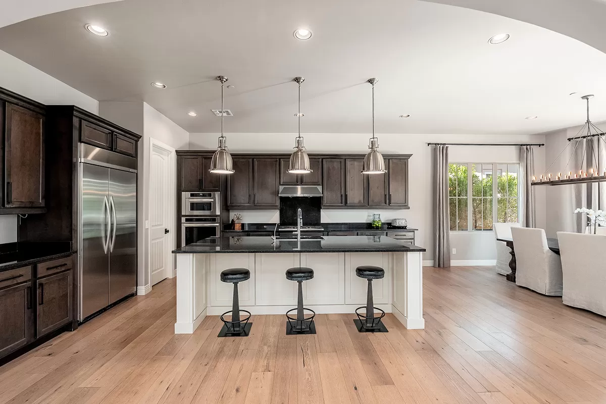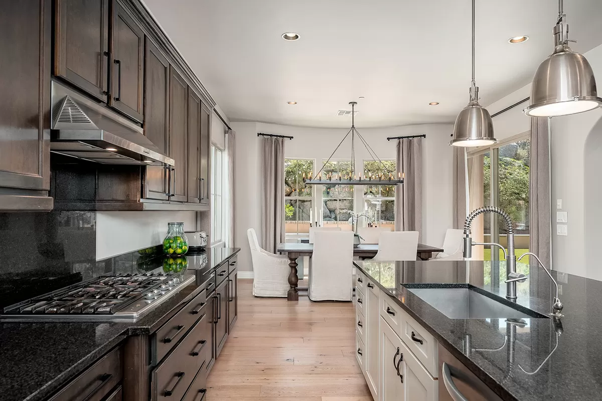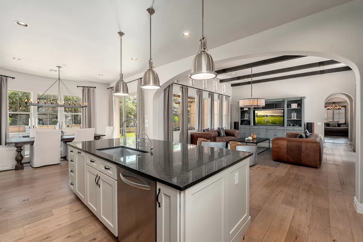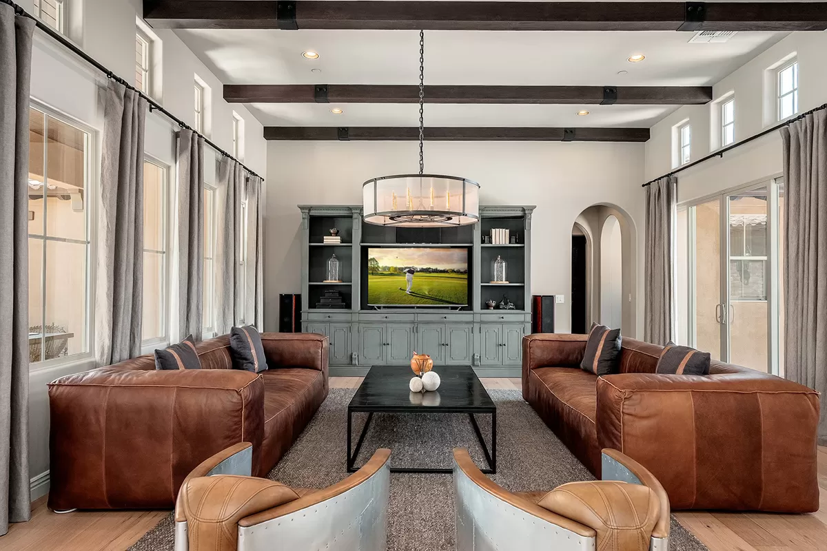 The chef’s kitchen is the heart of the home, featuring a large center island, stainless steel appliances, gas cooktop, walk-in pantry, and generous cabinetry. Clerestory windows and wood beam ceilings enhance the natural light and architectural charm.