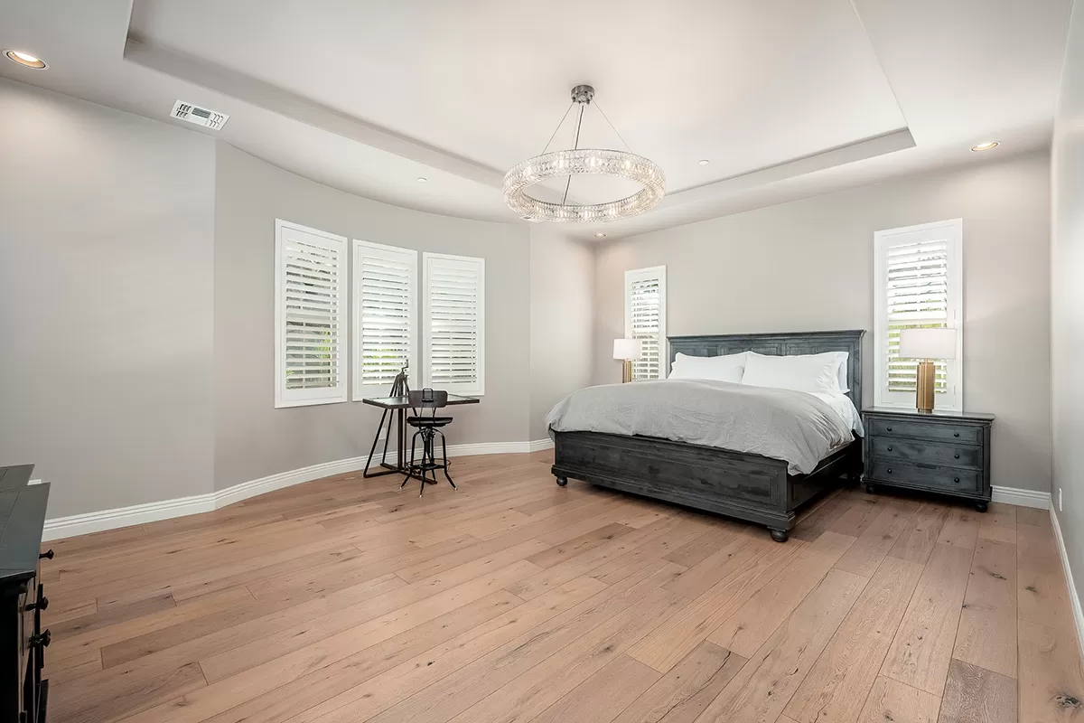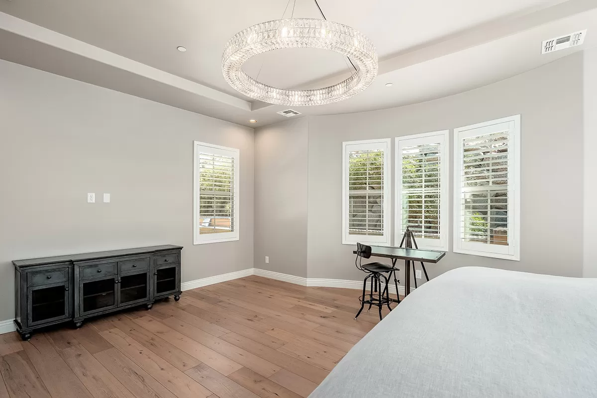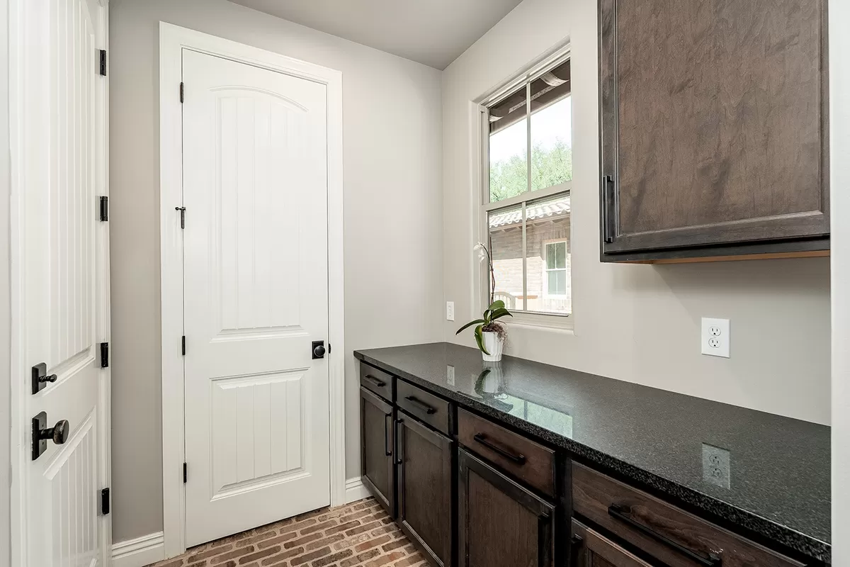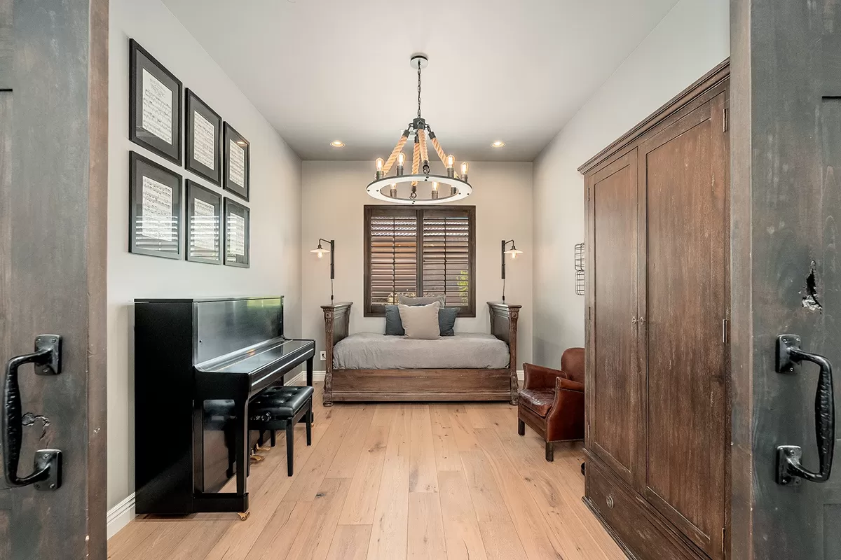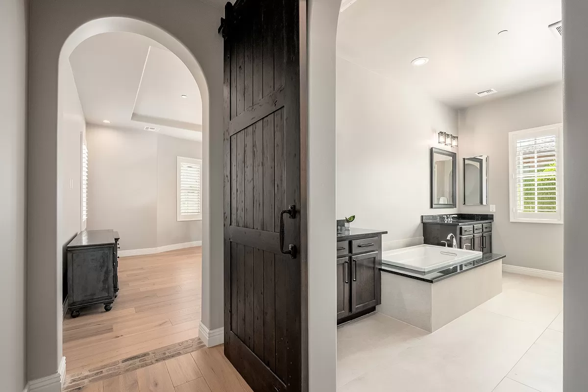 The versatile layout includes a dedicated office behind rustic barn doors—ideal as a flex space—and a custom touchdown station near the garage. The serene primary suite features a spa-like bath with a soaking tub, dual vanities, a tiled walk-in shower, private water closet, and a fully customized walk-in closet.