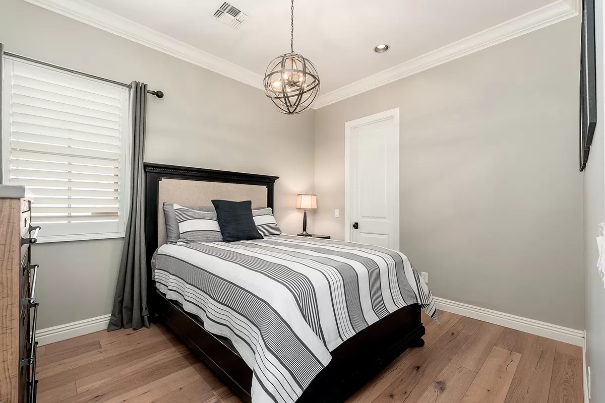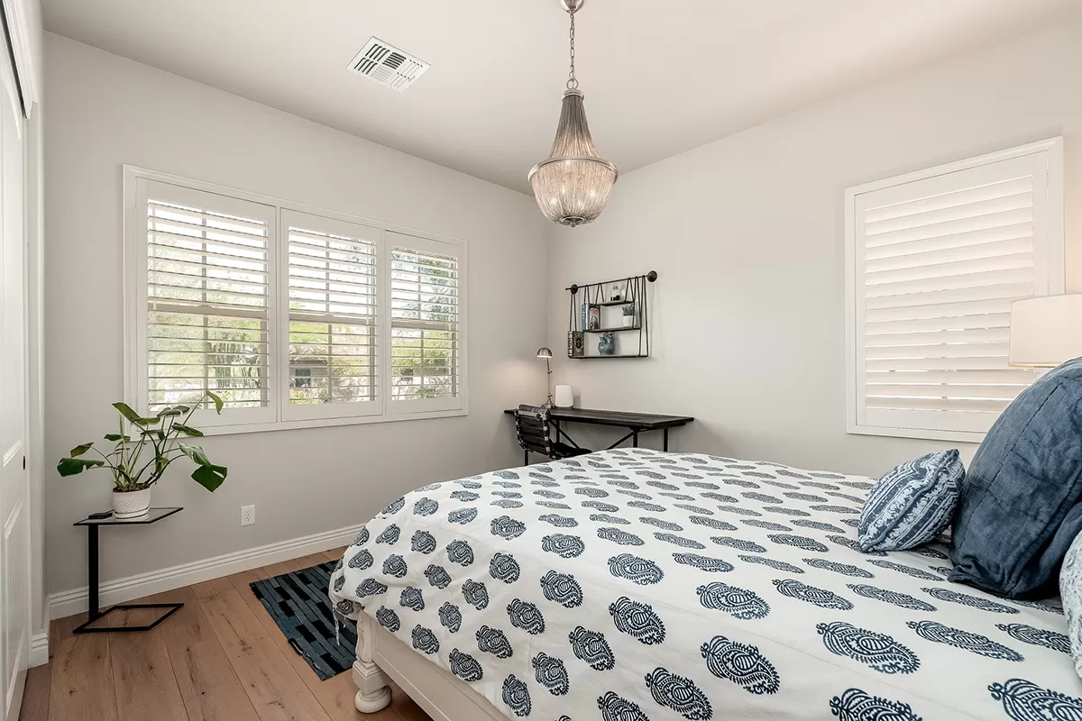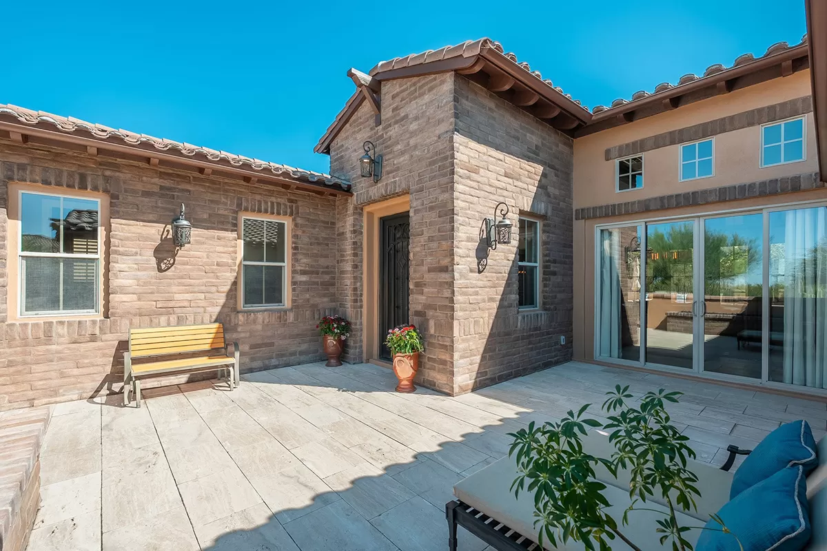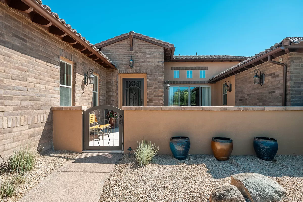 Tucked into a quiet cul-de-sac in gated Quisana in North Scottsdale, this tastefully upgraded 2013-built home blends timeless design with modern comfort. From the rotunda entry with a custom glass-and-metal front door to the spacious open-concept layout, every detail is thoughtfully curated, including wood floors with brick inlay accents and designer Restoration Hardware lighting throughout.
