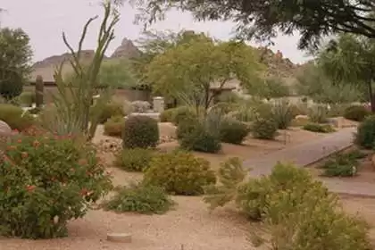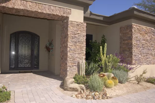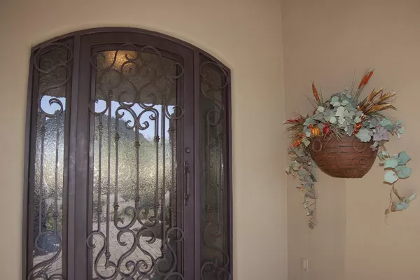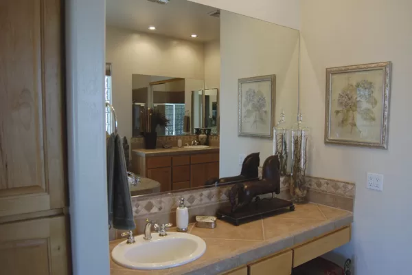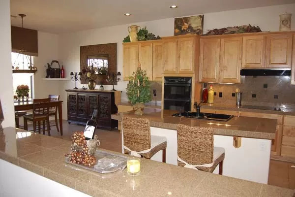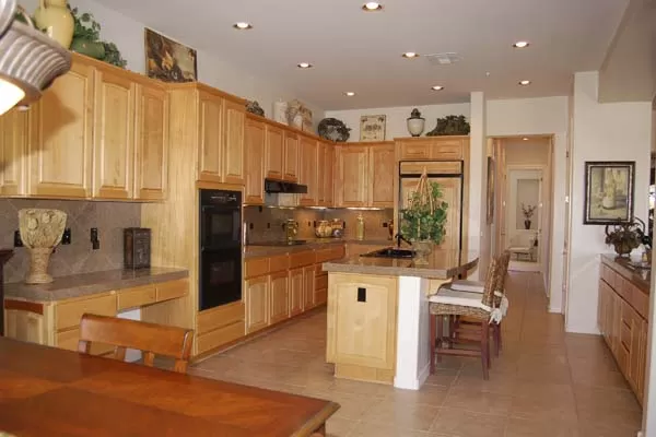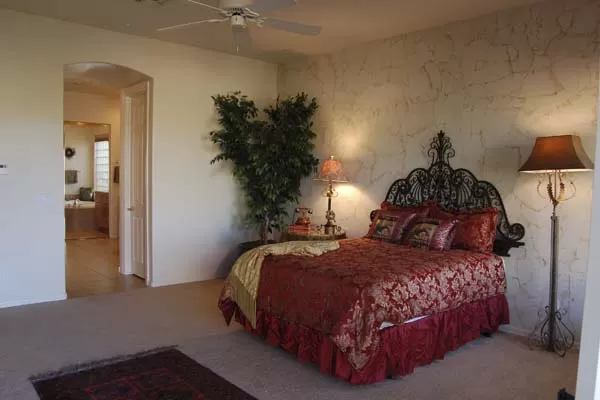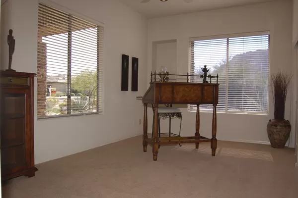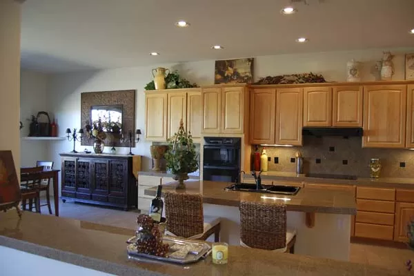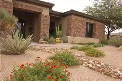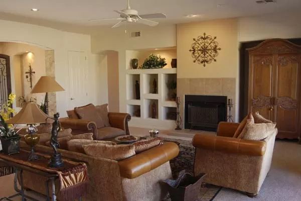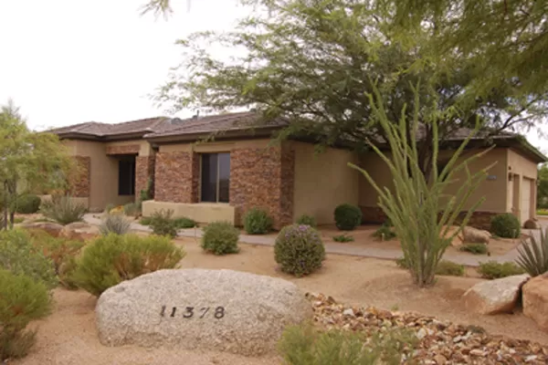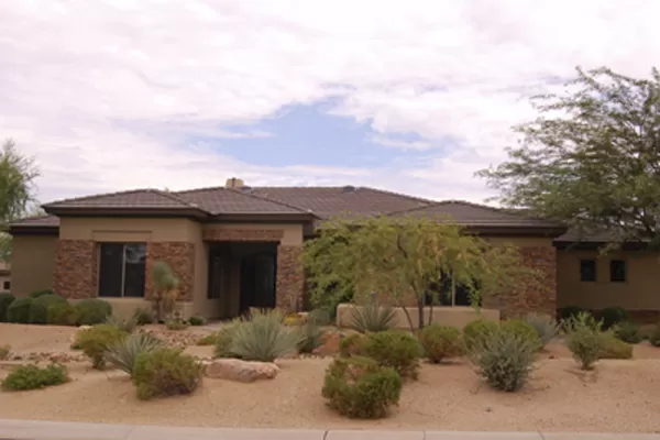 Beautiful Monterey home in the gated community of Desert Summit. Quiet interior location on a half acre lushly landscaped double corner lot. Pavers flow throughout driveway, walkways, entry & back patio. Enter through a custom Cantera door of glass & iron into large foyer with diamond granite inlays & custom paint. Great room floor plan has high flat ceilings, custom window treatments, gas fireplace & sliders to back patio. Kitchen has granite, built-in refrigerator, 42in maple cabinets & writing desk. Back patio has beautiful mountain views & privacy with flowing fountain (room for pool/spa).Garage has epoxy floors, built-in cabinets & evaporator cooler. A terrific value in neighborhood with $2mil+ homes.
