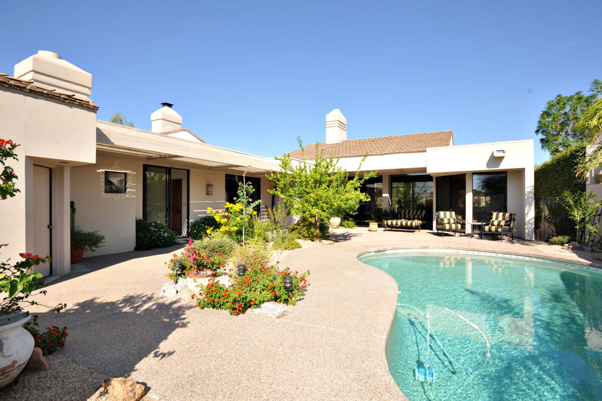 Beautiful well maintained home in ‘The Pinnacle’ joining prestigious Pinnacle Peak Country Club and Golf Course. Great room with formal dining area, kitchen with large breakfast room. Large master bedroom with adjacent family room with fireplace, wet bar, and refrigerator. Other bedroom like a master suite as well. Lots of views looking out to the pebble tec pool and mountains. Roof and skylights were resealed and painted two years ago. Gated community. Only 45 villas ranging in sq. footage from 2146 to 3000 sq. ft. Many restaurants, grocery, post office in walking distance.