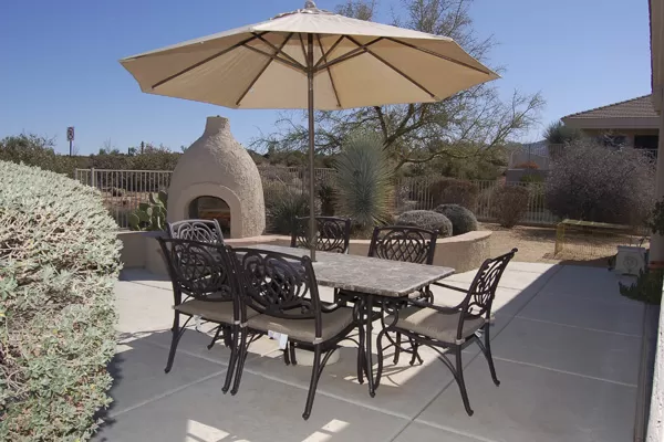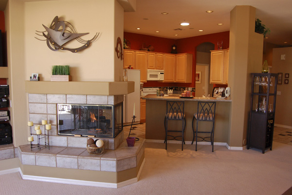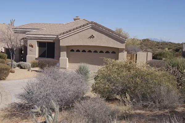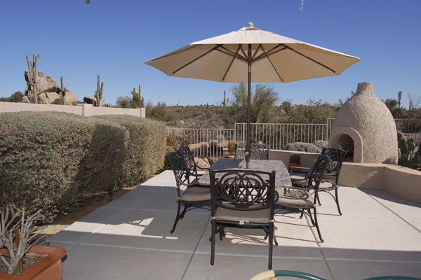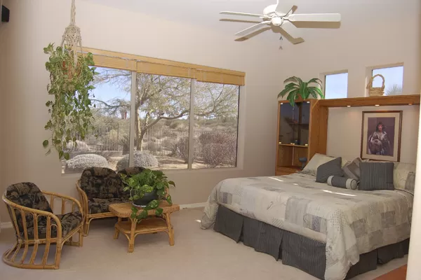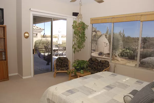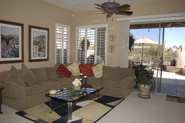 Troon Village home offers outstanding mountain views in the distance and views of incredible large boulder outcroppings close up. Extended patio is great for outdoor entertaining and has a wood burning kiva fireplace and banco seating (plenty of room to add a pool or spa). Inside this charming great room home, there is a wonderful 3-way gas fireplace (visible from great room, dining, and kitchen), built-in entertainment shelves, and built-in speakers. Kitchen has been remodeled with slab granite counter tops and features a breakfast bar that opens to the great room. One of the guest bedrooms has its own private bath. Very warm and inviting home!!