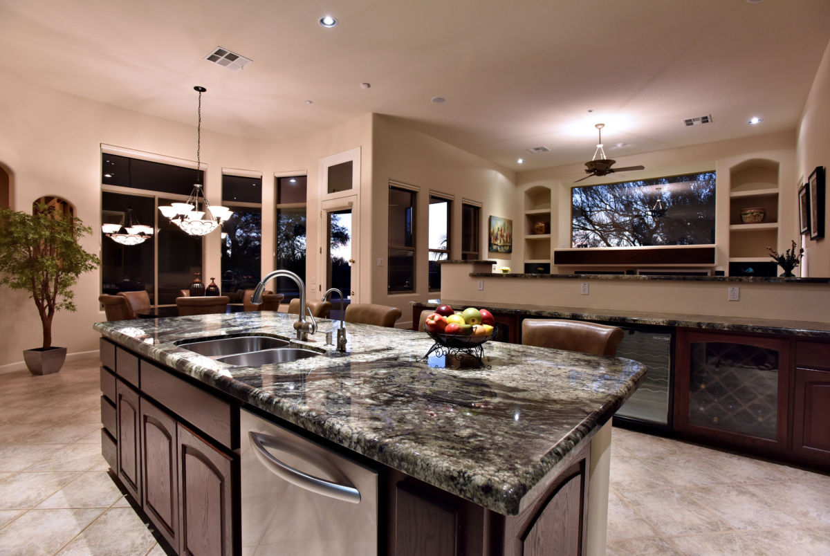 The perfect Winter Retreat in the exclusive DC Ranch Country Club! Private, large quiet location in an extremely quiet Cul-de-Sac, backs to a lush wash, without a sign of your neighbors. This outstanding home has had some wonderful updating over the past few years: Hardwood floors in the Master bedroom and Family room. An amazing built in entertainment center, complete will all audio/visual equipment, including 50″ Fujitsu Flat Screen TV! French doors leading to flagstone patios and heated tile pool, with cascading waterfall, built in BBQ, and cozy outdoor fireplace! Gourmet kitchen w/Cherry finish cabinets, travertine master bath steam shower, ceramic tile floors, 3 fireplaces, Custom Window Coverings, Alarm System, Fresh Exterior Paint, New Water heater and 2 AC Units in 2008!
