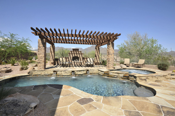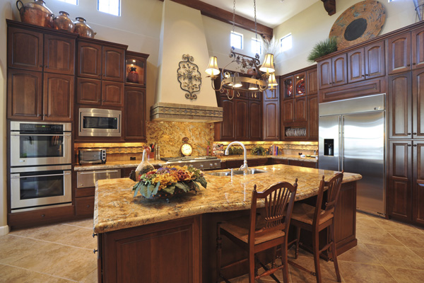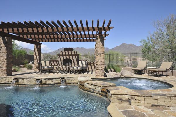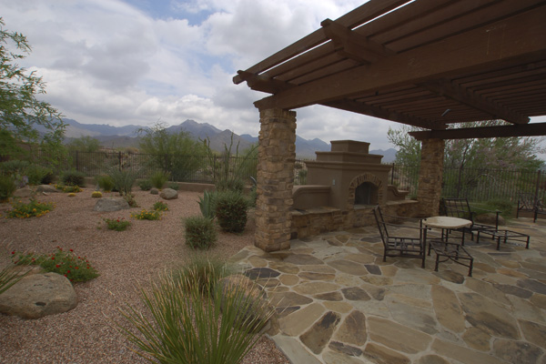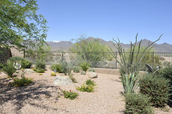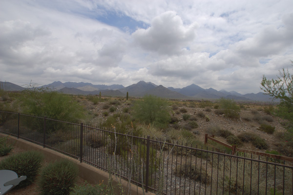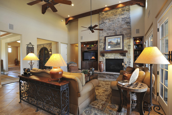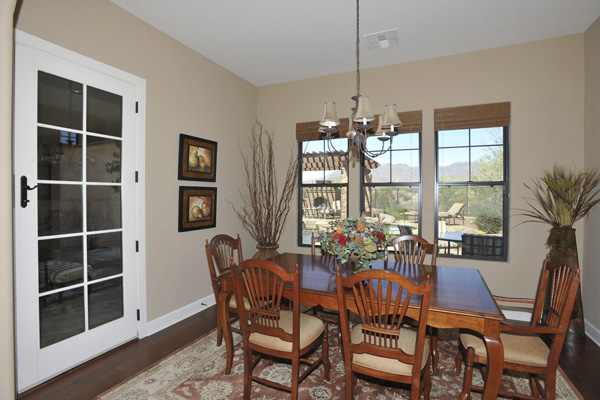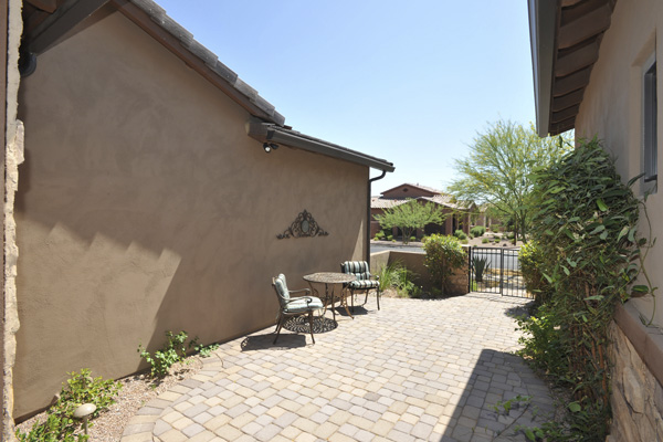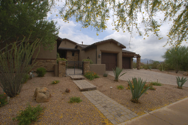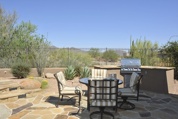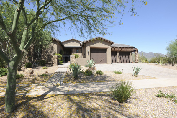 Furnished-Gorgeous great room floor plan featuRestravertine, ceramic tile and wood flooring. Gourmet kitchen with 10 ft. high cherry cabinetry, granite slab counters, huge island, stainless steel appliances, gas cook top, 600+ bottle wine room, and more. Entertainer’s back yard with beautiful McDowell Mountain views, large ramada with gas fireplace, pebble-tec heated play pool and spa, built-in BBQ. Lot backs to large wash with another wash on one side providing nice privacy. Plus side yard brick patio off dining room. Stone gas fireplace, surround sound, 42” flat screen TV in great room with custom cabinetry, wood beams and 16′ ceilings. 4th bedroom setup as exercise room.
