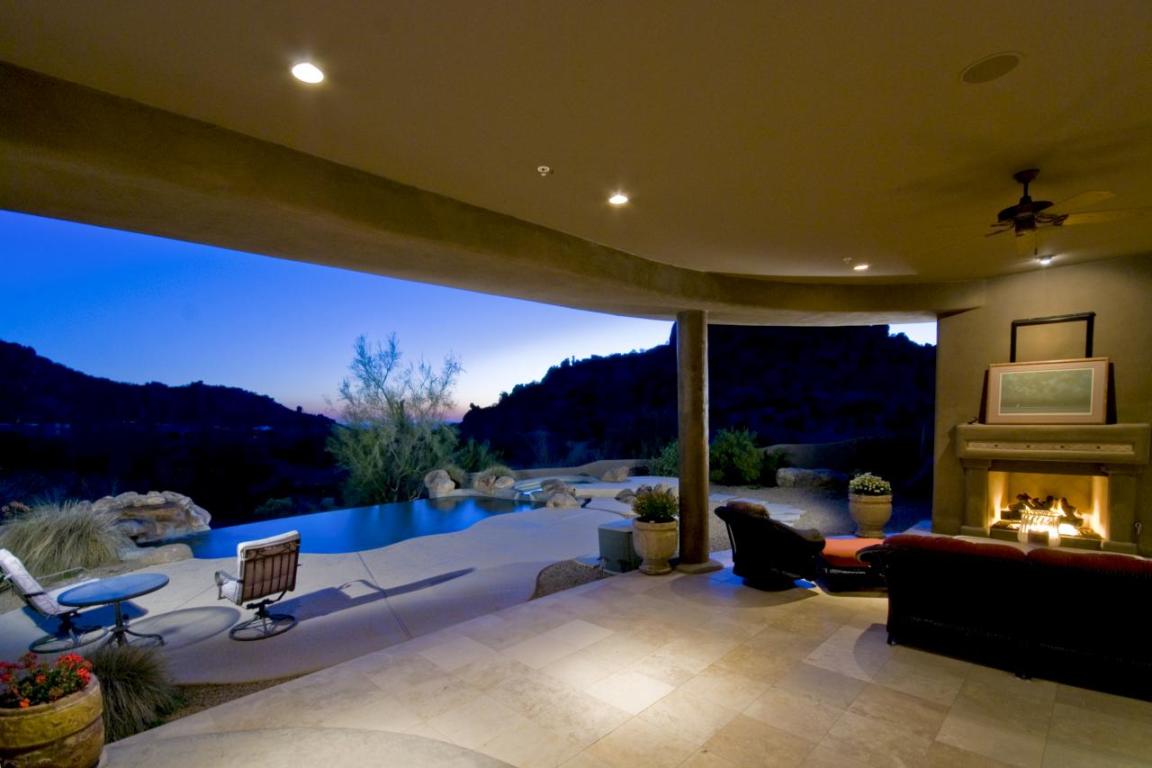 A fabulous buy at this price! This single level custom home in gated Desert Summit offers privacy and spectacular city, sunset and mountain views. Courtyard entry opens to greatroom with fireplace. Glass sliders open to covered patio and beyond to heated pool and spa. Formal dining has bar/butler’s pantry. Kitchen with gas cooktop plus breakfast room. Large master BR with double closets; second BR is ‘attached casita’; all BR have private bath.Views to city and mountains are spectacular. Pavers in driveway. Courtyard entry. Greatroom with travertine with doors sliding open to covered patio with travertine creating one large entertaining area. Covered patio approximately 1000 sq. ft. Overhang of 23′ creates an exterior living room. Covered patio extends from kitchen/living room/master bedroom.Ceiling treatments include coved lighting. Fireplace in Greatroom. Kitchen with gas cooktop; all Viking appliances. Two ovens plus microwave. Island with eating area in addition to separate breakfast room. Formal dining with built in cabinets and coved lighting. Butler’s pantry leads to bar in dining room. Wet bar, with granite counter, includes sink, wine storage. Pantry. Powder room. Large laundry/hobby room with travertine counters, ironing board, sink, lots of storage plus a window. Large master with double vanities, jetted tub, shower and double closets and access to patio. BR 2 is “attached casita” as it has separate entry to courtyard, refrigerator and built in cabinetry. BR’s 3 and 4, split from master, have full baths and walk in closets. Currently painted as children’s rooms.Seller will give allowance for painting children’s BRs. One bedroom has access to patio. Large hall closet. Covered patio with fireplace and TV outlet. Heated pool and spa with waterfall. Central vac system. Oversized garage with sink, walk in storage and built in cabinets. Two AC units. Two hot water heaters. Water softener. Low E dual pane windows.