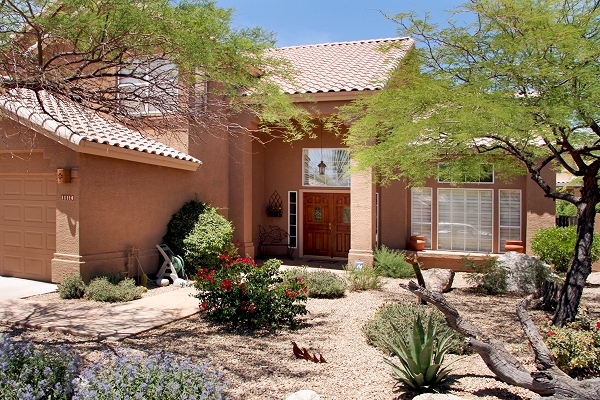 Beautifully landscaped and updated home with plantation shutters, stone accents and warm colors. 4 bedrooms 2.5 baths. All bathrooms have been remodeled with travertine flooring, counters, and ceiling to floor travertine shower w/glass enclosure complete with new fixtures and rich wood cabinetry. The kitchen offers newer stainless appliances and opens to the family room centered around a beautiful stone fireplace with built in wood shelving. Expanded Laundry with dog door and dog run. Lots of Storage. Lush, shady backyard with refreshing pool and covered patio.