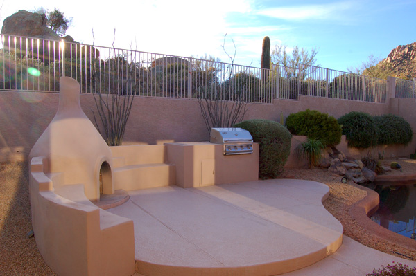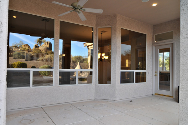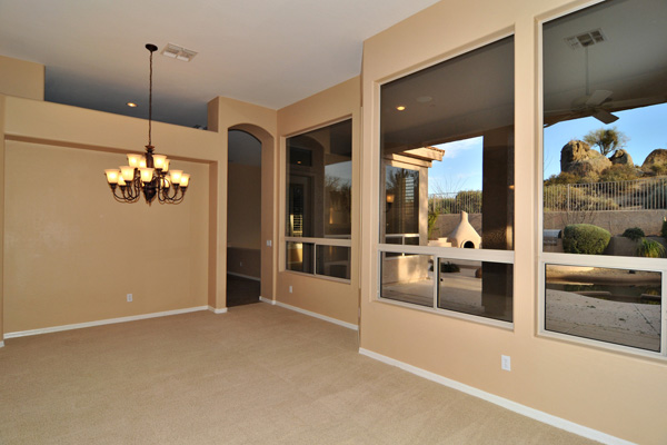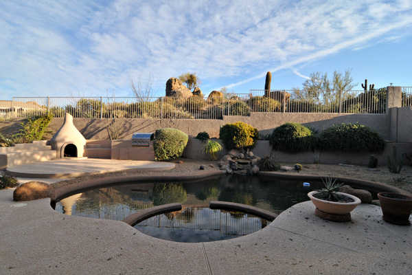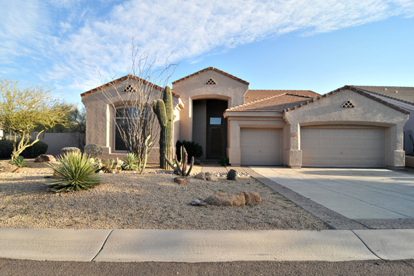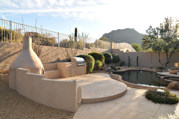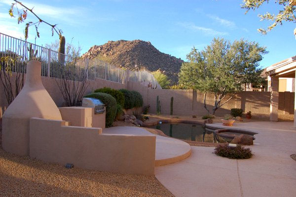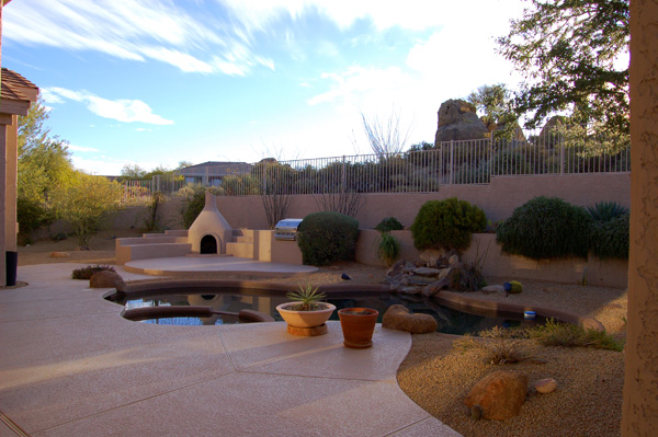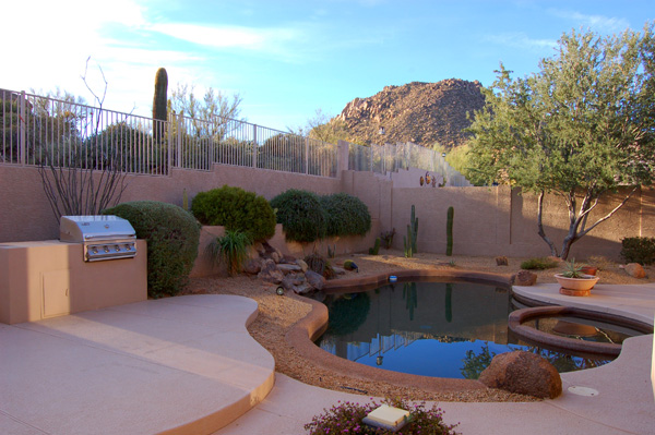 Beautiful 3 bedroom + Den home on premium lot with large wash on left & Natural Area Open Space (NAOS) in back with large boulder outcroppings & views of Troon Mountain. Light & bright with high ceilings, plantation shutters, & wood blinds. Home updated in 2005 with all new flooring, interior & exterior paint, upgraded SS sink, range & microwave to go with upgraded SS refrigerator & dishwasher. Beautiful slab granite countertops in kitchen. Outside has spacious backyard with heated Pebble-Tec pool, spa, & rock waterfall. Built-in SS gas BBQ grill, Kiva fireplace, pretty desert landscaping & large covered patio. Super home on a great lot with PRIVACY & VIEWS!