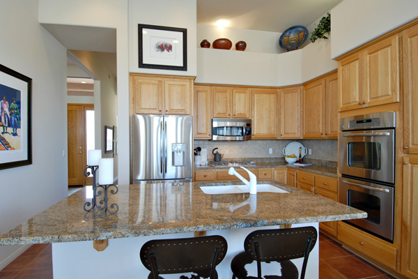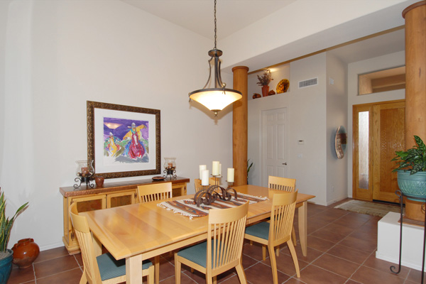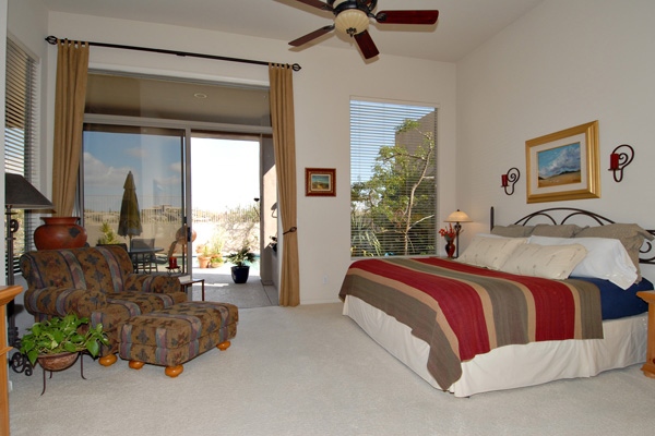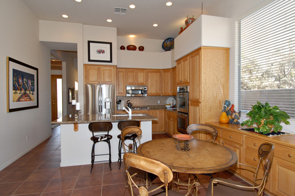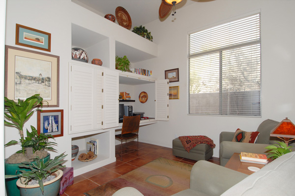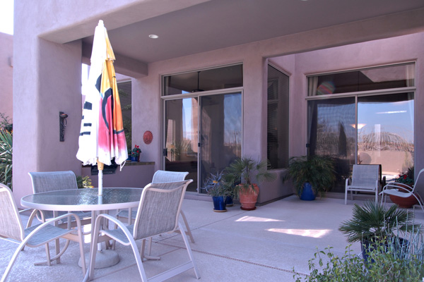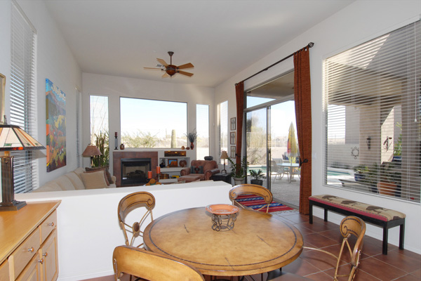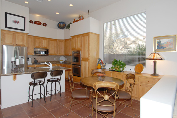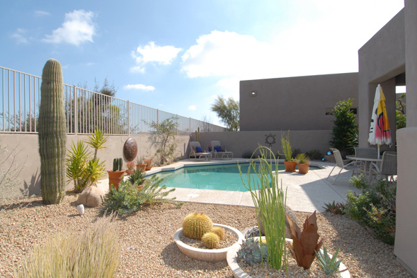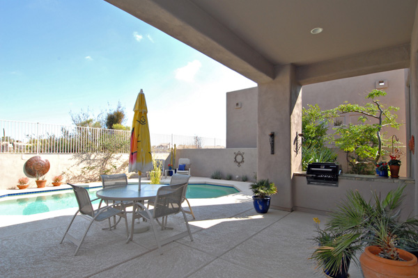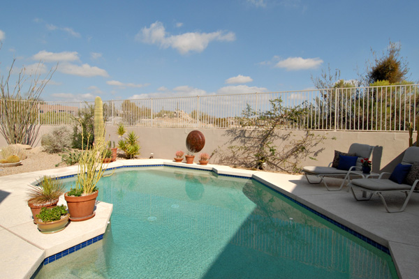 This meticulously maintained modern home in gated Pinnacle Canyon at Troon North is being sold turn-key ready – fully furnished down to the china, pots, pans, & dishes (excluding paintings and pottery). Great room with gas fireplace opens to kitchen with extended granite countertops on island for bar stool seating. Split floor plan with Master on one end and guest bedroom & office on opposite end. High flat ceilings & large windows to enjoy the desert views. Outside amenities include Pebble-Tec solar heated pool & built-in BBQ. Kitchen & Master bath remodeled, granite countertops, s/s appliances, new foam roof 2008, sink in laundry, water softener, refridgerator, washer & dryer included….all on a quiet interior location.