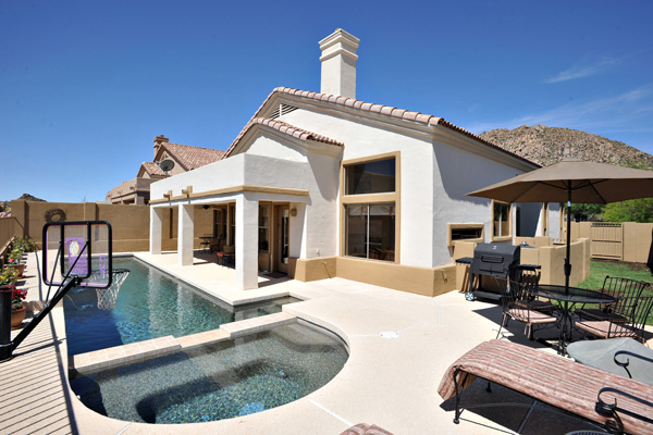 This lovely transitional style home in Troon Village is all about the VIEWS! Backyard faces south with exceptional McDowell Mountain views. Home backs to Natural Area Open Space allowing this home to have better views than other homes in the area. Great southwest touches with vega ceiling beams in the family room & kitchen plus custom vega window treatments. Interior features: 3 Bedrooms, 2.5 Baths, living/dining combo, 3-way fireplace, 10′ flat ceilings, single level home with no interior steps. Lap pool is 40′ long & large spa to take in the expansive views!!
