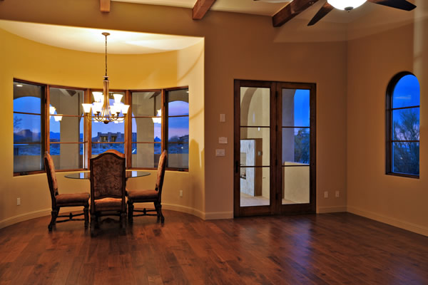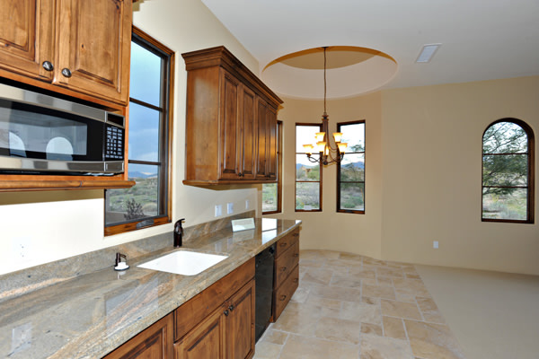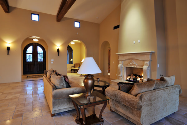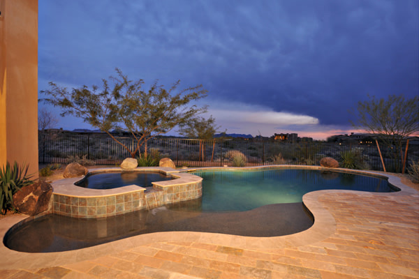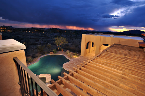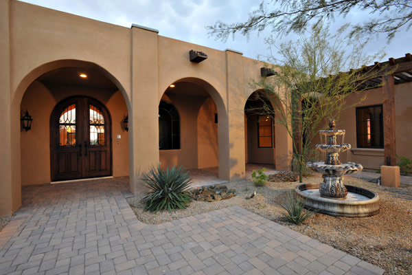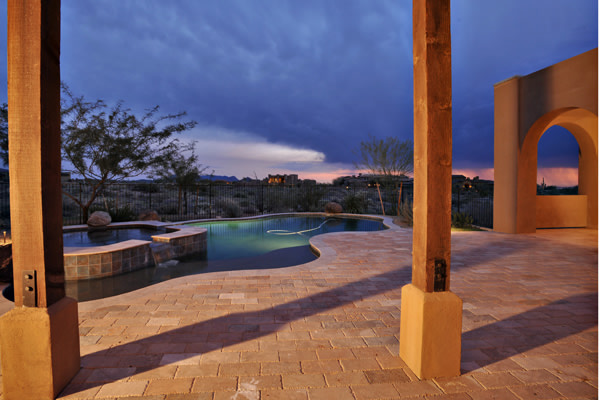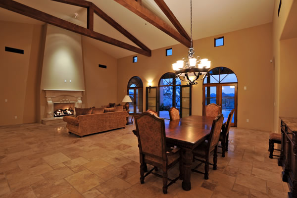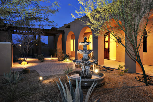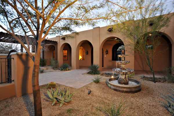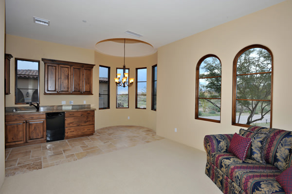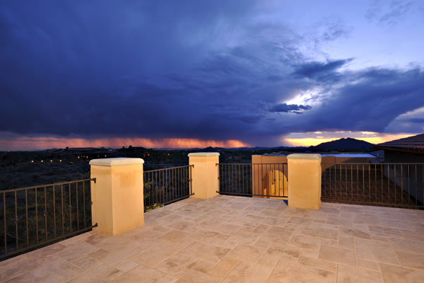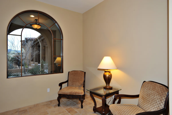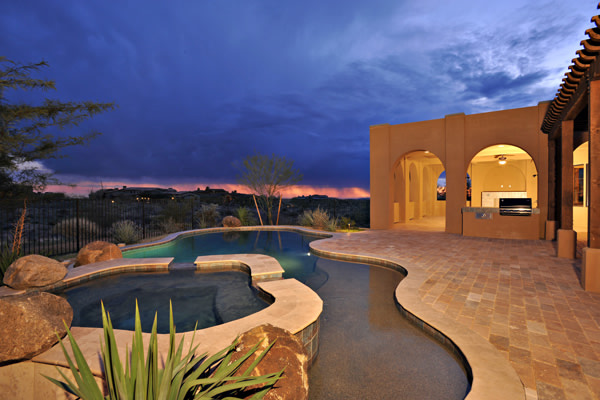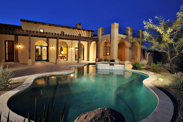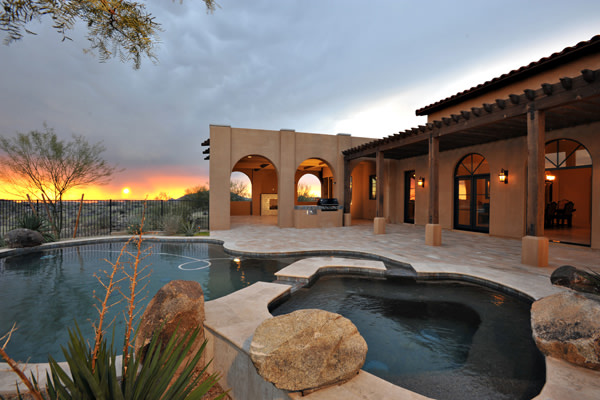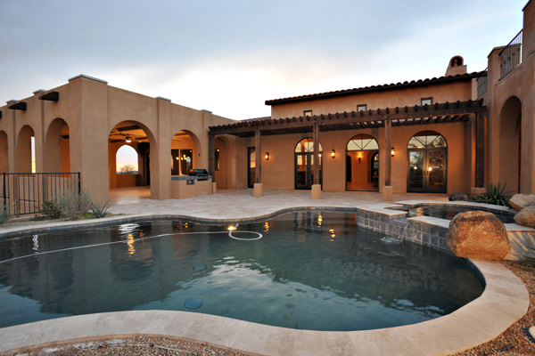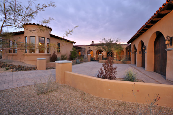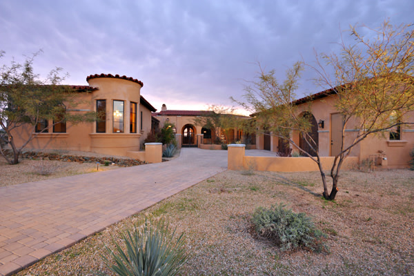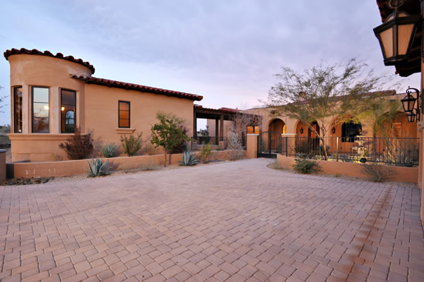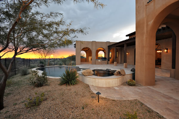 Custom 2008 Spanish Colonial home in Mirabel features outstanding appointments & is situated on a 0.86 acre lot with sweeping mountain views. This gorgeous home is ready for a buyer. Home features travertine & rough hewn wood floors, granite slab & travertine countertops, & wood beam ceilings. Gourmet kitchen with professional grade Dacor S/S appliances opens to family room. Enjoy the great AZ weather from the large covered travertine patios with pool, spa, fireplace, & gas BBQ or from the upstairs viewing deck. Main house has 3 bedrooms, 3 baths, plus wine room, sitting or music room, & office. Large guest house with living room, bedroom, & bath