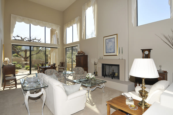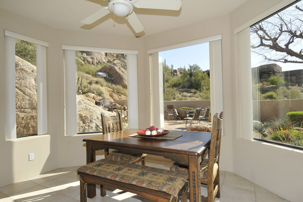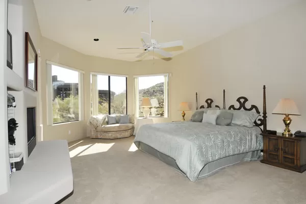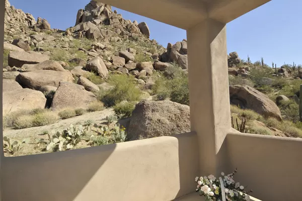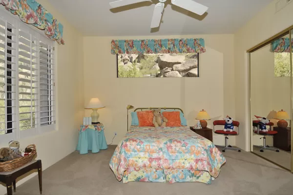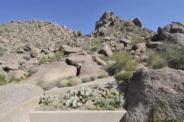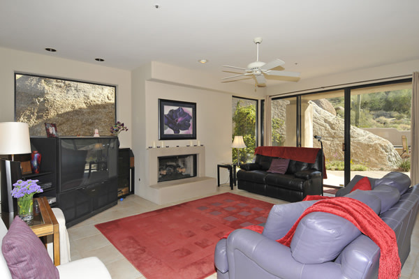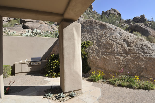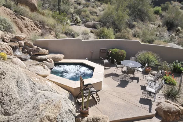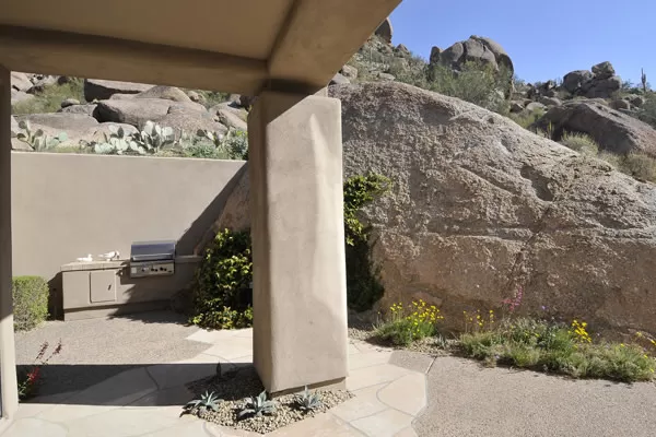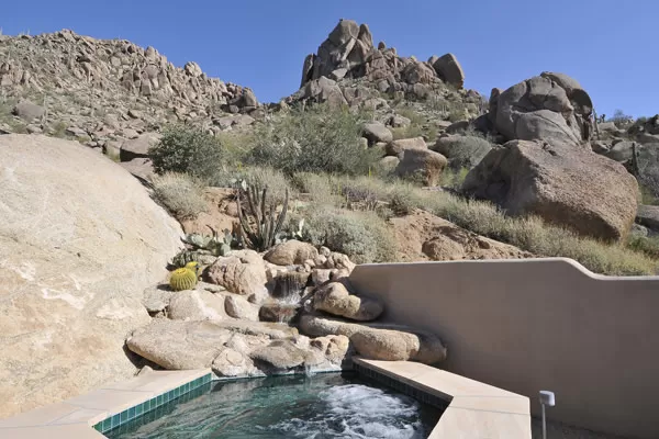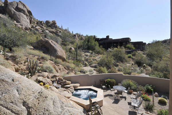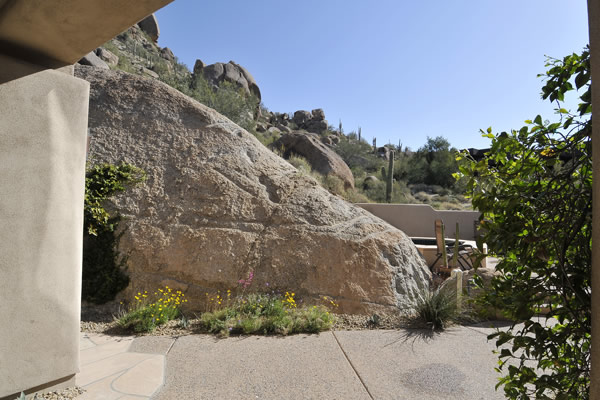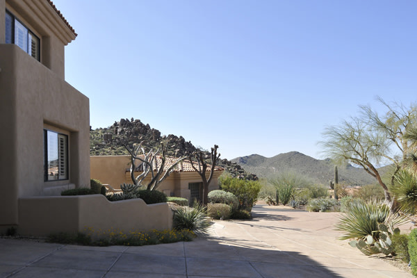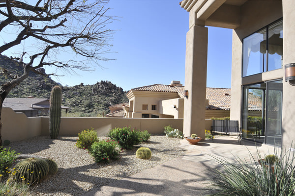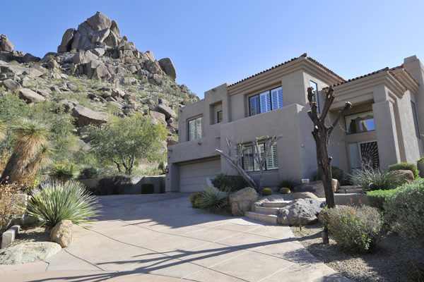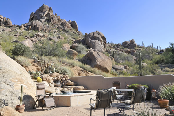 Spectacular setting in Whispering Ridge – home sits at the end of the cul-de-sac on a large lot nestled into Troon Mountain. Some of the most unique & private views in all of Troon. Tranquil large patio has built-in BBQ and waterfall cascading into a spa with Troon Mountain as your backdrop. This is a terrific outdoor space. Upper level features 3 bedrooms including Master with sitting area & large private balcony with the desert floor & Troon Mountain at your fingertips. City light views from guest bedroom. Lower level has an additional bedroom/office. Home features shutters, 3 fireplaces, travertine floors in baths, & granite counters in kitchen & wet bar. Arizona living at its best!
