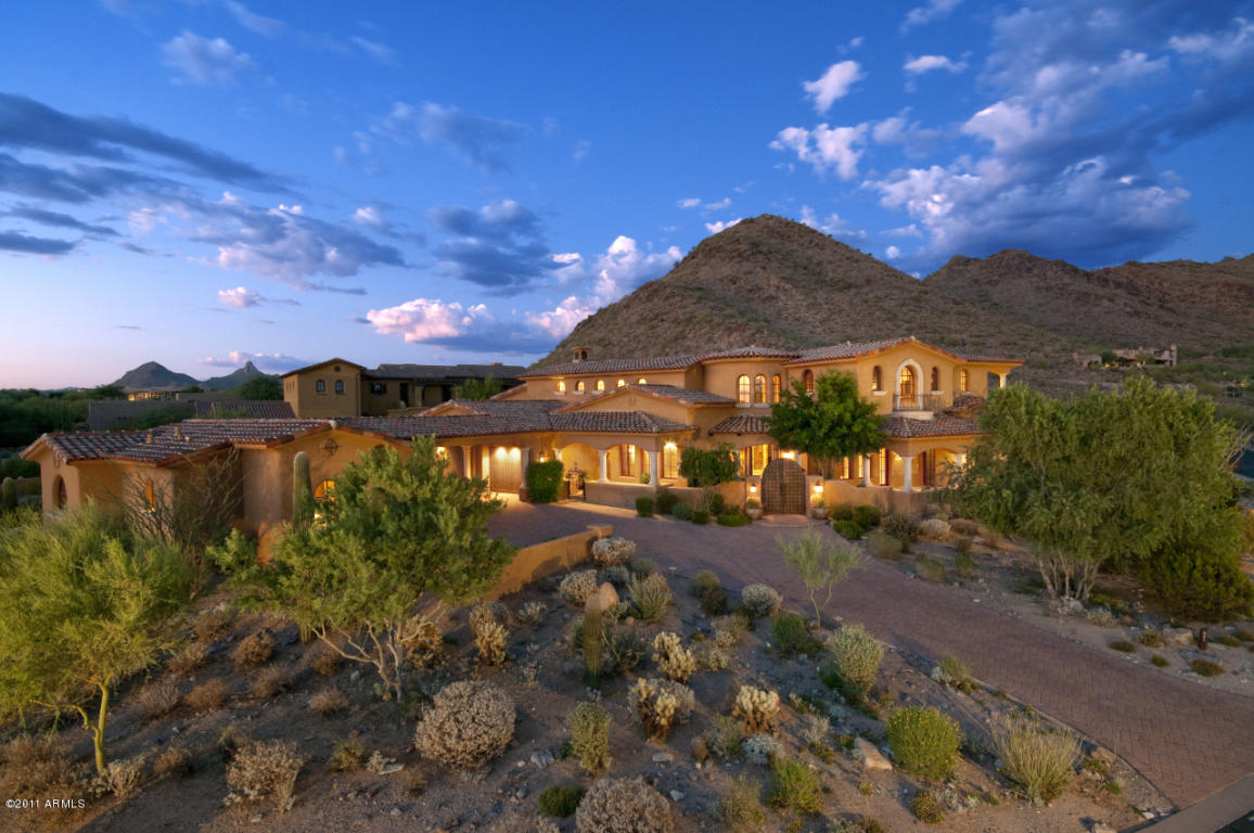Stunning views of the Canyon golf holes at The Country Club at DC Ranch this home also offers enchanting city lights and majestic McDowell Mountain views. Amenities include Oro travertine & antique Oak flooring, canterra accents, gourmet kitchen which opens to a great room, honed granite counters, farmhouse sink, 2 dishwashers, viking fridge, wolf gas range, fireplace, flex room with built in cabinetry leads to secondary bedroom suites. The 2nd level has a large game room with wet bar & office. The backyard oasis features an outdoor living area and kitchen, pool and spa with unique privacy and absolutely incredible views.