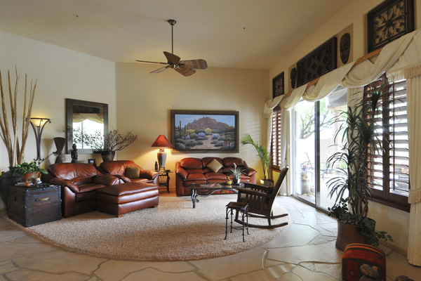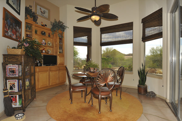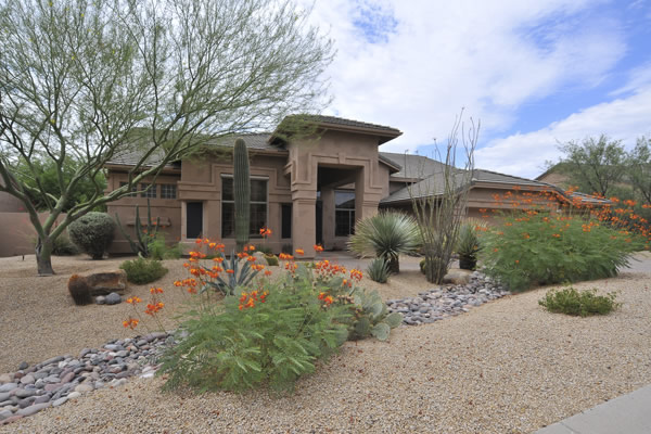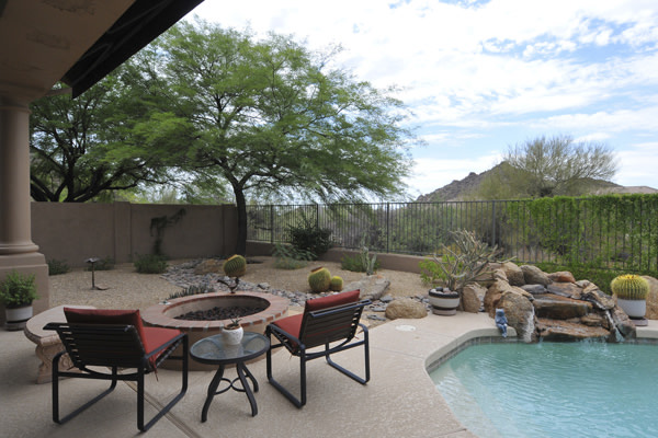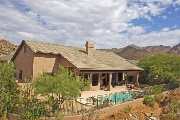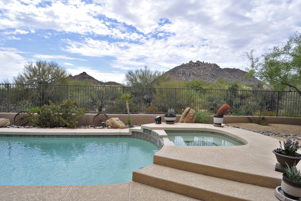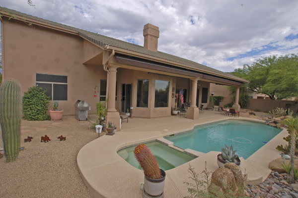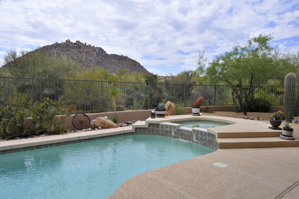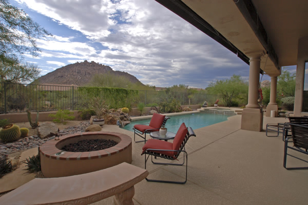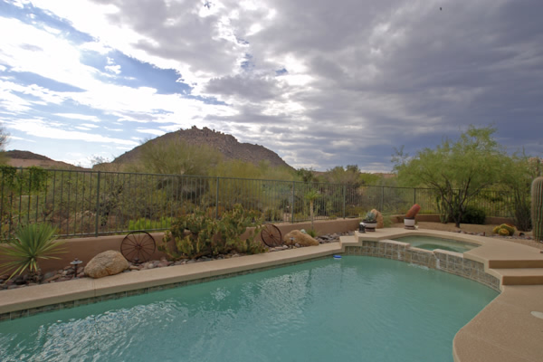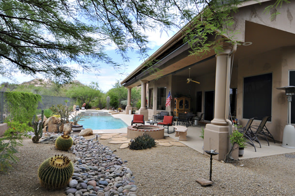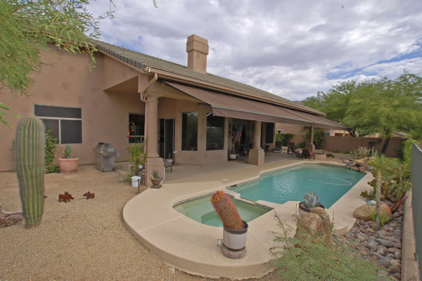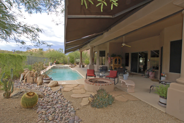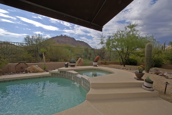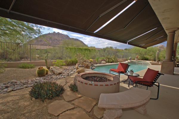 Updated Troon Village home is METICULOUS! Home backs & sides Natural Area Open Space for exceptional views of Troon Mountain from rear & the McDowell Mountains. from the front. Recent upgrades make this home move-in ready! Featuring slab granite counters, marble topped wet bar, Viking 6-burner gas cooktop, SS appliances, pull out shelves, designer light fixtures, & plantation shutters. Expanded stone counters in kitchen & wet bar allow for bar stool seating. Very open split floor plan with high 12′ flat ceilings – Master on one end & guest bedrooms segregated on other end. Spacious 1/4 acre lot provides fabulous outdoor entertaining. Electronic awnings across the entire back of the home- feels like an outdoor living room. Pebble sheen pool, spa, fire pit, & gas line for a BBQ. Two Trane ACs installed in 2009