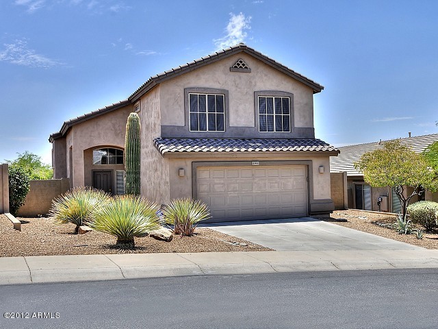 Darling home feels larger than sf. Dramatic Great Rm Floorplan w/double height ceiling & clerestory windows. Sliders to large private yard w/both covered & outdoor patio. Two-tone Paint, Upstairs Bedrooms & Bath Just Painted, Diagonal Ceramic Tile throughout downstairs + all wet areas. Kitchen is exceptionally large with loads of maple cabs, BRAND NEW S/Steel gas range, Built-In Microwave, Dishwasher & Refrig conveys. Breakfast Bar. Slab Granite Countertops + designer chandeliers. 1/2 bath down. Upstairs boasts large master B/R with Mountain & City Light Views, Master Bath Dual Sinks & Maple Vanity and tub/shower combo, lg walk in closet. 2 Bedrooms both have mountain views. R/O, Water Softener, Ceiling Fans. Walk to MMR Amenities, Pool, Tennis, Trails.