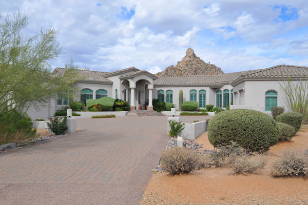 Custom home in Troon Fairways at Troon Village with breathtaking views of Pinnacle Peak from the backyard & Troon Mt views from the front. Brick pavers lead you up to this Ranch style home with Master Suite, Office, & 2 garages on one end and 2 guest bedrooms & 1 car garage on the other end. Spacious Master Suite w/ fireplace & large bath w/ jetted tub. Home features high flat ceilings with a very open & flowing Great Room floor plan. Large Kitchen with double islands opens to Great Room with fireplace & wet bar. Shutters, crown molding, granite counters, & Dacor double ovens. Minutes away from Pinnacle Peak Park, Four Seasons, & Troon Country Club.