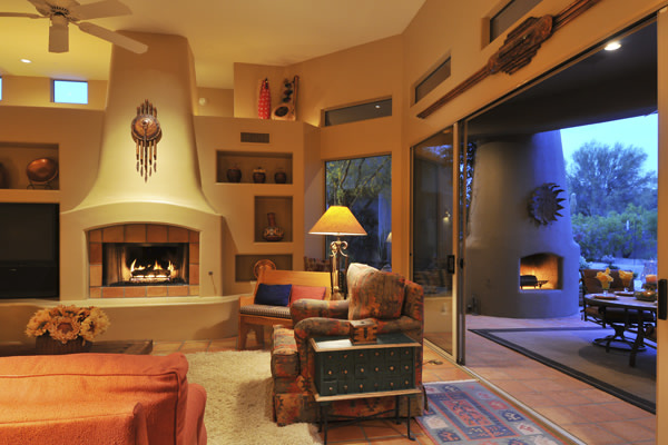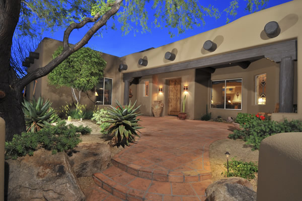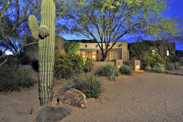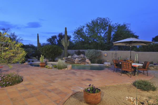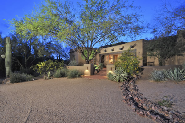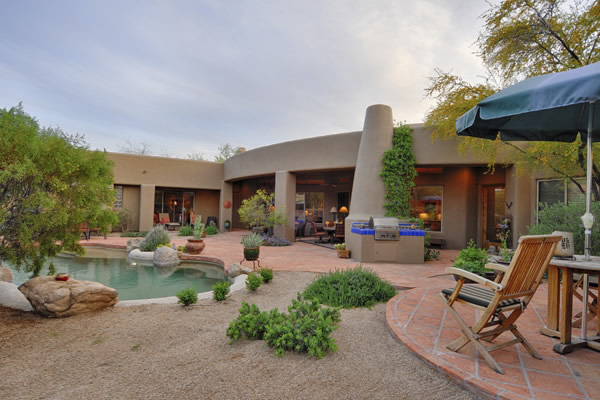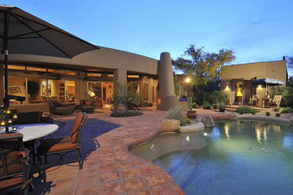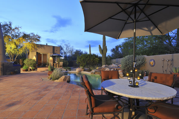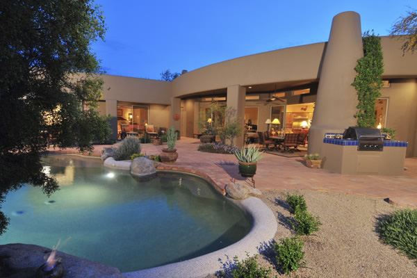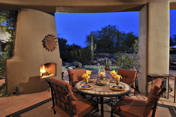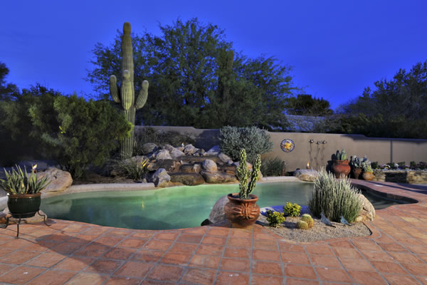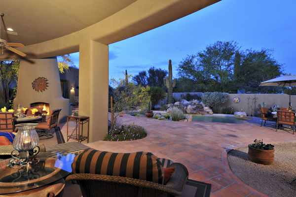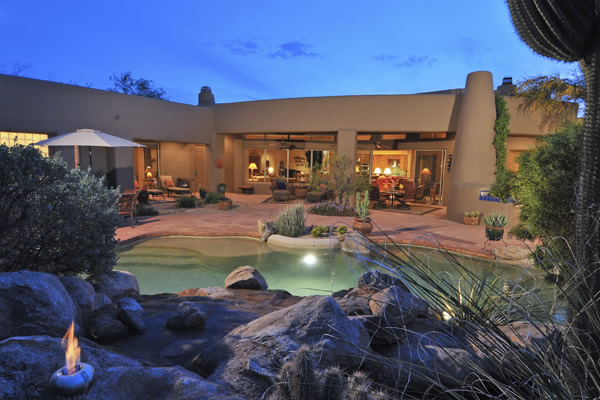 Weldon Minchew Custom Home in gated Pinnacle Peak Estates II sits on a beautiful one acre lot with lush desert landscaping & large saguaros. 3 large fireplaces provide special gathering places with an ambiance & warmth found in few homes. Very open floor plan with high flat ceilings flows from main living area directly into the Kitchen & Family room. Spacious kitchen is great for entertaining & cooking with large island, granite counters, S/S appliances, wine fridge, pull out drawers, & walk-in pantry. Enjoy incredible outdoor living with 1,000 sf of covered patios overlooking a heated Pebble-Tec pool, water feature, reverse Saltillo tile, BBQ & fireplace. Total of 4 bedrooms all with private baths (including detached guest casita), office, 3rd garage is air conditioned & used as a work/exercise room. Quiet cul-de sac