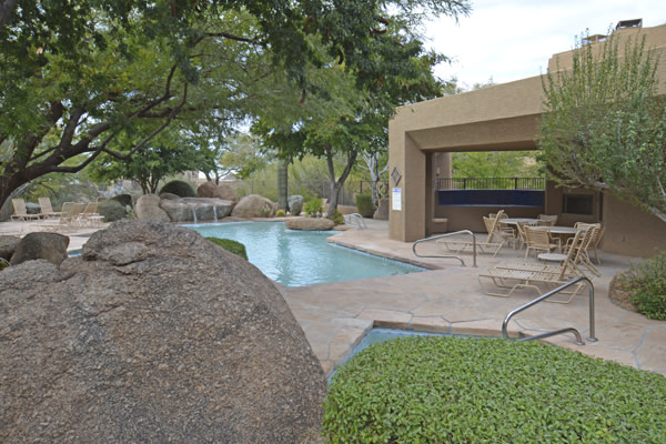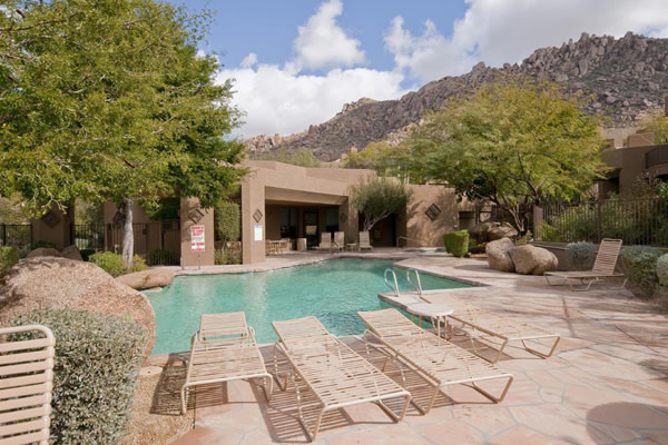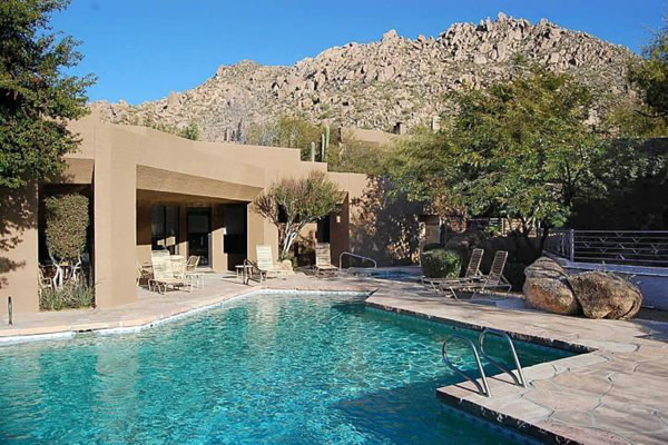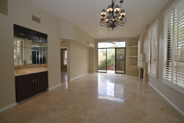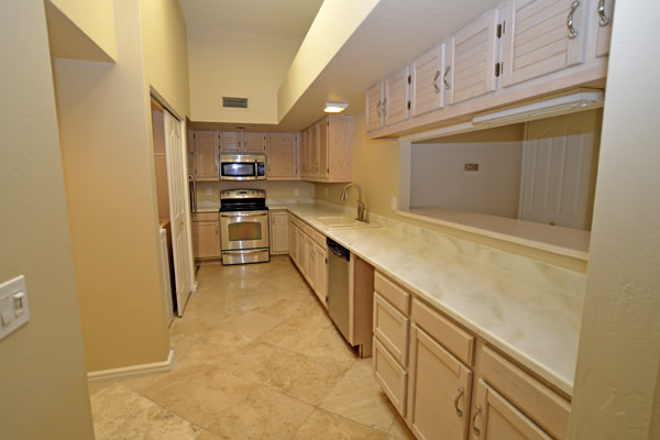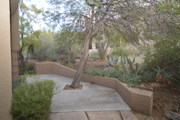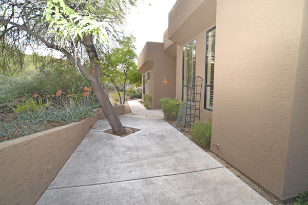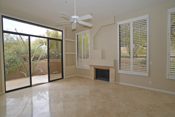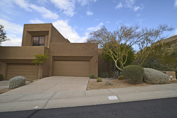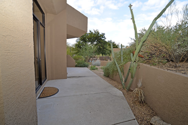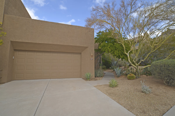 Two bedroom, two bath end unit townhome inside Guard Gated community of Windy Walk at Troon Village. Great room floor plan with fireplace. Master and guest bedrooms are spilt on either side of the home. All on one level with no interior steps. Two car garage opens into your kitchen area. Wrap around patio that sides and backs to open space for extra privacy. Travertine flooring and newer paint. Close to Community pool allowing easy access to heated pool, spa, and work out facilities. Troon Country Club is walking distance away – social and golf memberships available.