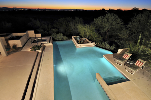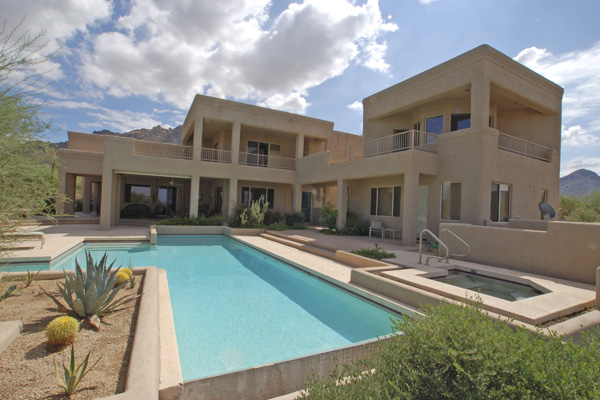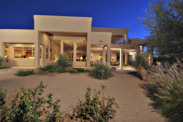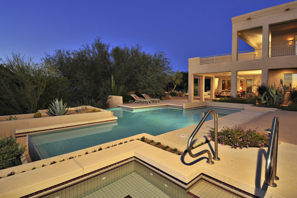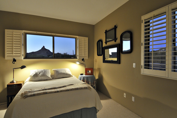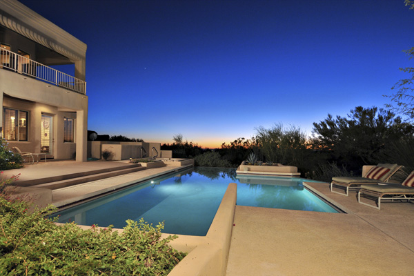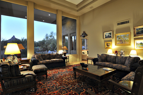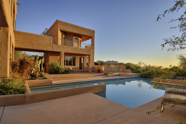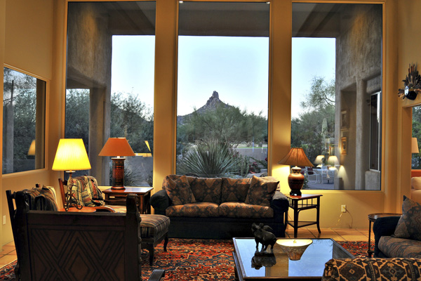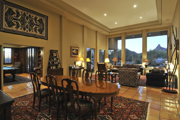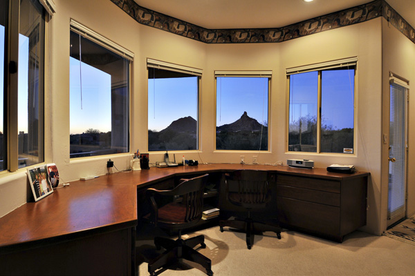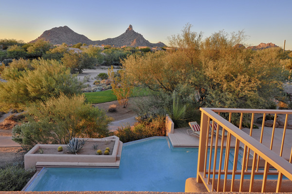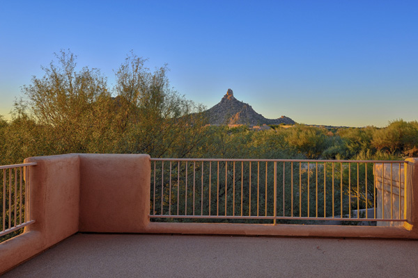Located on the 10th Tee of Troon Country Club with incredible views in all directions: 10th fairway, Pinnacle Peak, Troon Mountain, & city light views. Pinnacle Peak is perfectly framed as you enter the home’s dramatic living room with soaring ceilings. Separate 2-story guesthouse with upstairs office has a panoramic bird’s eye view of the valley. Owners retreat upstairs with separate sitting area, fireplace, & large viewing deck. Mother-in-law suite downstairs. Renovated in 2006 – featuring an inviting kitchen with cozy fireplace, bar with subzero wine chiller open to dining room. 1.52-acre lot offers great outdoor living with dramatic 45′ negative edge pool and heated spa. Space for an elevator, 52 owned solar panels, & lots of storage. Great potential!