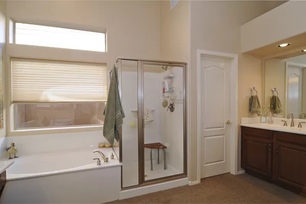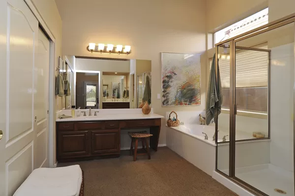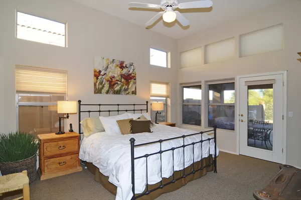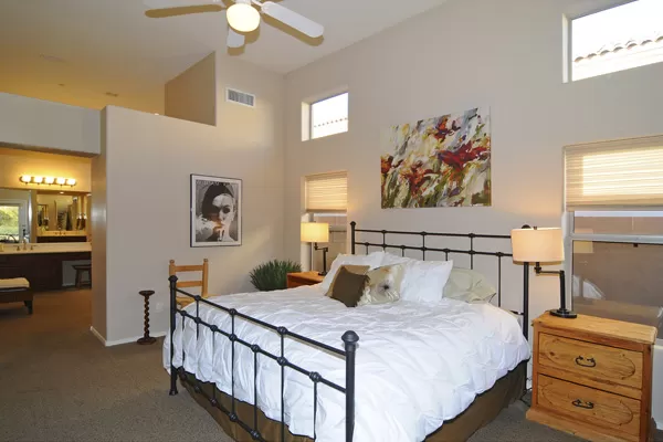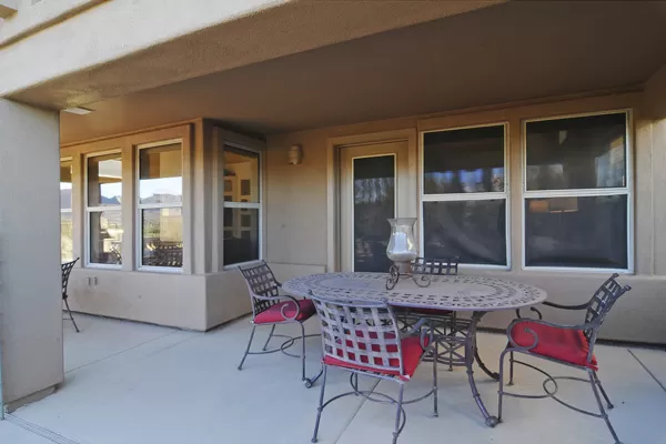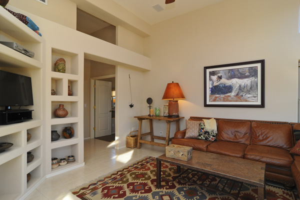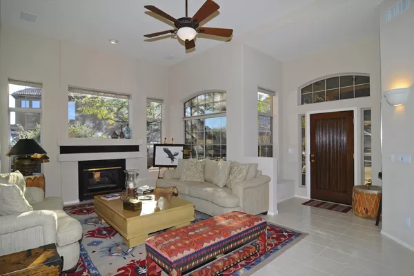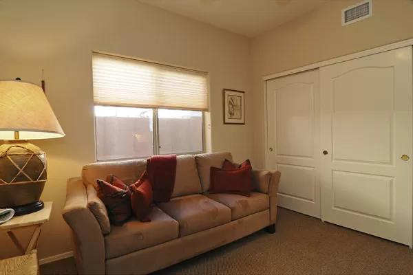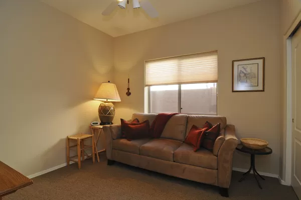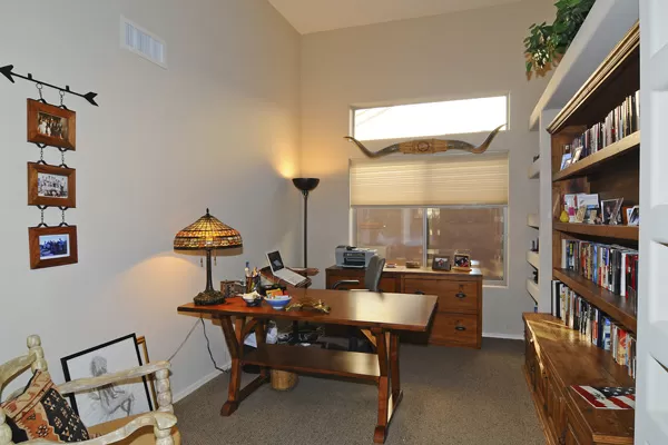 Soothing water feature in backyard and heated spa. Interior features: 10 flat ceilings, 2 bedroom +den, living/dining combo with gas fireplace in living room. Some furnishings available by Separate Bill of Sale.