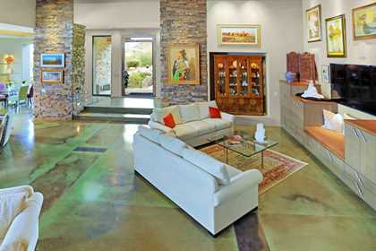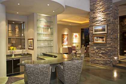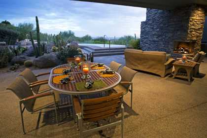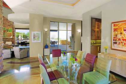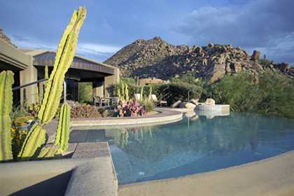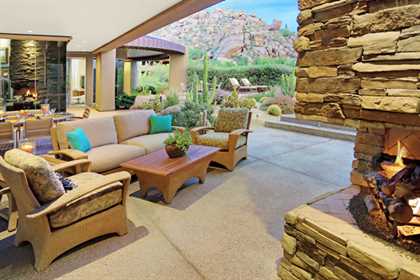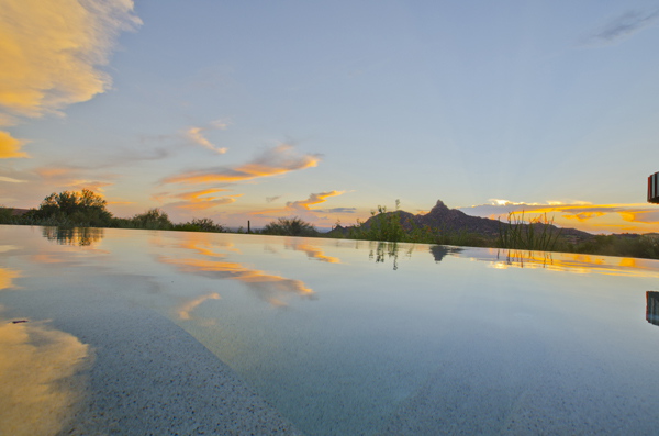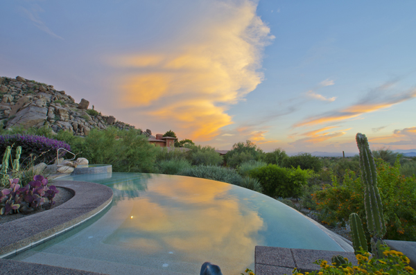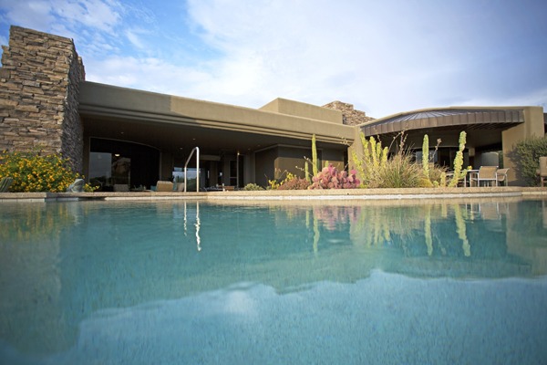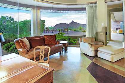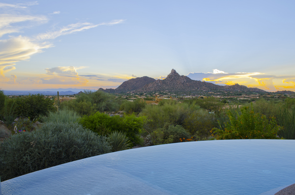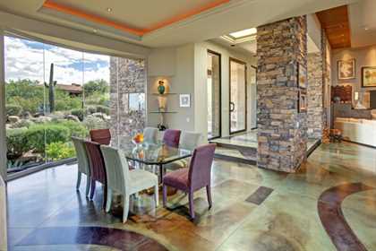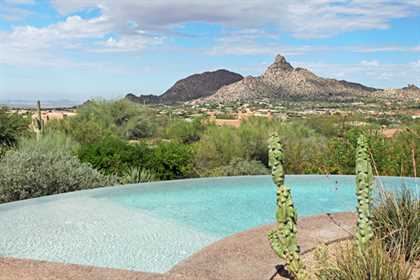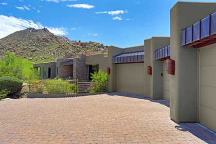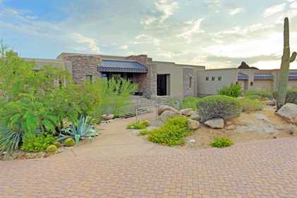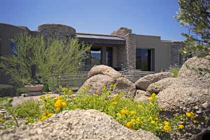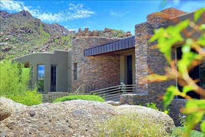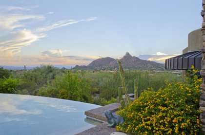 This home sets a new standard of living with impressive architectural detail in Windy Walk Estates. This approximately 6000 square foot livable soft Southwest Contemporary has curvi-linear walls of glass and stone capturing commanding panoramic views of city lights, sunsets, and dramatic landmarks, Troon Mountain and Pinnacle Peak Mountain. Exceptional quality throughout with Low Voltage lighting, stacked stone veneer columns and walls, wood ceilings, and the best Kitchen ever created! Its’ amenities are a Chef’s Prep & Baking Center, Butler Pantry and Island Dining and seating, corner fireplace, custom swivel entertainment center, stainless appliances, walk in wine chill room and pantry and easy access to family, friends and guests. The outdoor Kitchen is seamless for the ultimate in entertaining. The Arizona ‘Room’ lends an almost tropical feel as lush, colorful landscape wraps around an extensive covered patio with one of 6 charming fireplaces and Built in Patio gas heaters and misting system that provide ambient temperature year round. Look across a gorgeous heated infinity edge pool and spa that reflects the colors of the Arizona skyline like a mirror. Truly inviting, this one of a kind treasure is sure to delight home owners!