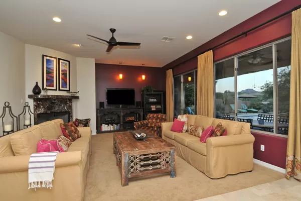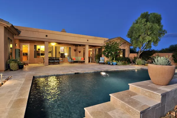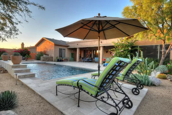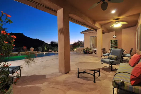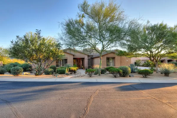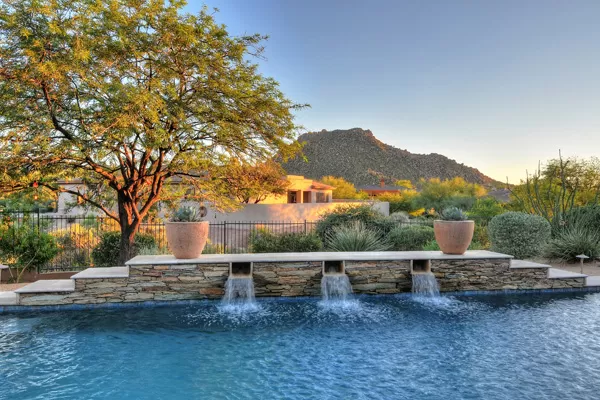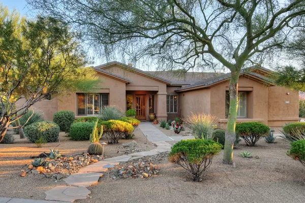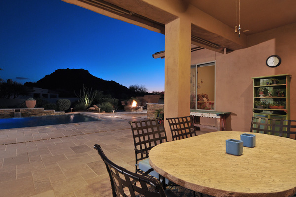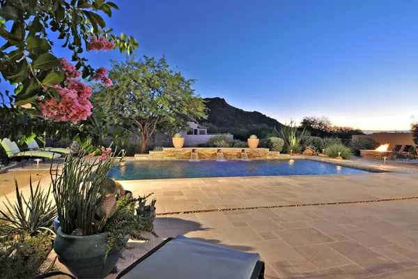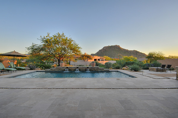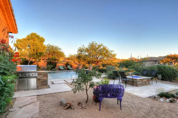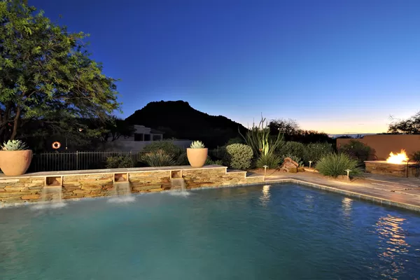 Set in the heart of Troon, this remodeled single level home is spectacular: travertine and wood flooring in living spaces, formal living and dining rooms; updated kitchen with stainless steel appliances including a gas range, dinette area, and island with breakfast bar open to spacious family room with built-in bar area, fireplace with marble surround, and wall of windows framing a breathtaking view of Troon Mountain; split master wing has updated bathroom, walk-in closet, access to patio, and adjacent office; 2 additional bedrooms share a bath with private vanity areas, plus a fourth bedroom with adjacent bath; and no interior steps. The oversized yard is exquisitely designed with a fire pit seating area, covered patio, cooking station, and pool with water featuReswith Troon Mountain as the centerpiece to create an impactful WOW factor.