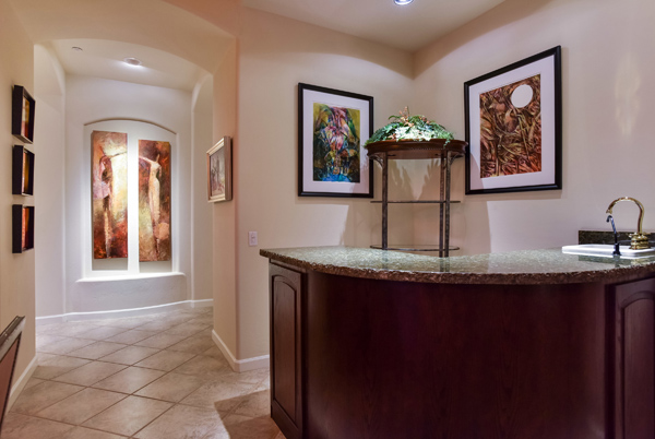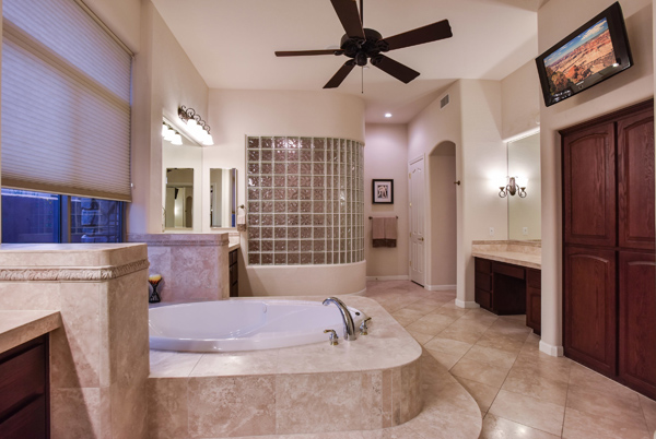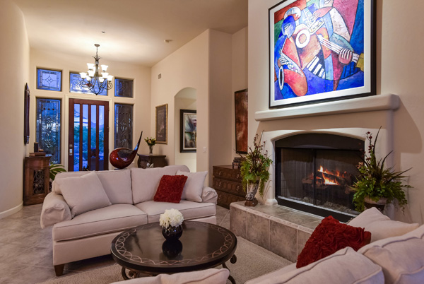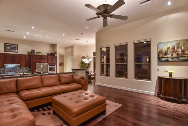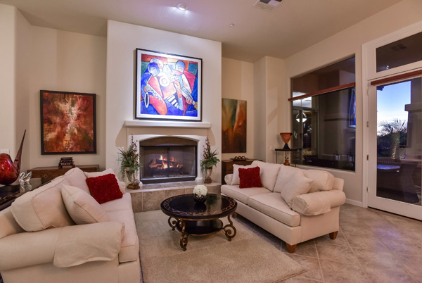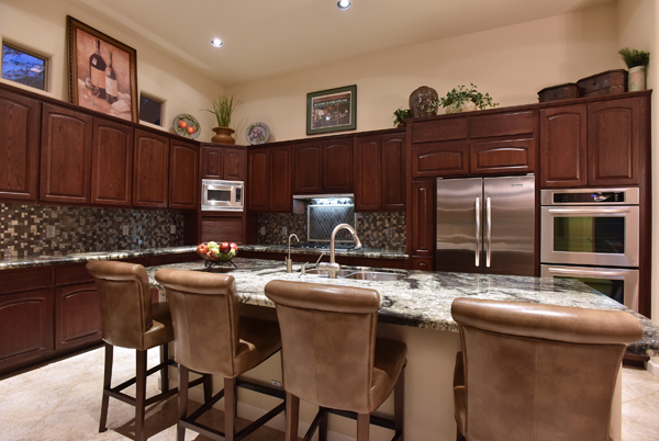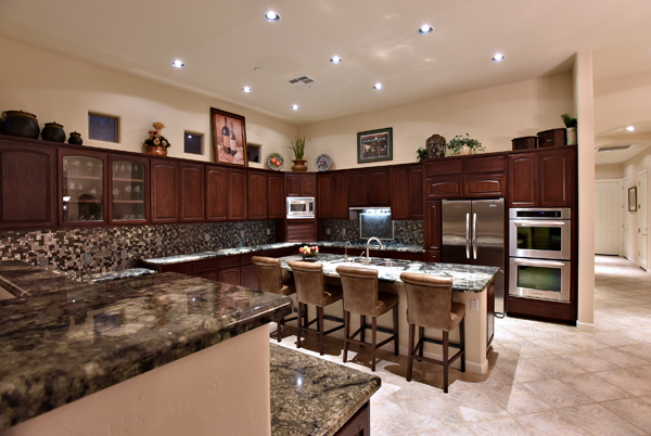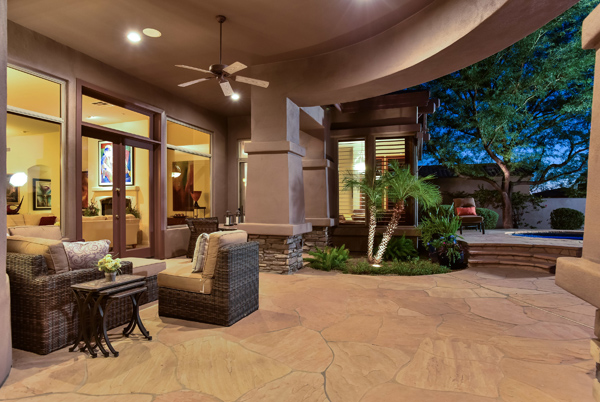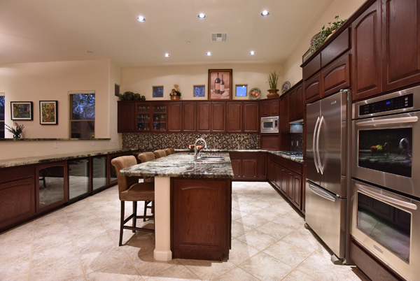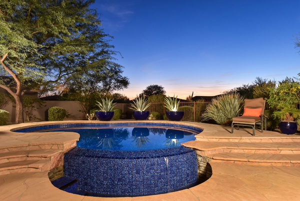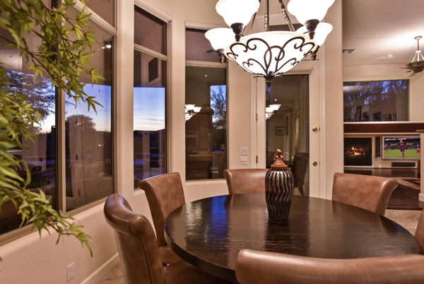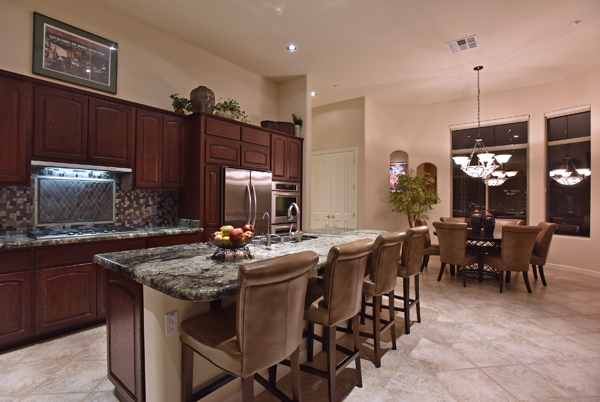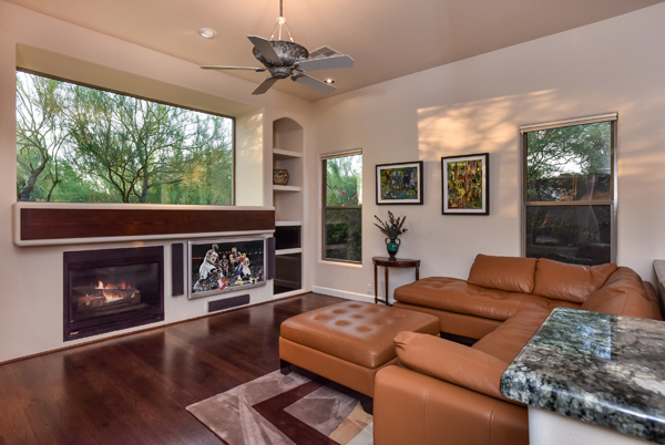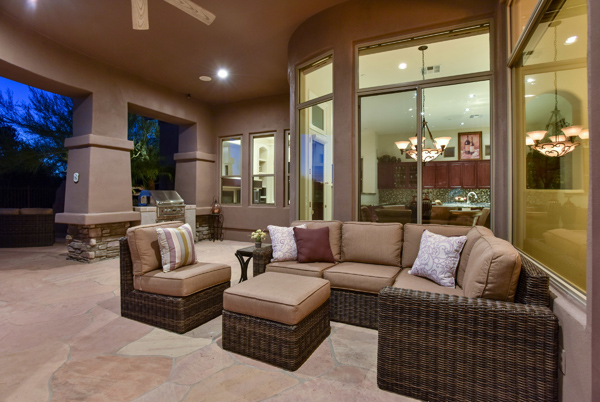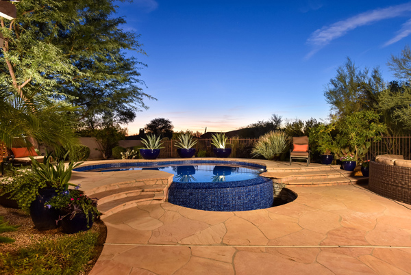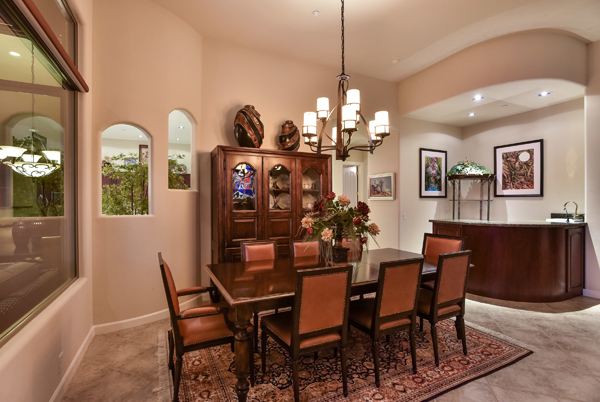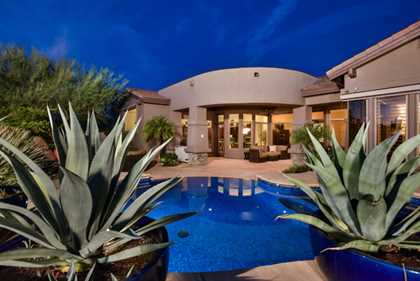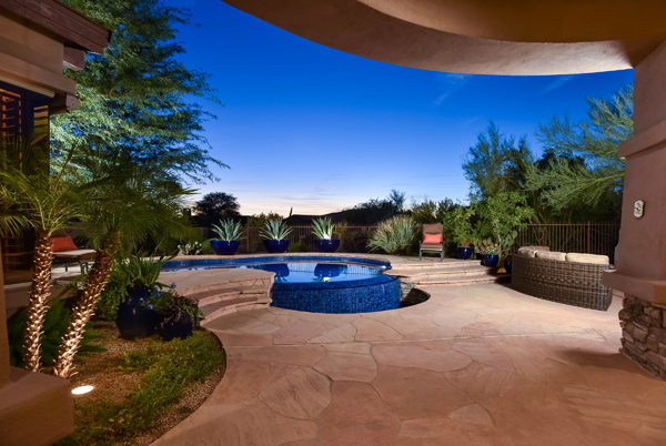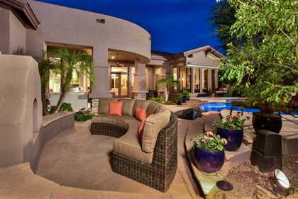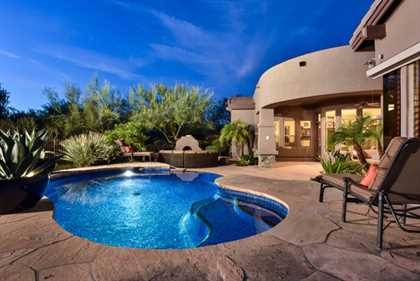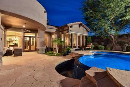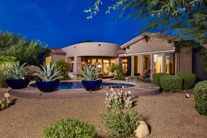 Located on a private cul-de-sac in the desirable DC Ranch Country Club this 3 bedroom plus office, 3.5 bath home offers beautiful upgrades. The kitchen has gorgeous granite counters and tile backsplash, two wine refrigerators, wine cabinets, endless counter space, 6-burner gas cooktop, Eat-in Island, stainless steel appliances and cherry finish cabinetry. The kitchen opens to the family room with hardwood floors, wood beam mantle, fireplace, shelving and access to the backyard through the French doors. Outside the lot backs to a wash with mature vegetation and fantastic sunset views. The heated pool draws the eye with sparkling glass tile, negative edge waterfall, fireplace with sitting area and flagstone decking completes the serene backyard. The open floor plan featuResa large master suite with sitting area and spacious master bath; welcoming entry, living and dining spaces with wet bar, ceramic tile floors, dual a/c, 3 car garage, and exterior stacked stone accents.