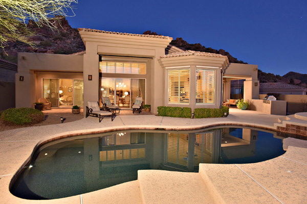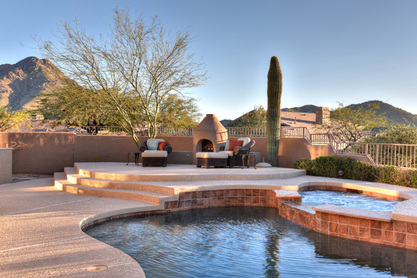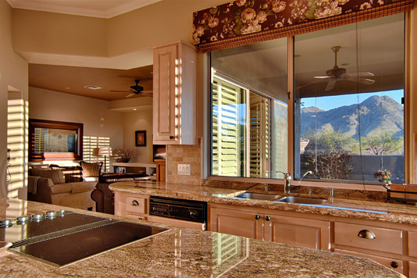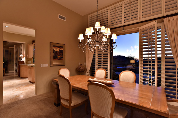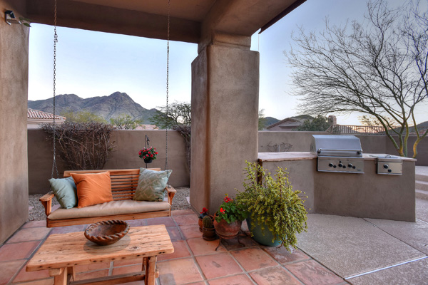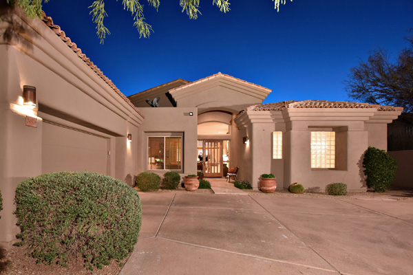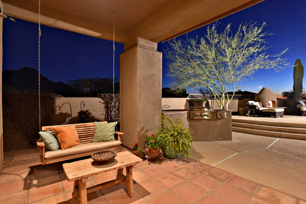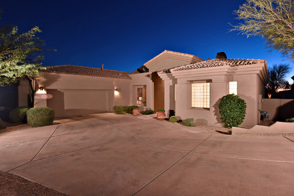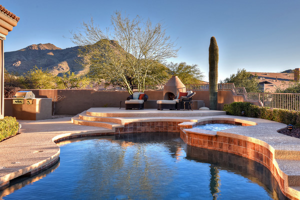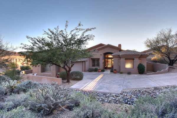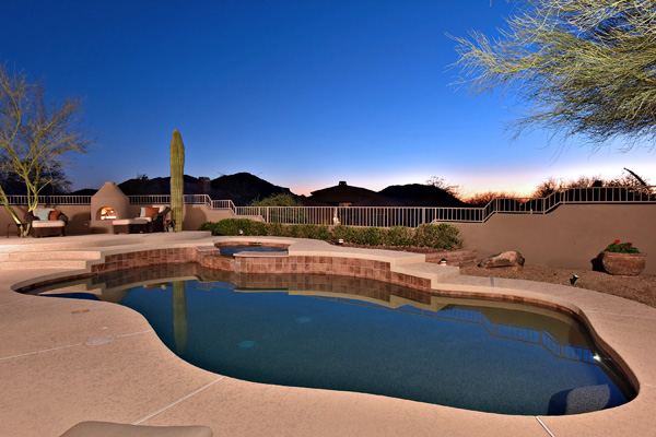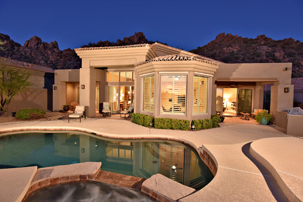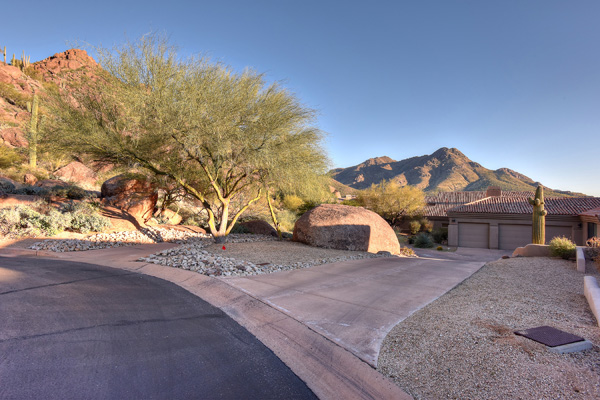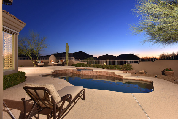 On the summit of gated Quail Ridge, stunning villa style home offers elevated views of Pinnacle Peak, McDowell and Troon Mountain, and valley. Single level floor plan with no interior steps, rare in this neighborhood, provides formal great room adjoined to family/media room by a dual accessed bar area to create seamless living spaces that can only be appreciated in person. Interior highlights include stacked stone fireplace, tumbled stone kitchen backsplash, granite slab counters, travertine baths and flooring, plantation shutters, and high ceilings; deluxe master featuResprivate patio and spa like bath with dual vanities and water closets plus dual walk-in closets; 2 additional bedrooms share jack-n-jill bath; exec office; and guest bath. Outside, carefully thought out living spaces frame exceptional views including adobe style fireplace, pool, spa, cooking station, and covered patio. Natural gas to home.