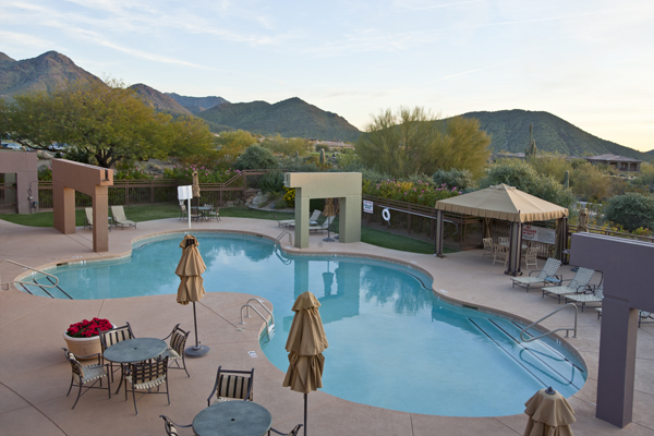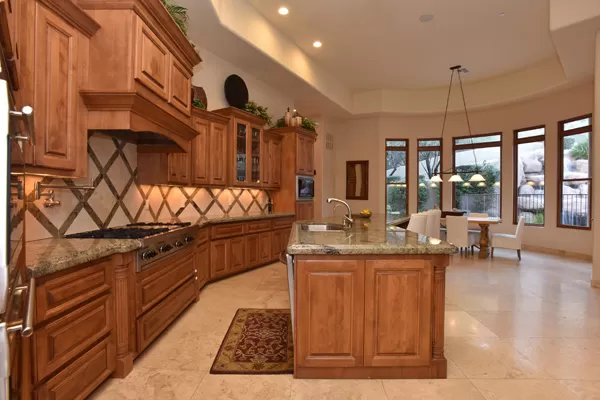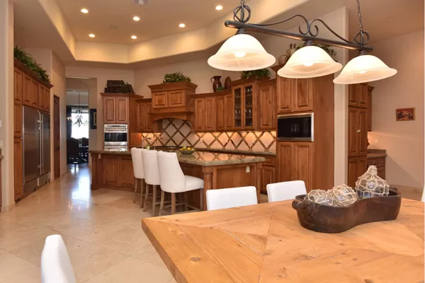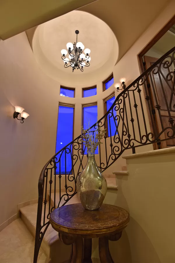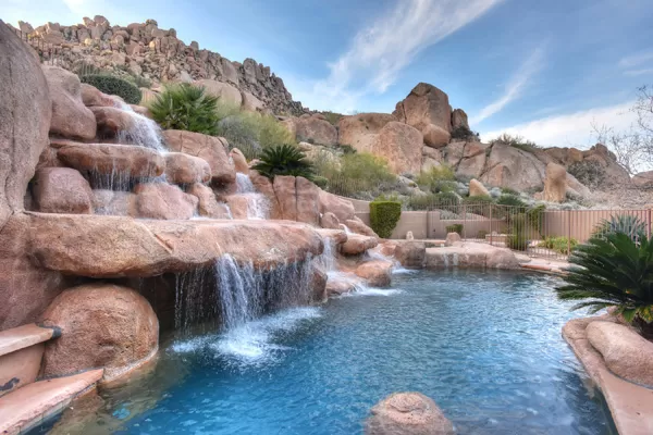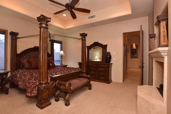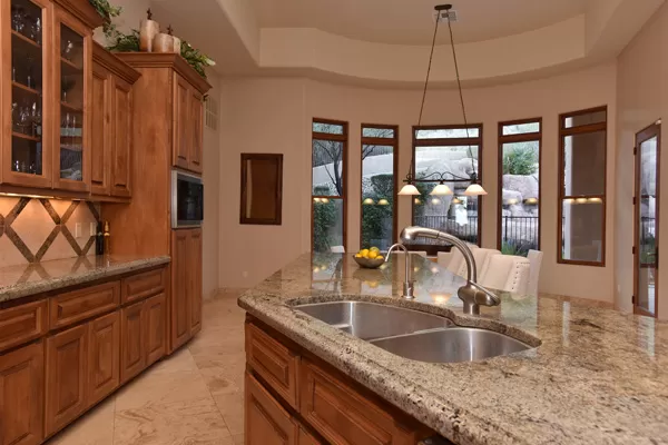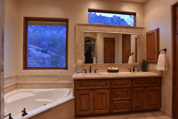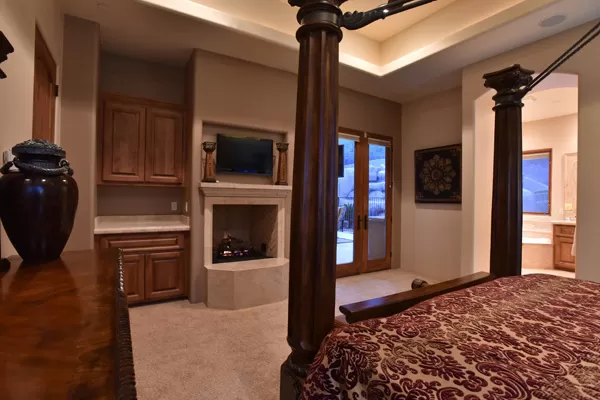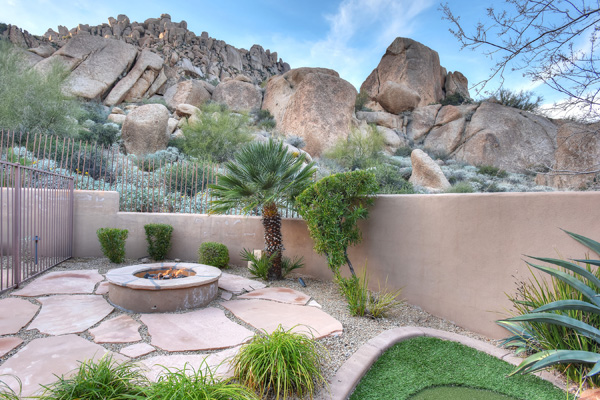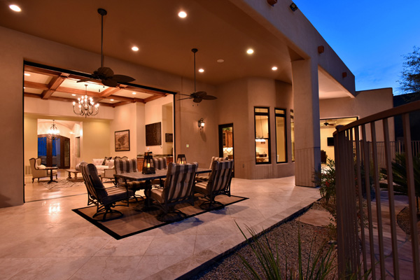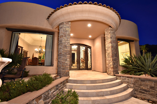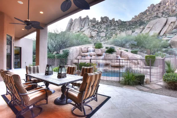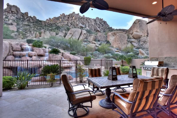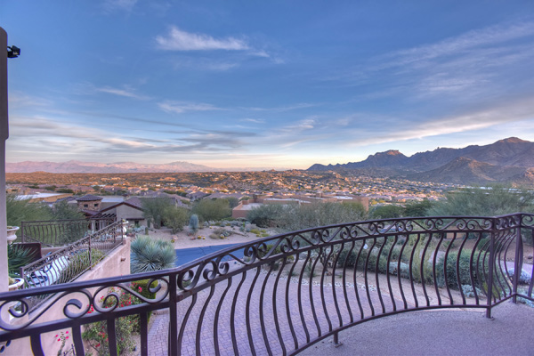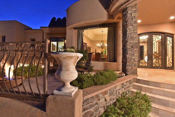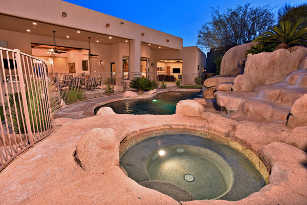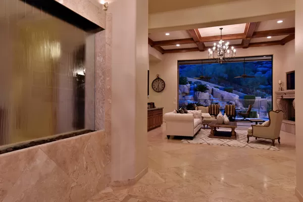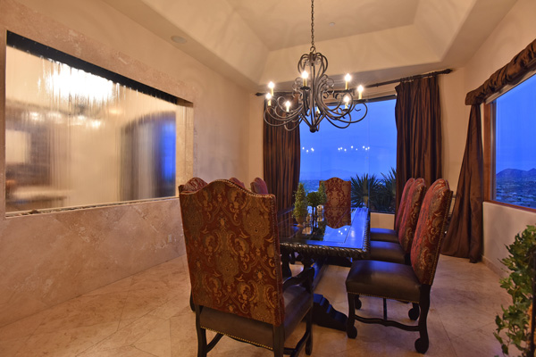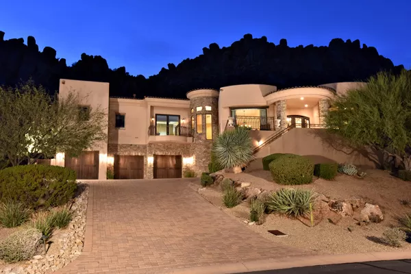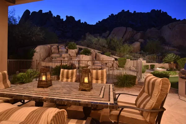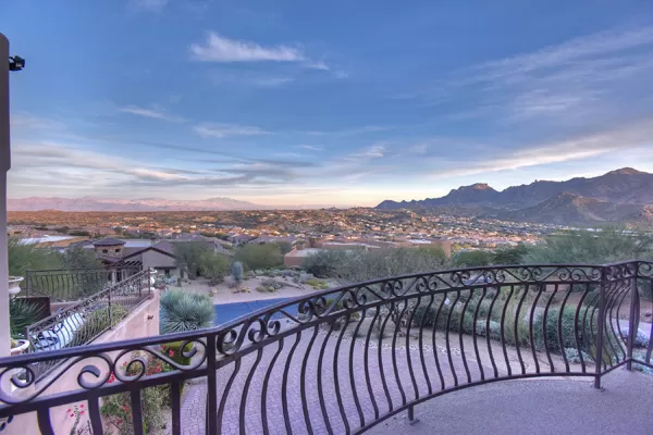 Offering some of the most dramatic views in Troon, this Tuscan residence is designed to embrace its hillside setting. 18 inch travertine tile, cantera fireplaces, butted windows, retractable glass walls and wood beamed ceilings highlight the living spaces. Formal living and dining rooms with water wall feature plus family/bonus room with bar area and full size wine fridge; eat-in kitchen with designer backsplash, island/breakfast bar, dining area, and SS appliances including hooded 8 gas burner range; master suite with private patio and luxurious bath area; guest suite with private bath and fireplace plus additional bedroom; office with private bath and patio; main floor featuResliving spaces, master and office. The backyard sets this property apart, blending harmoniously with Troon Mountains natural boulders by featuring a flagstone deck surrounding a sparkling pool complete with its own boulder water feature; spa; covered travertine patio featuring outdoor TV and cooking station, and private putting green. This home will wow inside and out with views leaving you breathless!