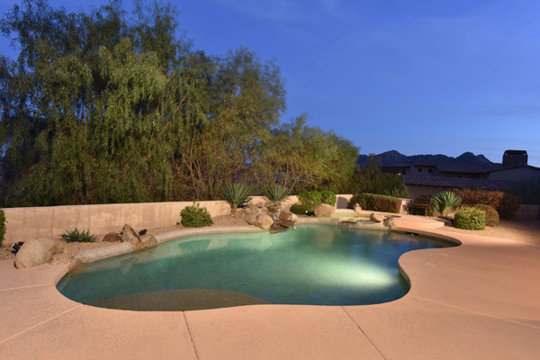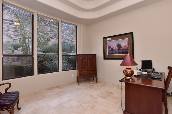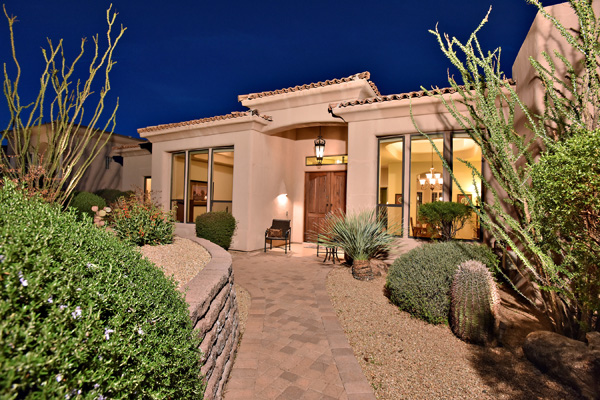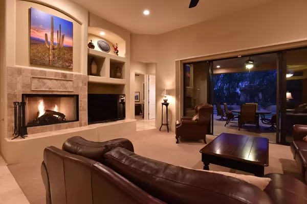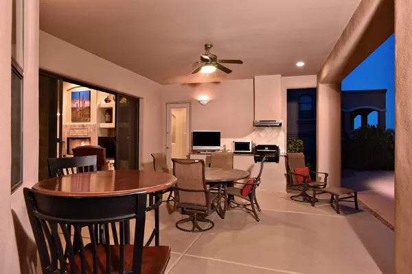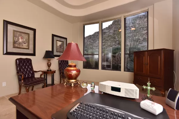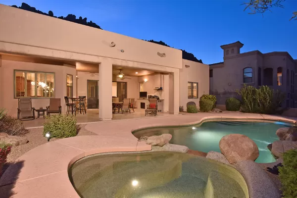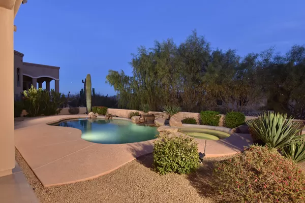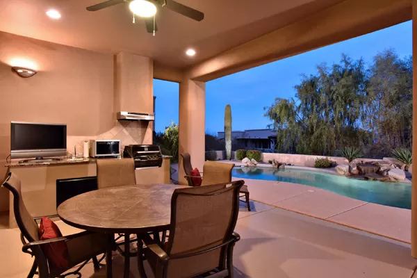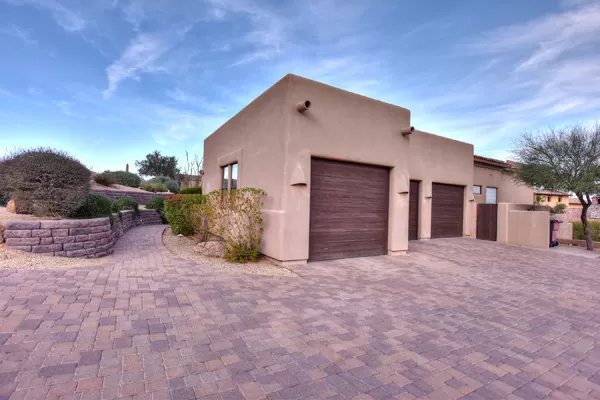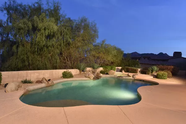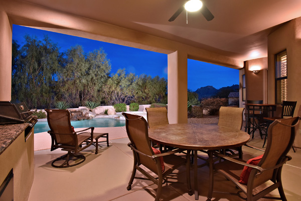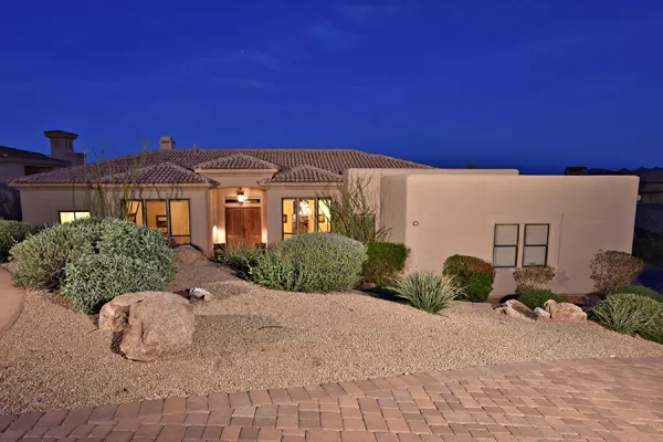 This Troon residence offers the best of indoor/outdoor living for which Scottsdale is renowned. Open floor plan expands to the outdoors with retractable doors to the expansive covered patio complete with media and cooking station plus room for both dining and seating. Backyard also includes heated pebble tec pool and spa, landscape, and view corridors of the McDowell Mtns. Inside, the open kitchen/ family room provides a gathering space w/ media center, fireplace, breakfast nook, upgraded appliances including gas range, alder cabinets, and granite slab counters plus an adjacent formal dining room. Master Suite has its own fireplace and seating area, plus travertine finished bath. There are 3 additional bedrooms plus an office. Additional featuResinclude travertine tile flooring and baths, neutral carpet, high ceilings, dramatic views of Troon framed from the front of home; private cul-de sac location; and guard gated community.