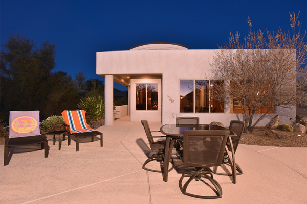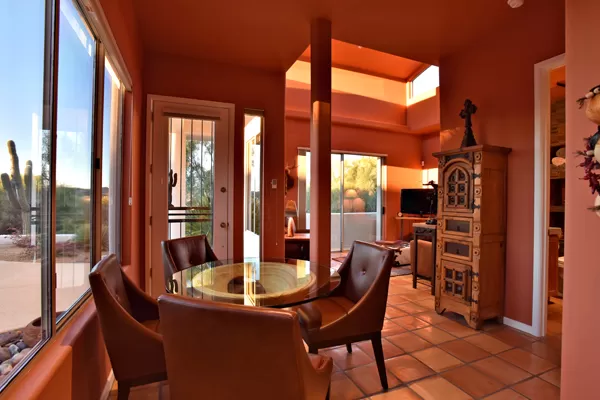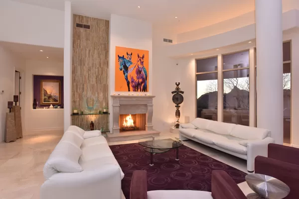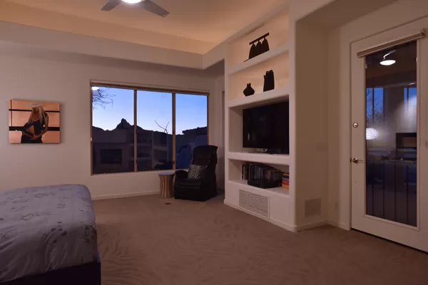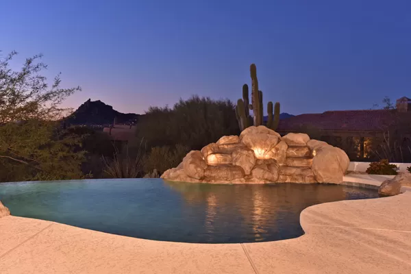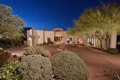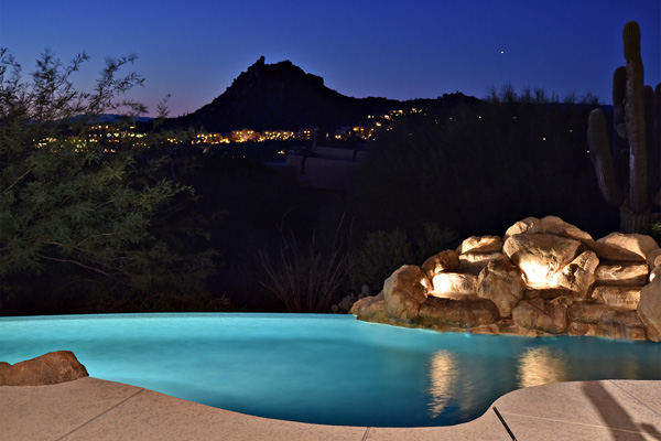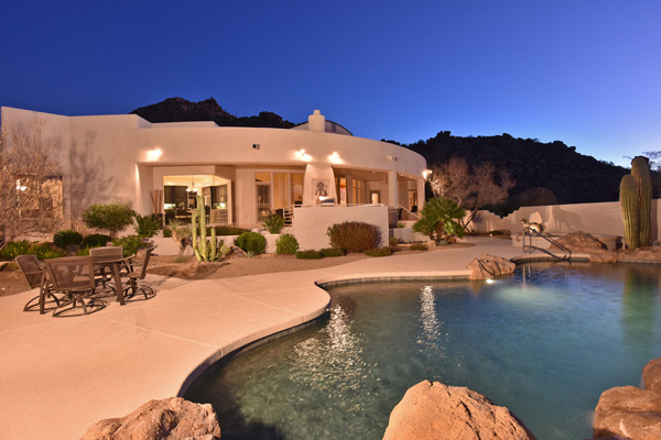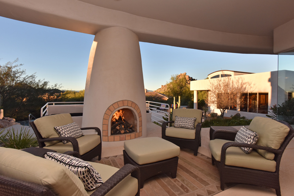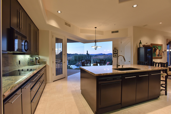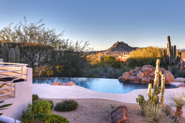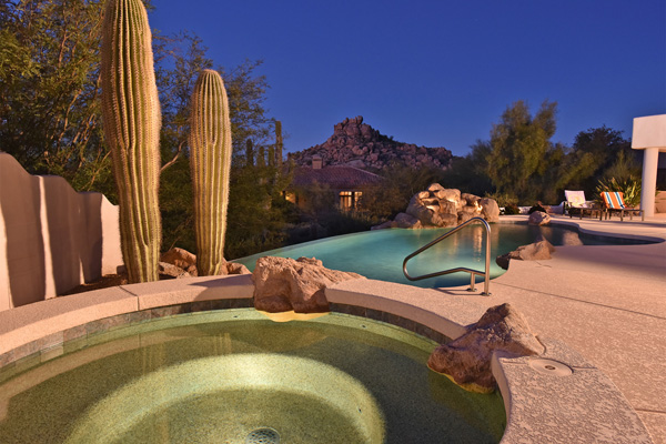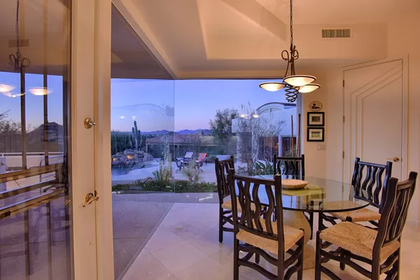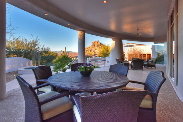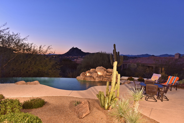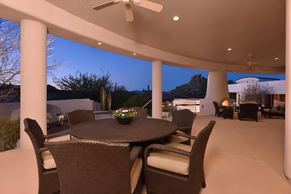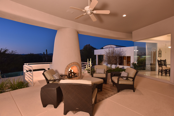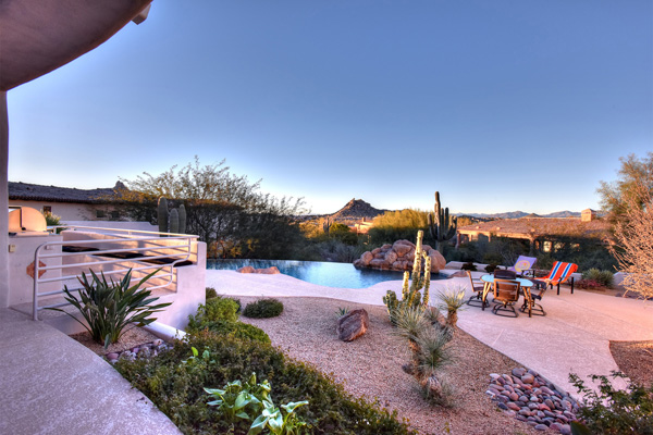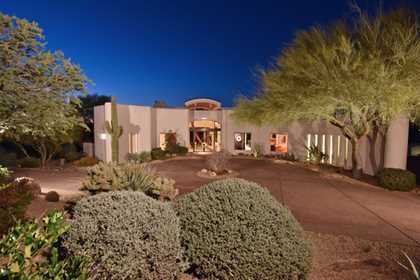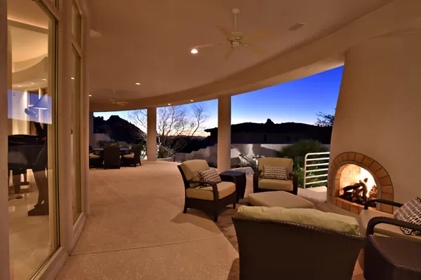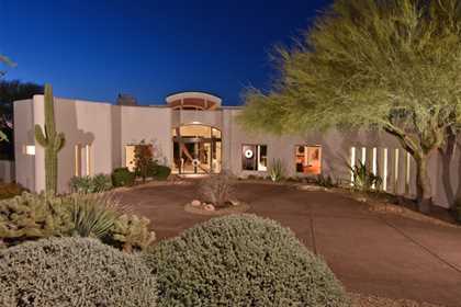 Spectacular views and clean line architecture combine to create this impressive residence in guard gated Troon Village. Formal great room is a showstopper with floor to ceiling windows almost 2 stories high framing expansive views in all directions; eat-in kitchen design is on trend with newer sleek cabinetry and appliances to seamlessly blend including island counter wine fridge; adjacent family room with fireplace; all areas featuring butted glass to maximize views; master suite fully appointed plus separate office; additional bedrooms with private baths plus a TRUEguest casita with private bath and kitchenette. ASID award winning den featured in Phoenix Homes and Garden. Elevated location provides privacy as well as mountain and city light views throughout. The expansive covered patio wraps the entire back facade offering year round enjoyment with a wood burning fireplace, built-in fans, and multi-use space for seating and dining. A dramatic spa and negative edge pool with boulder accents perfectly aligned with Pinnacle Peak create an enduring hallmark for the home.