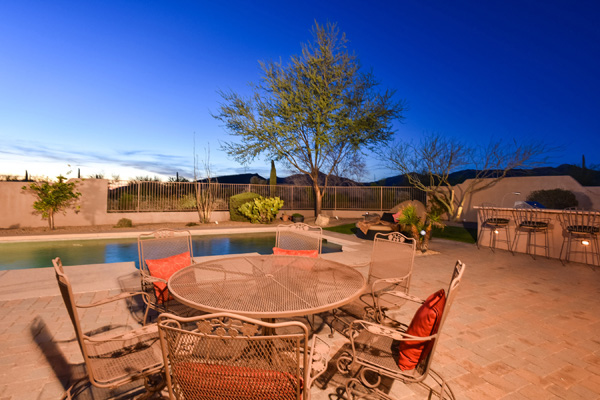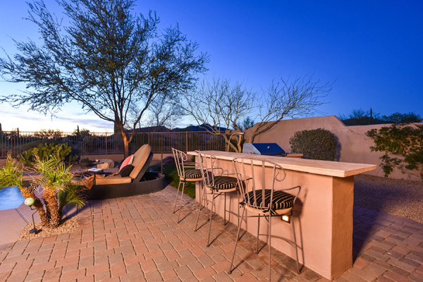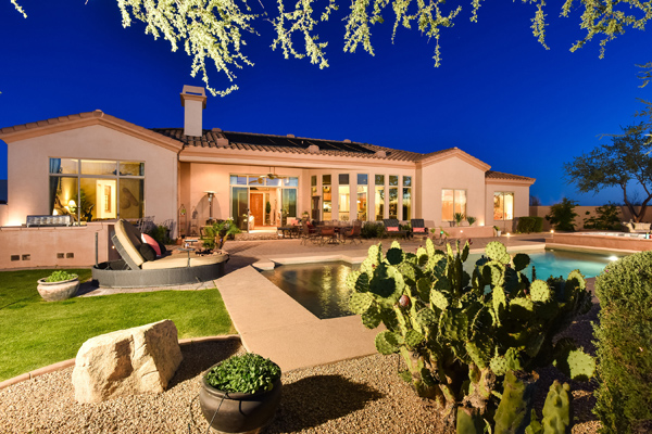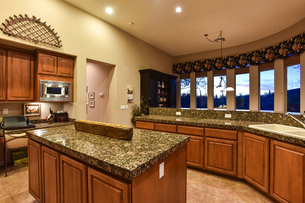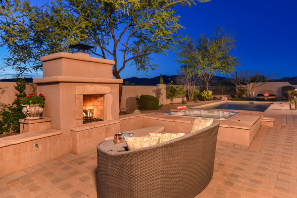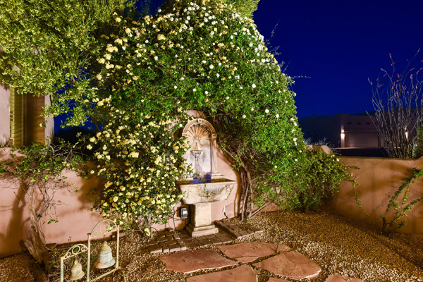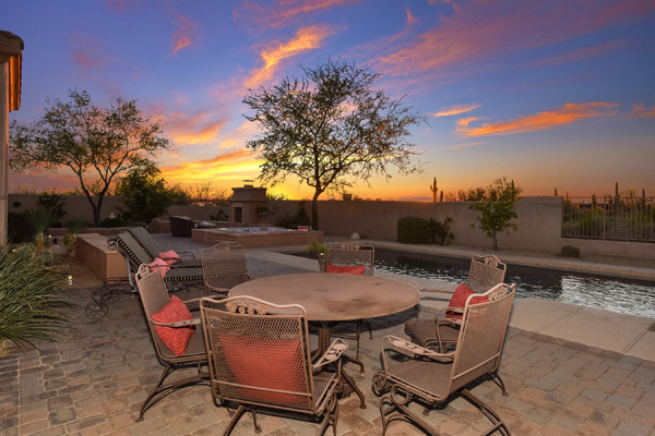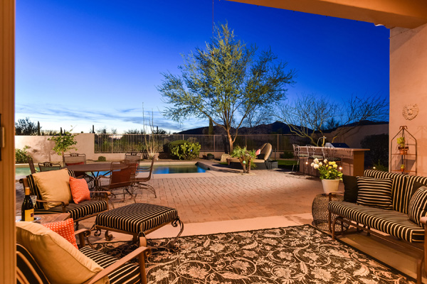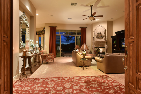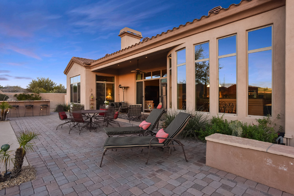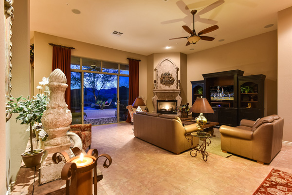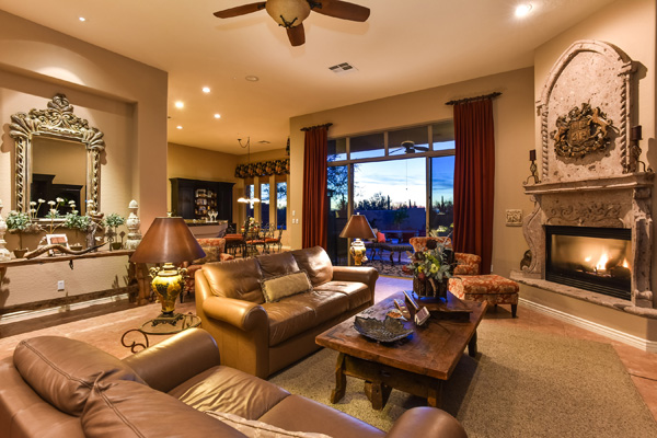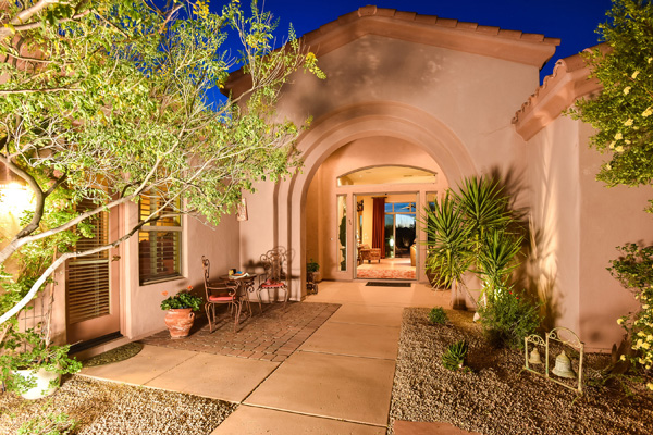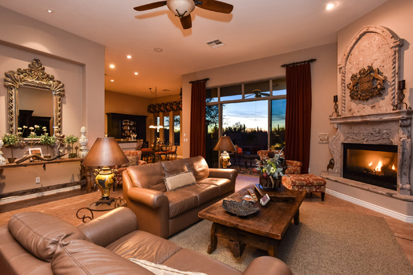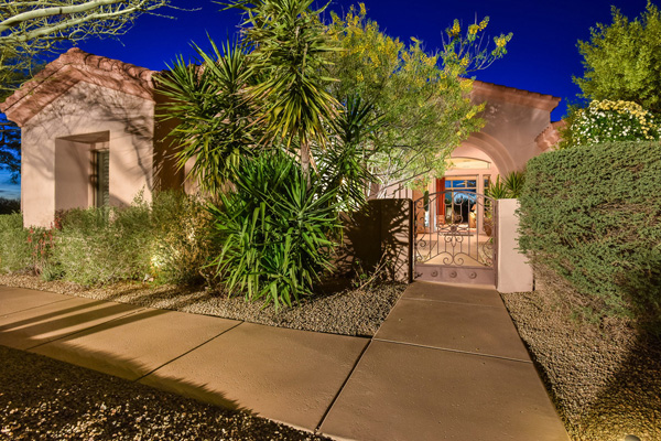 In the gated Cresta Norte, this home begins on a 1.52 acre lot in a private cul-de-sac and oriented to enjoy dramatic mountain vistas and sunset views year round. Three bedrooms plus office with library shelving. A desirable attached casita offers privacy for guests; Master suite is split. A lavish outdoor living area stuns with its covered patio, seating with exterior fireplace, cooking station with dining bar, paver decking for additional lounge and dining areas, desert garden beds, grass lawn, and heated pool and spa. Inside, open great room plan has flowing living spaces with high ceilings, tile and wood flooring, walls of windows and retractable doors framing views. Open eat-in kitchen has breakfast bar, stainless steel appliances including hooded gas range, granite counters, and dining nook. Tastefully appointed and sure to impress!