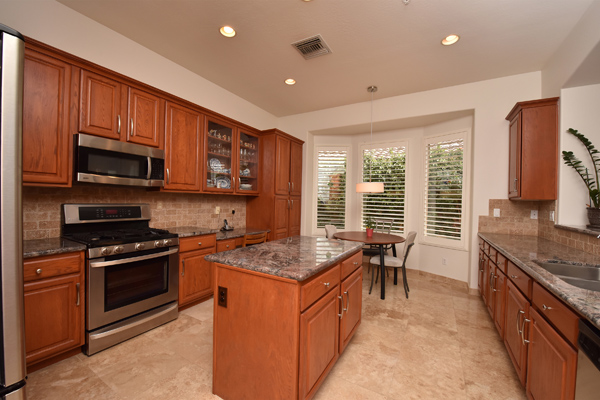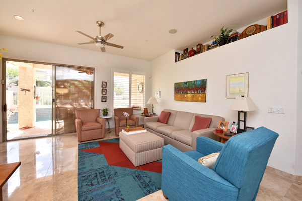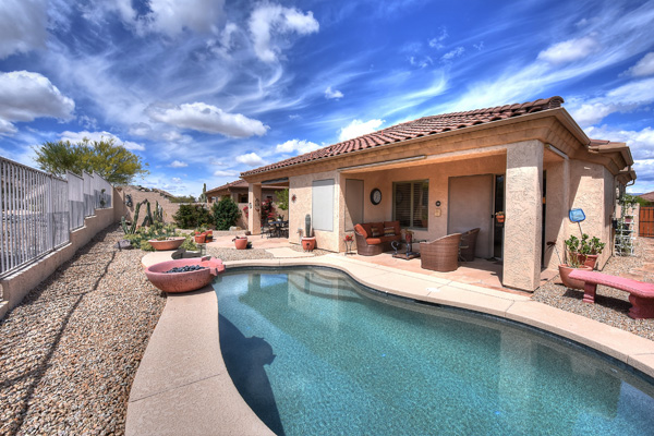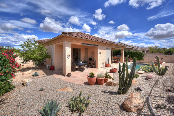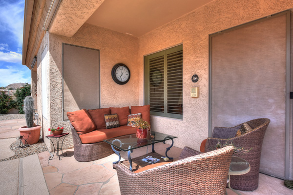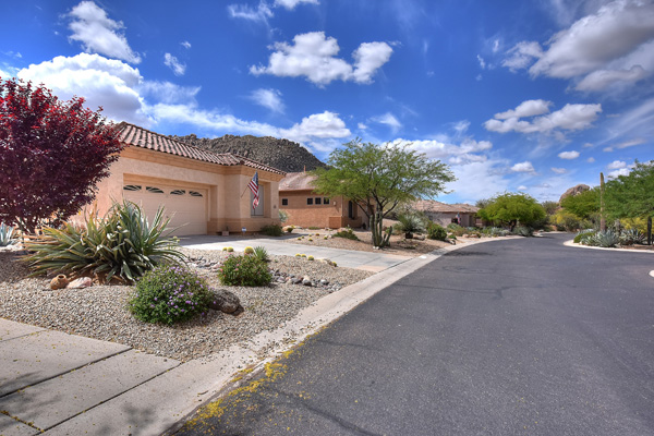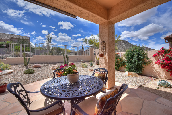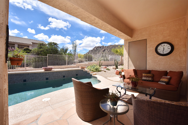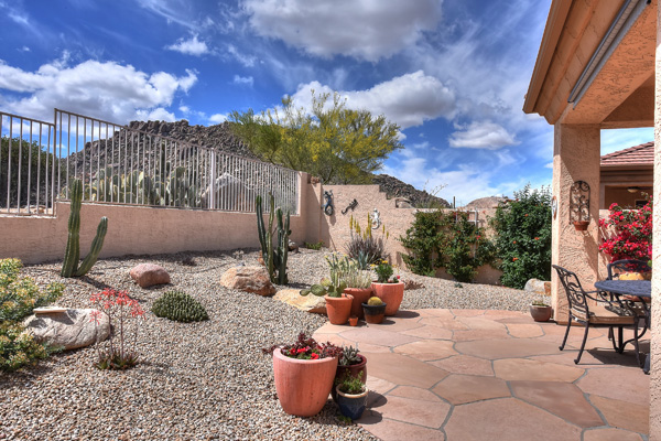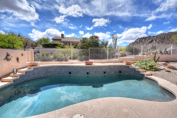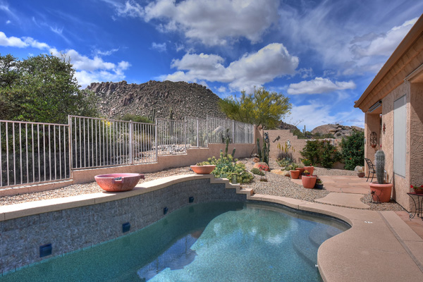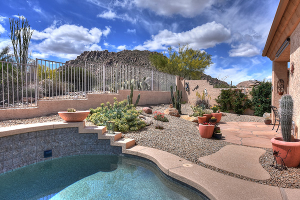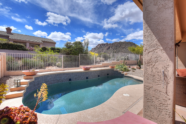 Beautiful natural light fills this remodeled Desert Views home. Great Room floor plan extended 3′ in 2nd Bedroom and garage. Light neutral paint, polished travertine floors and baseboards and lots of windows (with shutters) add to the open feel inside. The upgraded master bath looks like a model complete with a soaking tub, walk in shower with glass surround, double vanity with top mount sinks, and tile surrounds. The backyard has mountain views, mature desert landscaping, flagstone patio, bbq, and newer pool with pebble-tec finish. Located in Troon Village the lot backs to NAOS for privacy and receives north/south exposure. Other featuResinclude: stainless steel appliances, gas fireplace with built ins and grand mantle, 10ft ceilings, lots of cabinet and counter space in the updated kitchen, art niches, wood flooring in bedrooms, entry foyer and granite counters. Den could be a third bedroom.