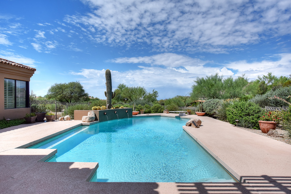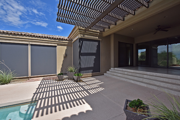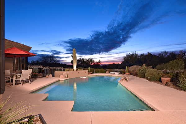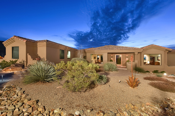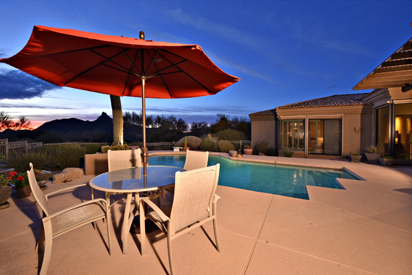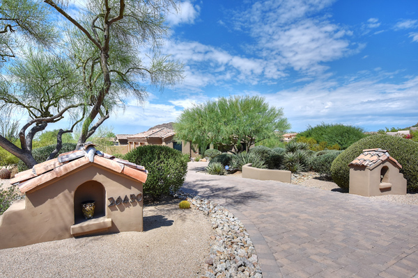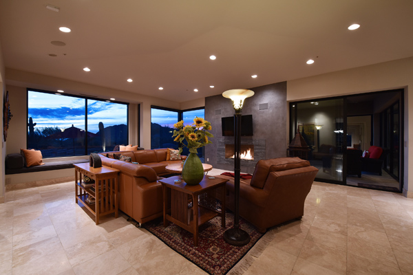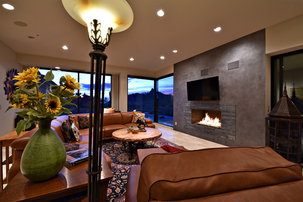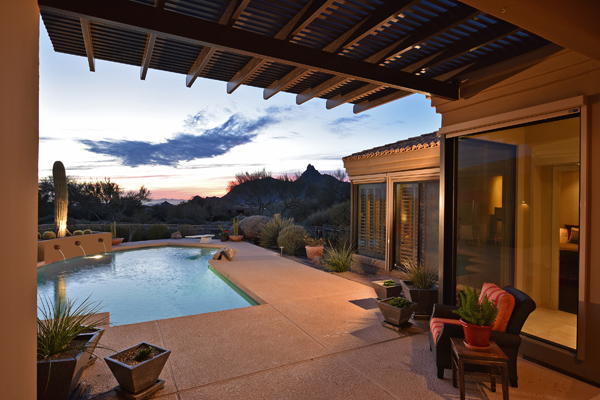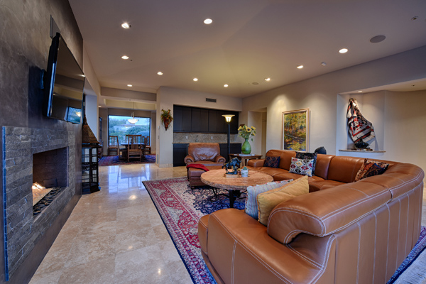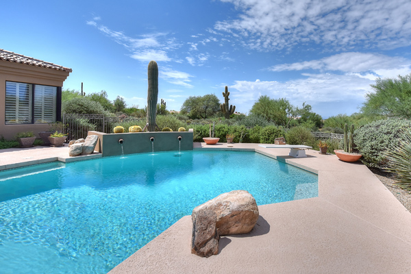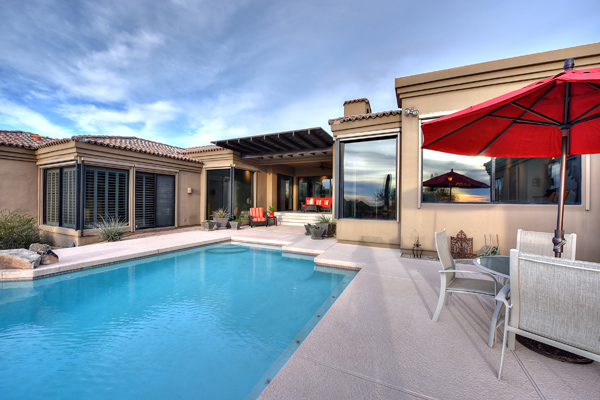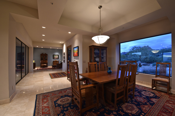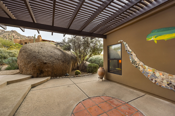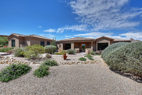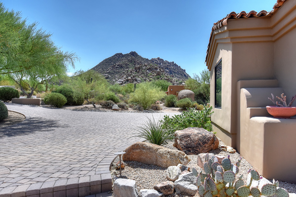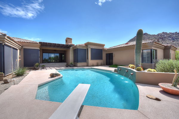 A standout amongst golf course properties, this clean line residence fully embraces its grand setting on the 5th green of Troon while specifically oriented to maintain privacy without compromising views. Custom built, renovated, and maintained, the impeccable interior featuRestravertine and slate flooring and baths, custom cabinetry, lighting, and sound systems, granite and stone counters, upgraded energy efficient systems and windows, professional Viking cooking system plus Miele espresso system plus SubZero fridge, bar with wine storage cooler and icemaker, multiple outdoor living spaces with up close boulders, views, and much more. Split master with European extended closet and bath with dual showers and rainshower head; adjacent office with two separate work areas equivalent to 2 offices; separate guest wing with ensuite bedrooms plus bonus/ secondary family room; formal living and dining; European style kitchen with breakfast room; oversized family room with dramatic slate fireplace offset by large windows capturing mountain and golf views; exterior living space designed to enjoy 360 views of Troon Mountain, Pinnacle Peak, and beyond with covered patio for seating and dining stepping down to the extended patio surrounding the diving pool with water feature. From the moment you walk through the front entry that impressively frames just the beginning of the views, you will know this is the home.