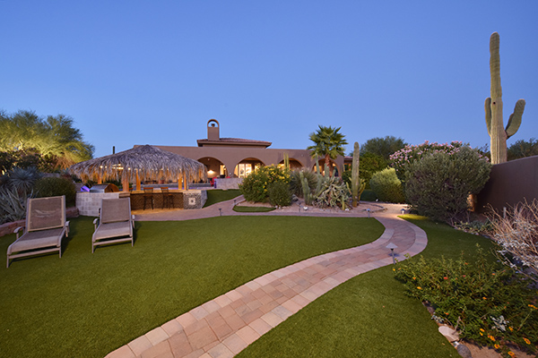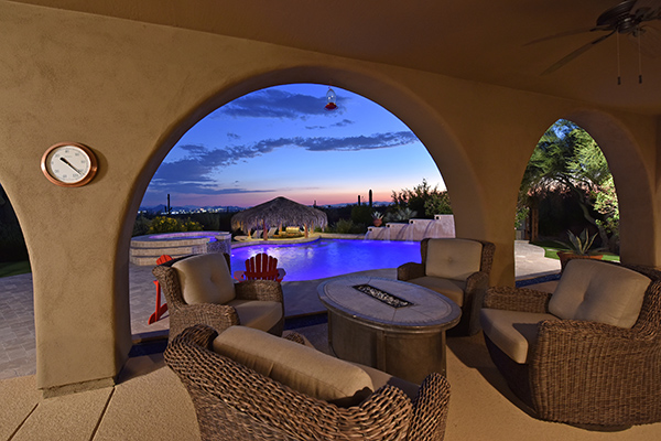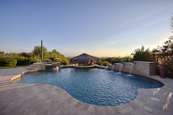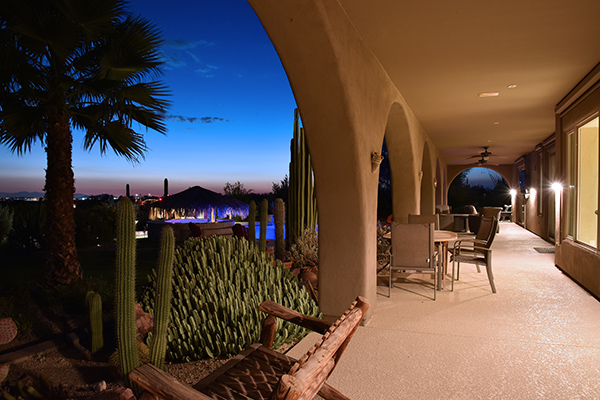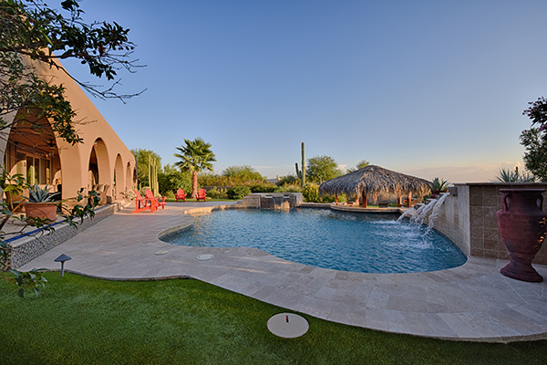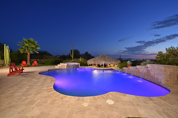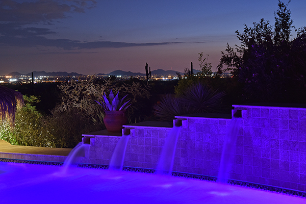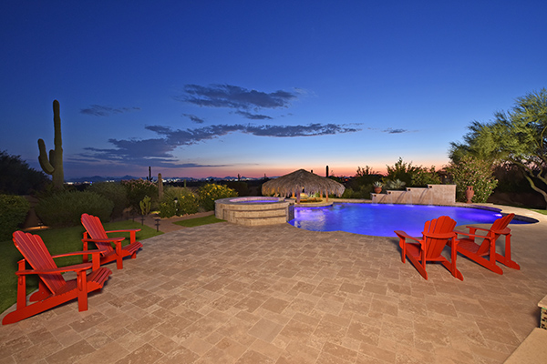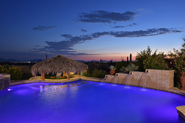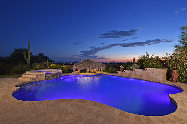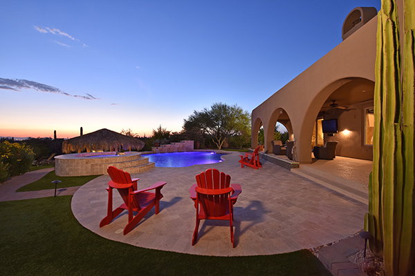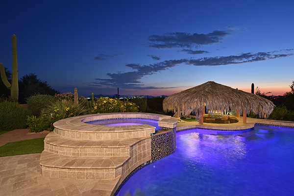 Superb city light views are the focal point for this beautiful home in Pinnacle Peak Vistas on nearly an acre. A TRUEresort yard highlighted by a swim up cabana with built in BBQ and seating, play pool with water feature and elevated spa, large covered porch spanning the length of the house, artificial turf and hardscape accents, and mature vegetation including cactus garden. Inside the home you will enter through the grand foyer with custom arched metal and opaque glass door and matching windows leading to the great room, dining and kitchen for a spacious open floor plan feel. The kitchen is a chef’s delight with furniture grade cabinetry, eat in breakfast area and peninsula bar, two toned center island, stainless steel appliances, cantera stone hood vent, and drop ceiling accents. The master suite is large and has exterior access to soak in the city lights and grand sunsets, with dual vanities, walk in shower, and his and hers closets in the master bath. Other featuResinclude; travertine flooring throughout, kiva fireplace and built in entertainment unit in great room, office with built in desk and shelving, art niches with custom murals, entry courtyard with water fountain, three car garage and pavered drive, and two additional guest suits. The private setting of the home and neighborhood are complimented by the convenience of restaurants, shopping, and freeway access just minutes away.