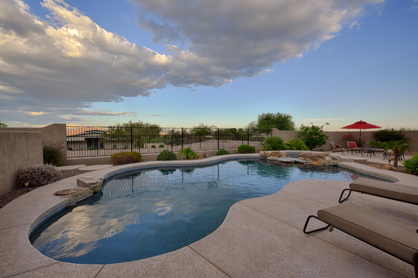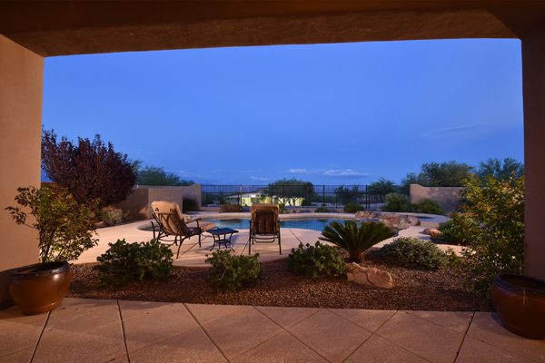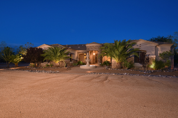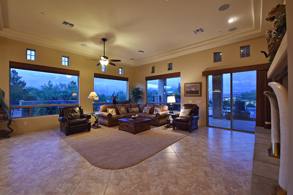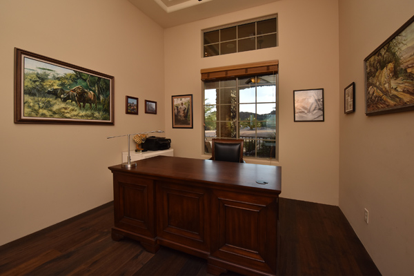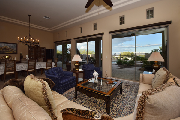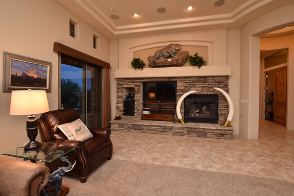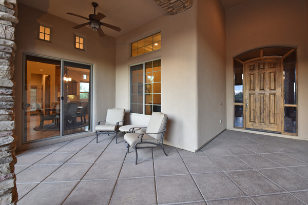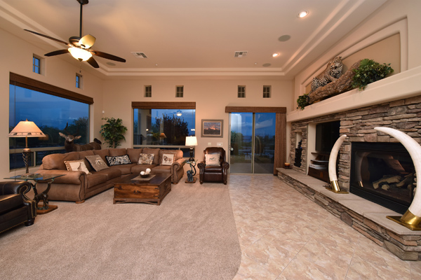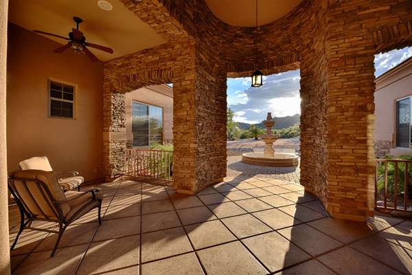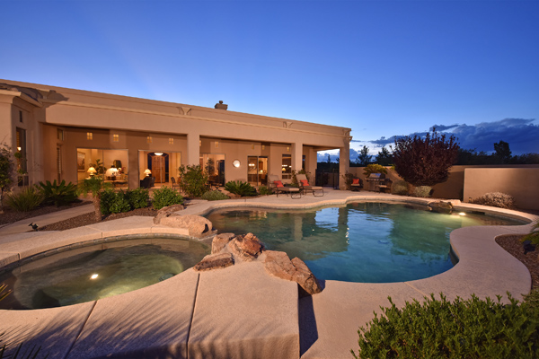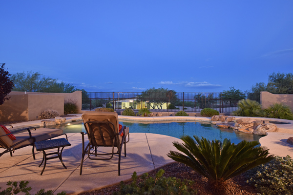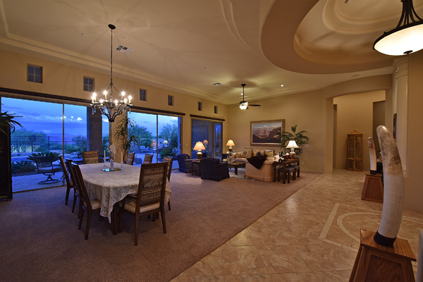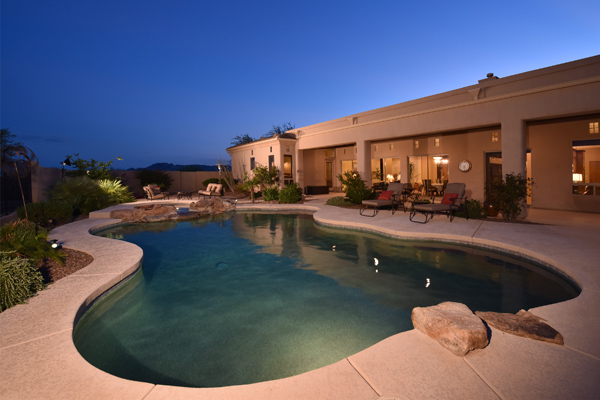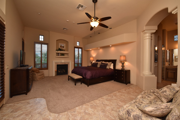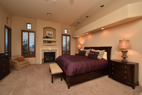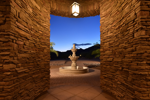 The main house begins with the great room featuring walls of sliding doors framing the property and dramatic mountain vistas. The open kitchen/ family room has granite counters, alder cabinetry, breakfast room, walk-in pantry, top of the line stainless steel appliances including the hooded 6 burner Viking range, and a stacked stone fireplace with entertainment center. The master suite featuResa fireplace with space for seating, access to the back patio, two walk-in closets, and large bathroom with walk-in shower and jetted soaking tub. All three additional bedrooms, each connected to a bath area, open onto the bonus/game room complete with a full bar area. Additional interior amenities include executive office, powder room, laundry room and 3-car split garage. An extended patio wraps the back facade for covered seating and dining areas before expanding out to surround the heated pool and spa. Enjoy panoramic mountain views after a trail ride in the 30,000-acre McDowell Sonoran Preserve adjacent to this gated residence.