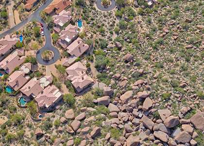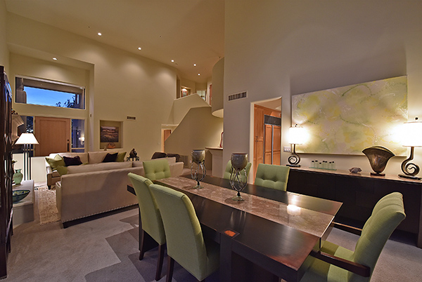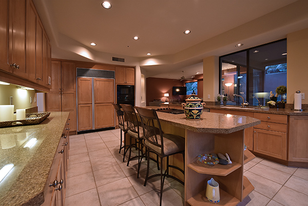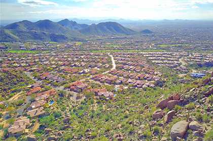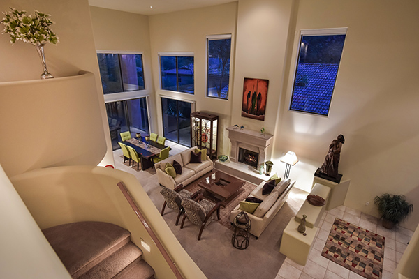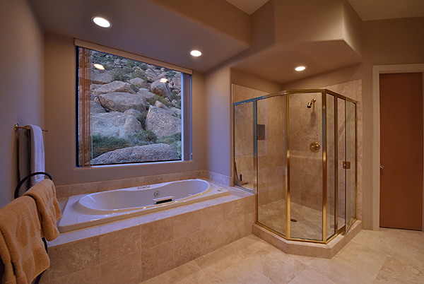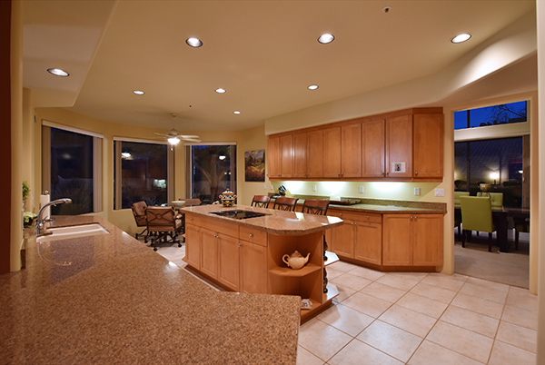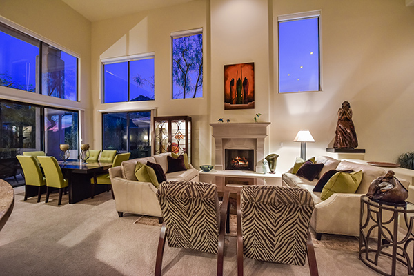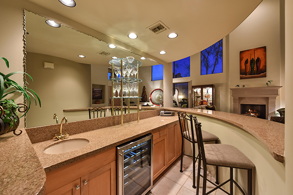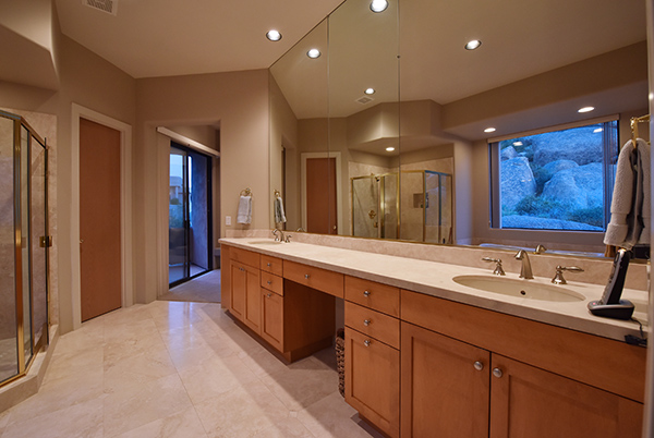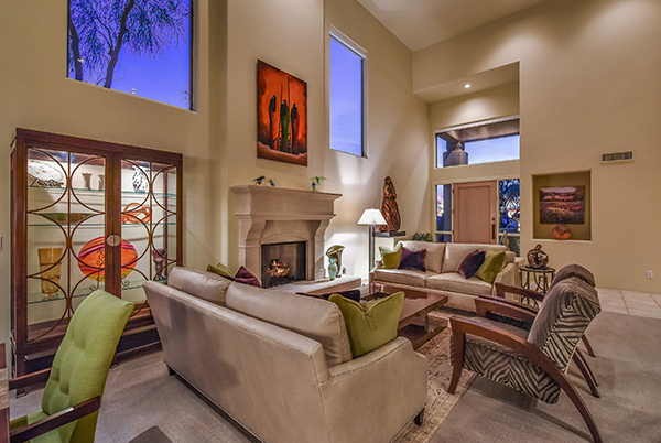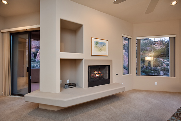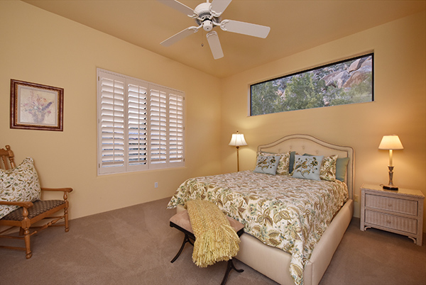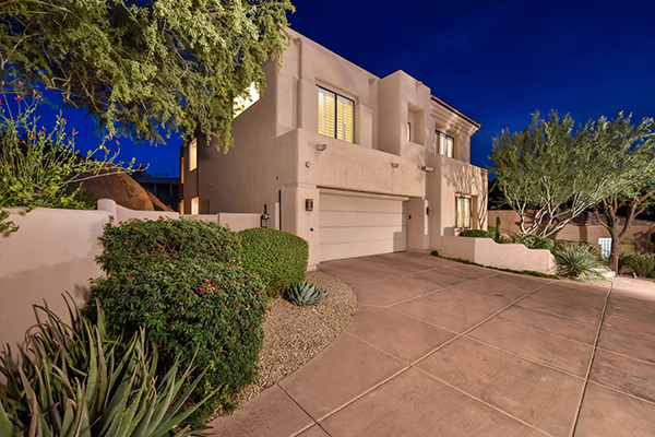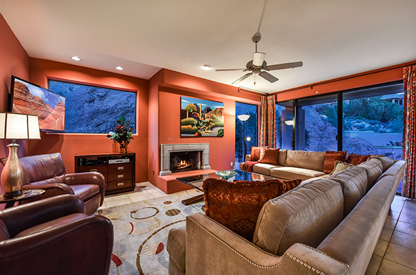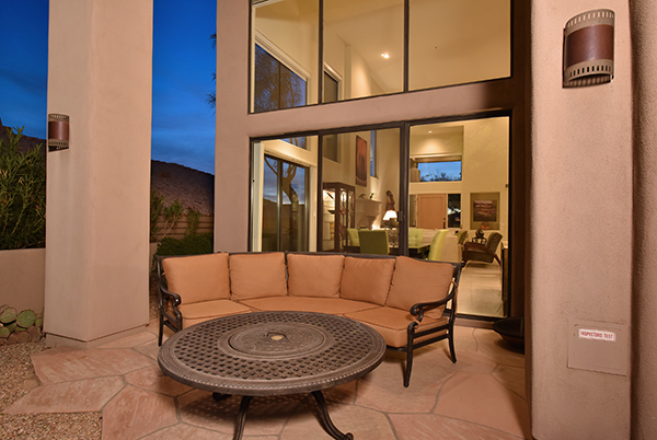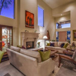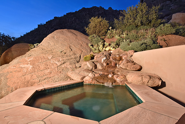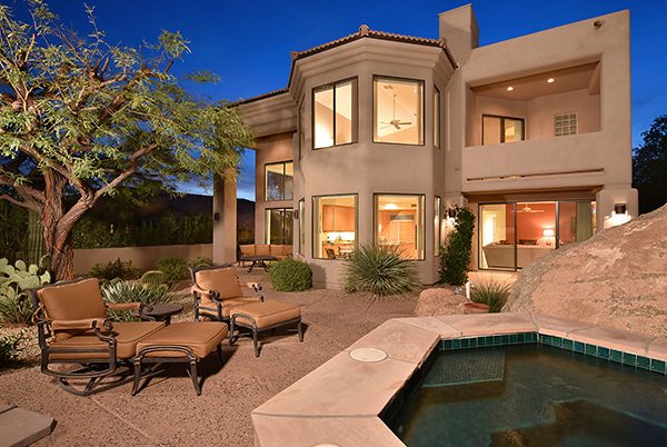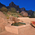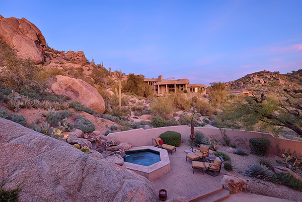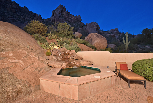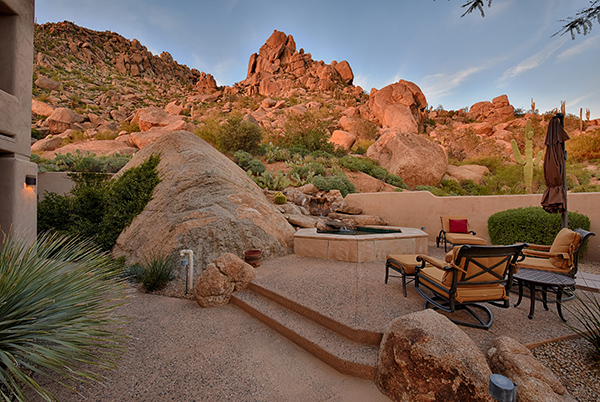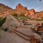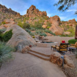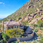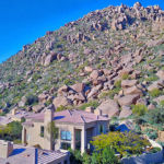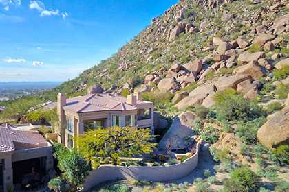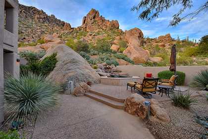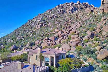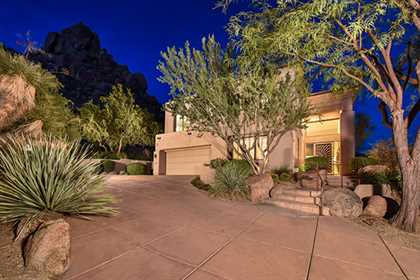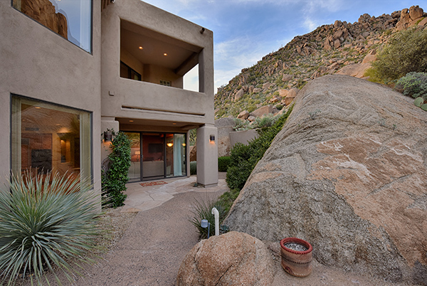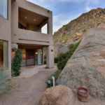 Spectacular location in Whispering Ridge – nestled among the boulders of Troon Mountain on a large, high elevation lot at the end of a cul-de-sac. The up close and personal views of the mountain are accented throughout the home from the multitude of windows that also let in tons of natural light. The extremely functional kitchen has spacious counter space, large center island with seating, ample cabinet storage, cook top and double ovens. Located just off the kitchen, the family room is the heart of the home with a cozy fireplace and picture windows displaying the large boulder the home is built around. Outside enjoy the desert scenery from the lounge areas and the spa with waterfall built into the boulder. Upstairs the master suite is serene with a fireplace, private balcony, sitting area, and large bathroom with an extended vanity with double sinks, walk-in closet, and large soaking tub with view window. With 3 more bedrooms, one down and 2 up, and a formal dining and living area with wet bar, this home has it all! Updated featuResinclude: roof, furnaces and heat pumps, outdoor BBQ, paint, washer and dryer, wine fridge, and many more! One of the most unique and private lots in Troon Village.