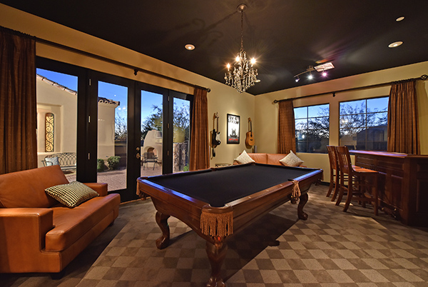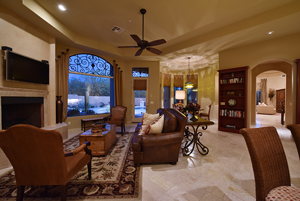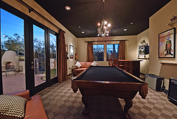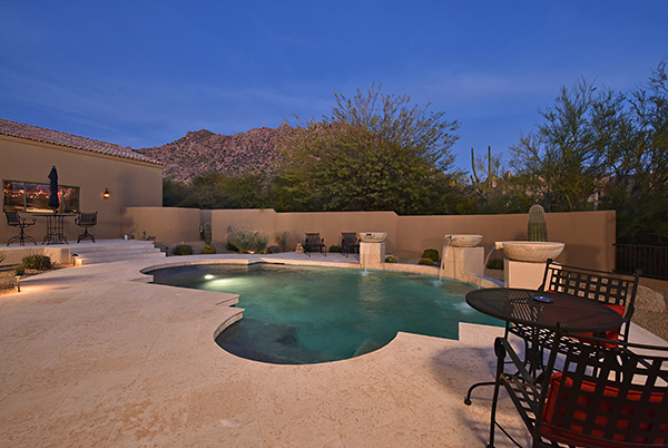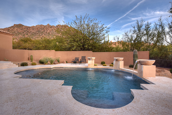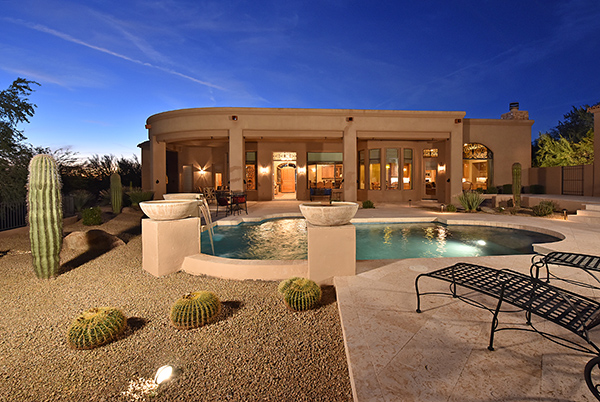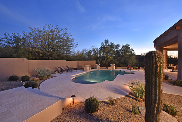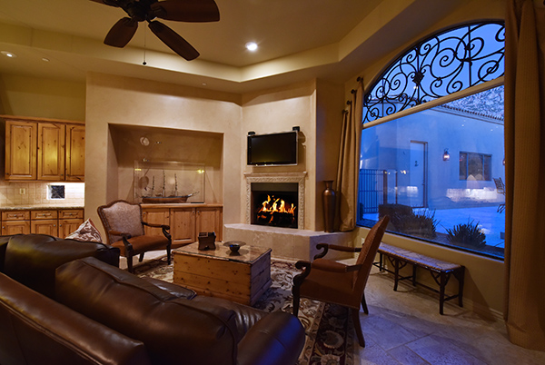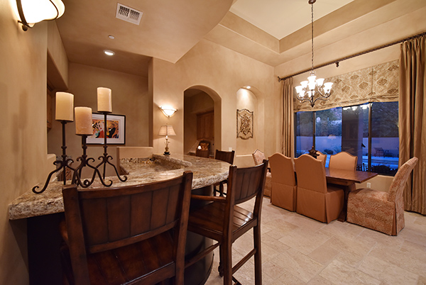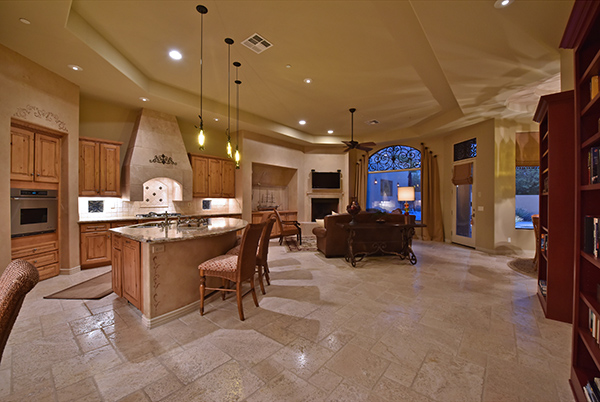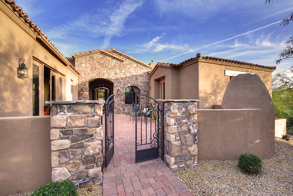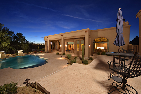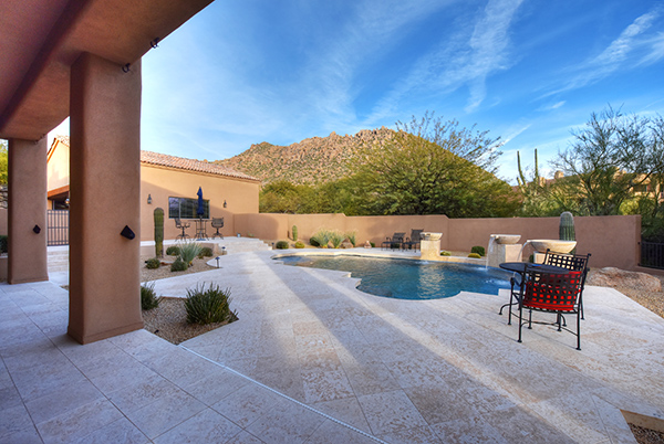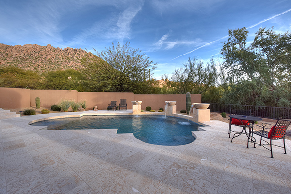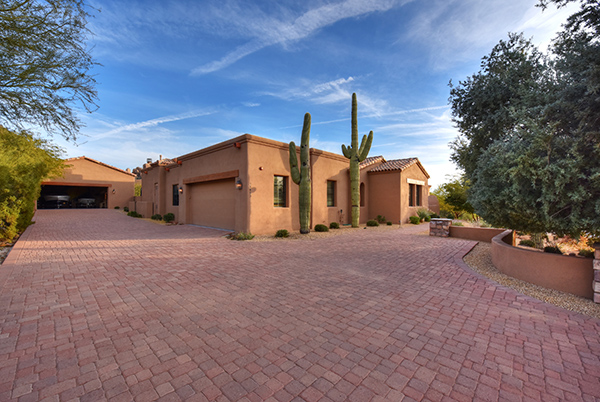 Beautiful residence in gated Windy Walk Estates at Troon Village boasts direct views of Troon Mountain. All on one level with no interior steps. Master retreat with private sitting area and adjacent office, mother-in-law suite, plus 2 additional bedrooms. Warm up in the master suite with the adobe-style fireplace, then move between the attached office and seating areas. The stone accented front has a private entry courtyard. The stunning kitchen with its soaring ceilings, open floor plan to the family, custom travertine stone vent and backsplash, stainless steel appliances, large center island, granite slab counters and ample cabinet space will satisfy even the pickiest buyer. Outside, the lot is equipped with a two-car attached garage, and four-car detached garage complete with Tiki-bar. The backyard is sure to impress with resort-style lounge seating and a pool decorated with water featuResblending seamlessly into the desert landscaping. Escape the heat under the covered patio while still enjoying the breathtaking views. Outside, the lot is equipped with a two-car attached garage, and four-car detached garage complete with Tiki-bar for entertaining. Other featuResinclude versailles pattern travertine throughout the interior and back exterior, designer paint, large wet bar, wood doors, upgraded carpet in the bedrooms and billiards room, and epoxy floors in the garage. This wonderfully maintained home is ready!