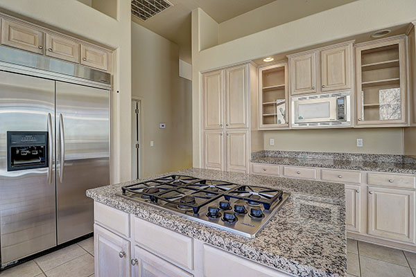 The kitchen has a stainless steel appliance package, gas cooktop in the center island, breakfast area, double ovens and granite counters. Light, bright floor plan, 3-car garage with storage and epoxy floors, and a large master bedroom with fireplace and king sized ensuite bathroom.