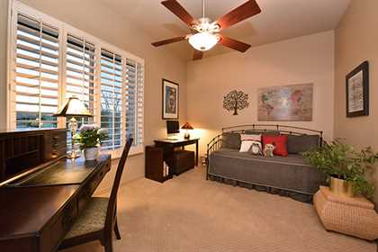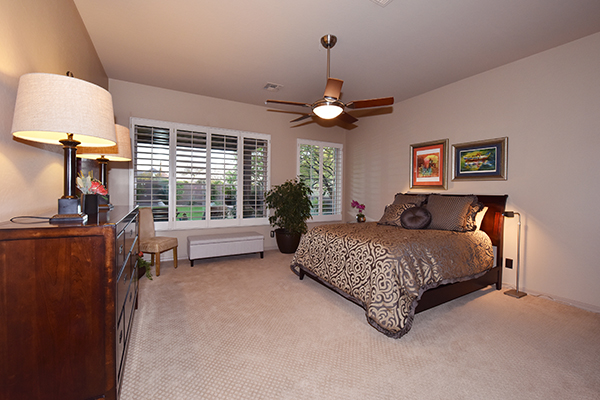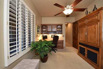 Other features include plantation shutters throughout, epoxy flooring in the garage, master suite with split vanities and large soaking tub, alder cabinetry, retractable awnings, and a front entry security door.