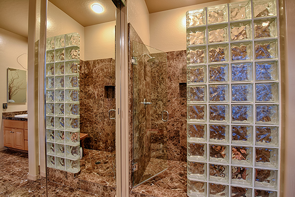 The generous backyard showcases a large covered patio, new artificial turf, mature trees and flowering plants, a heated spool with waterfall feature, elevated lounge area and private fire pit, built in BBQ, and flagstone and paver hardscape. Four large Anderson wood casement picture windows and sliding doors were installed to accent the views and allow for beautiful, natural light. The large kitchen has a center island with seating, stainless steel appliances with gas range, granite counters, ample cabinet storage, breakfast area, and opens to the family room with a stacked stone accent wall, floating shelves and fireplace.