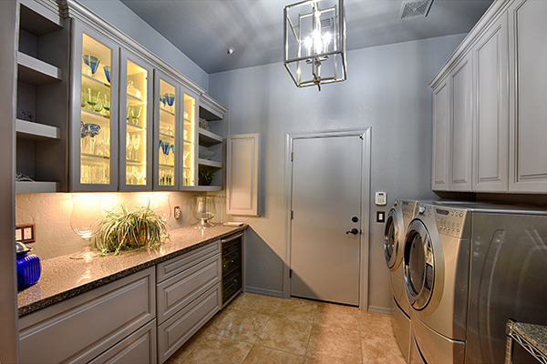 The updated laundry room also serves as a butlers pantry with glass front cabinets and wine fridge.