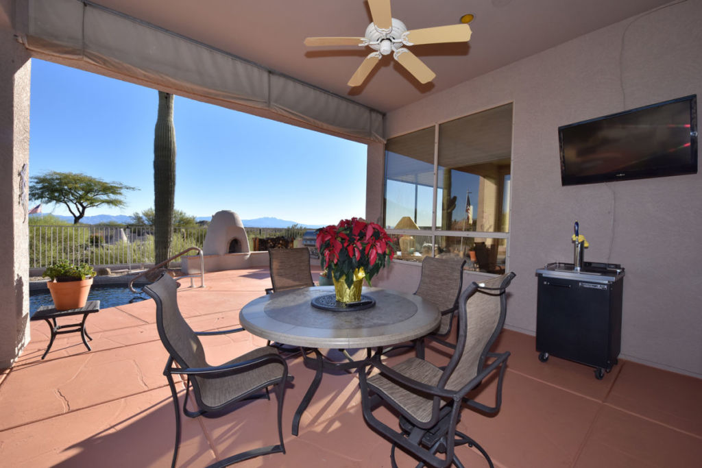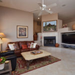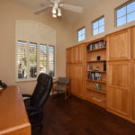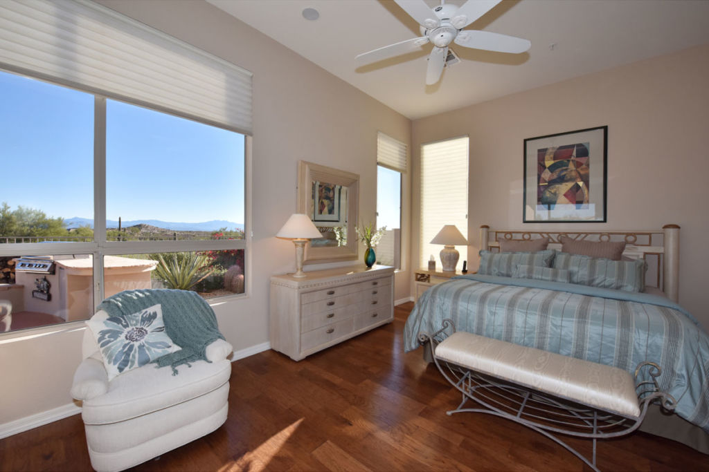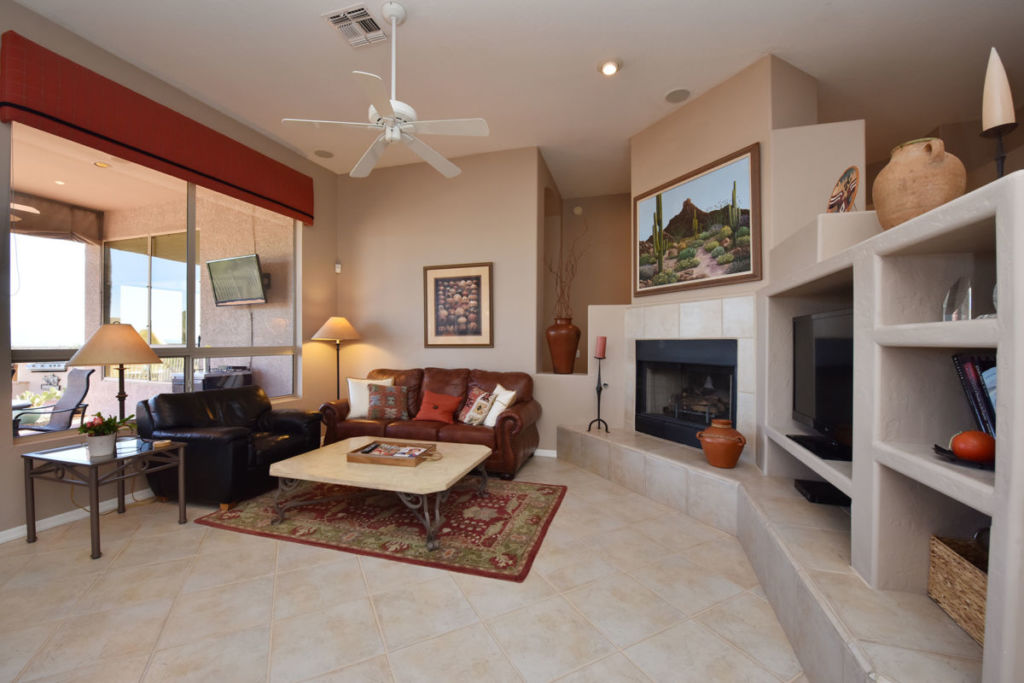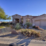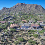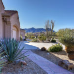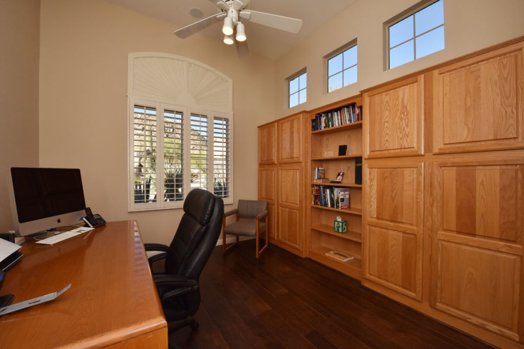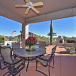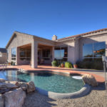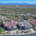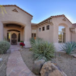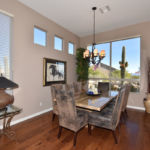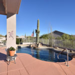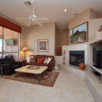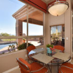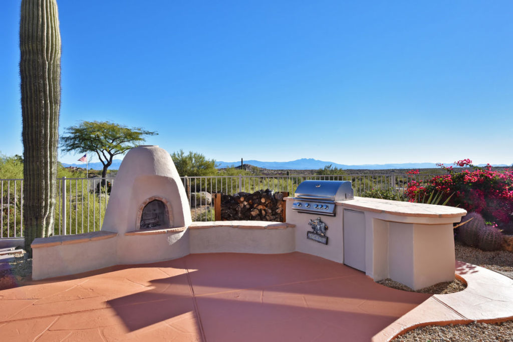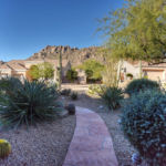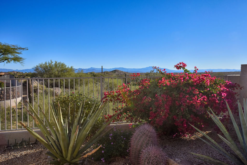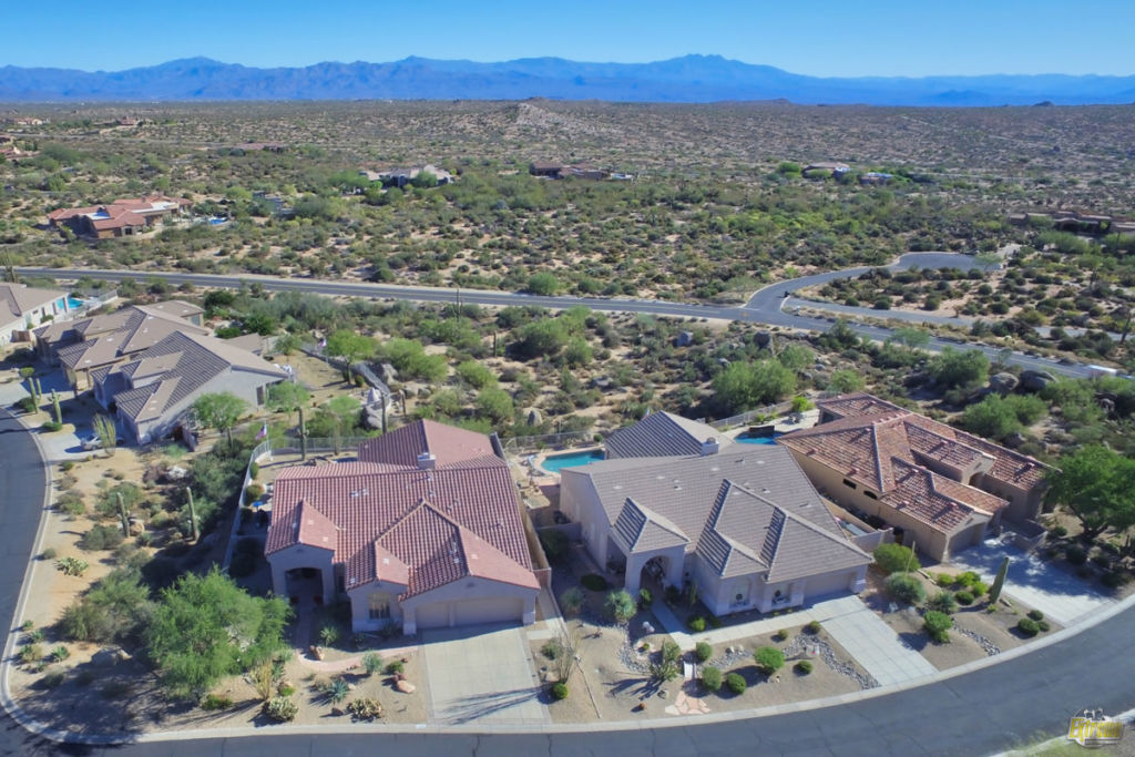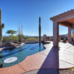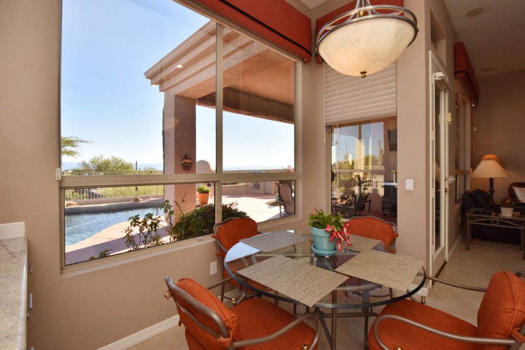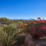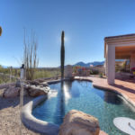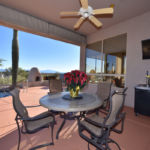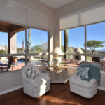 Floor plan features split master bedroom with large walk-in closet; adjacent office; powder bathroom; two secondary bedrooms each with their own vanity that connects to a jack-and-jill bath; 4th guest bedroom with removable Murphy bed cabinet and adjacent full bathroom; full size laundry room; formal living and dining rooms offer flex space for media or billiards room; and eat-in kitchen open to family room. Expansive backyard features travertine covered patio that expands out to surround the heated pool with water features, the stacked stone gas burning fire pit; built-in cook station, flowering desert landscape — all designed to frame the spectacular view.