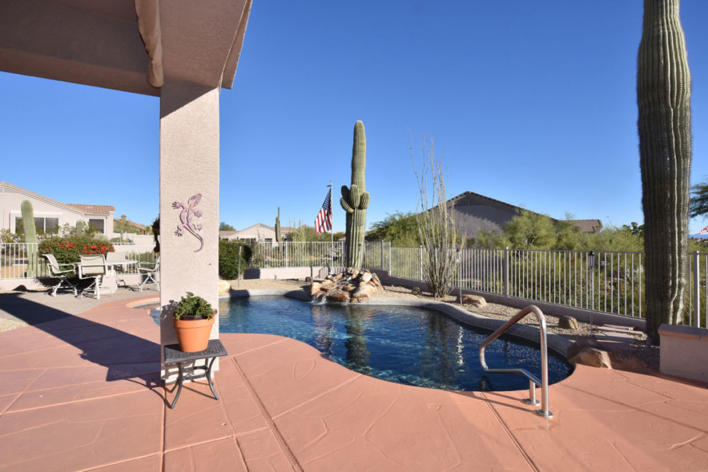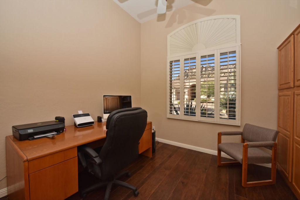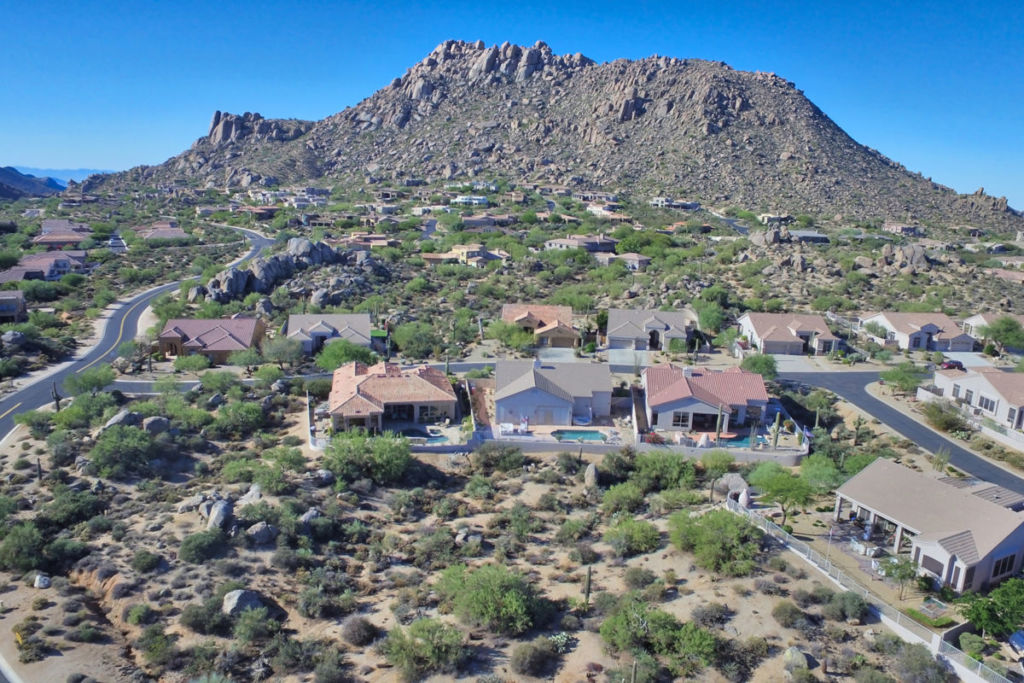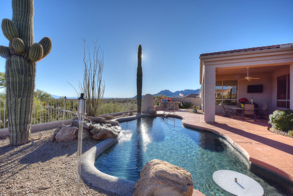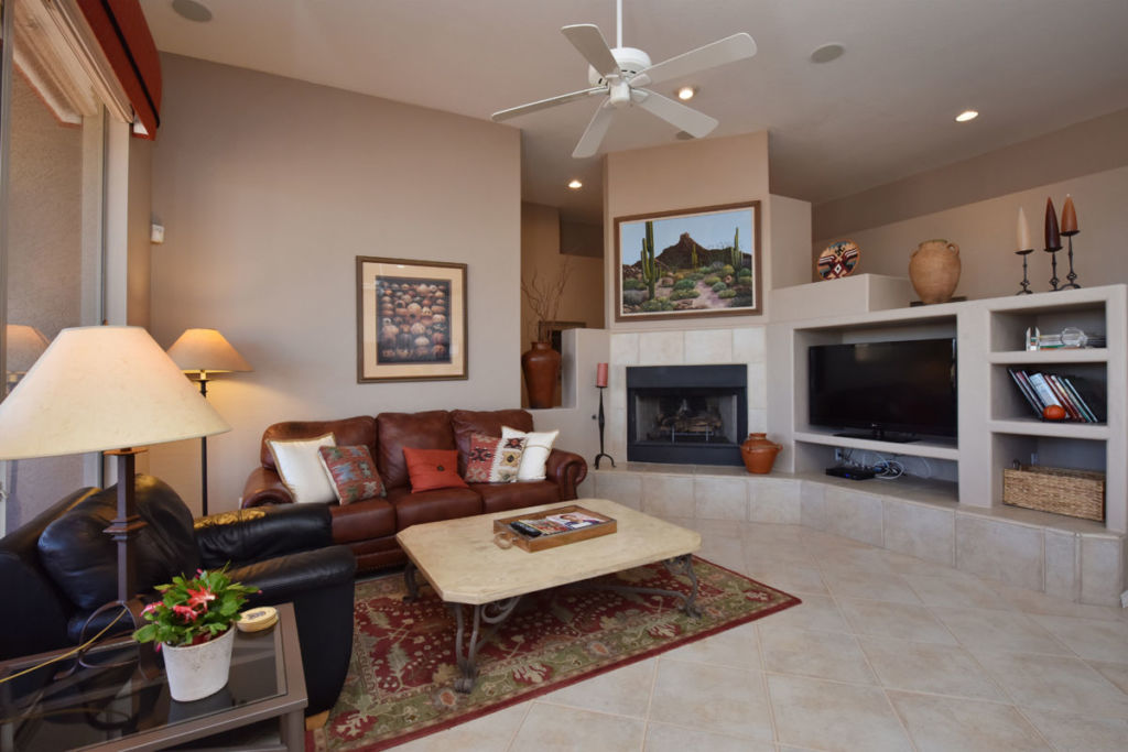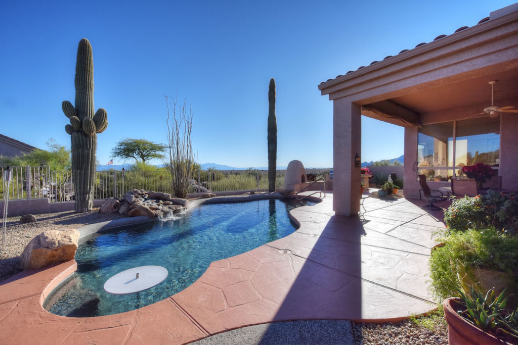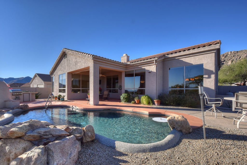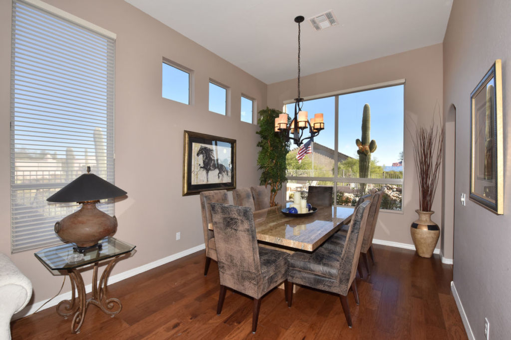 Floor plan features split master bedroom with large walk-in closet; adjacent office; powder bathroom; two secondary bedrooms each with their own vanity that connects to a jack-and-jill bath; 4th guest bedroom with removable Murphy bed cabinet and adjacent full bathroom; full size laundry room; formal living and dining rooms offer flex space for media or billiards room; and eat-in kitchen open to family room. Expansive backyard features travertine covered patio that expands out to surround the heated pool with water features, the stacked stone gas burning fire pit; built-in cook station, flowering desert landscape — all designed to frame the spectacular view.
