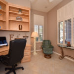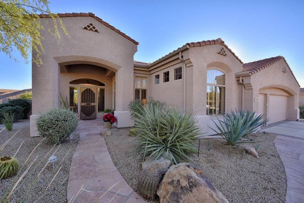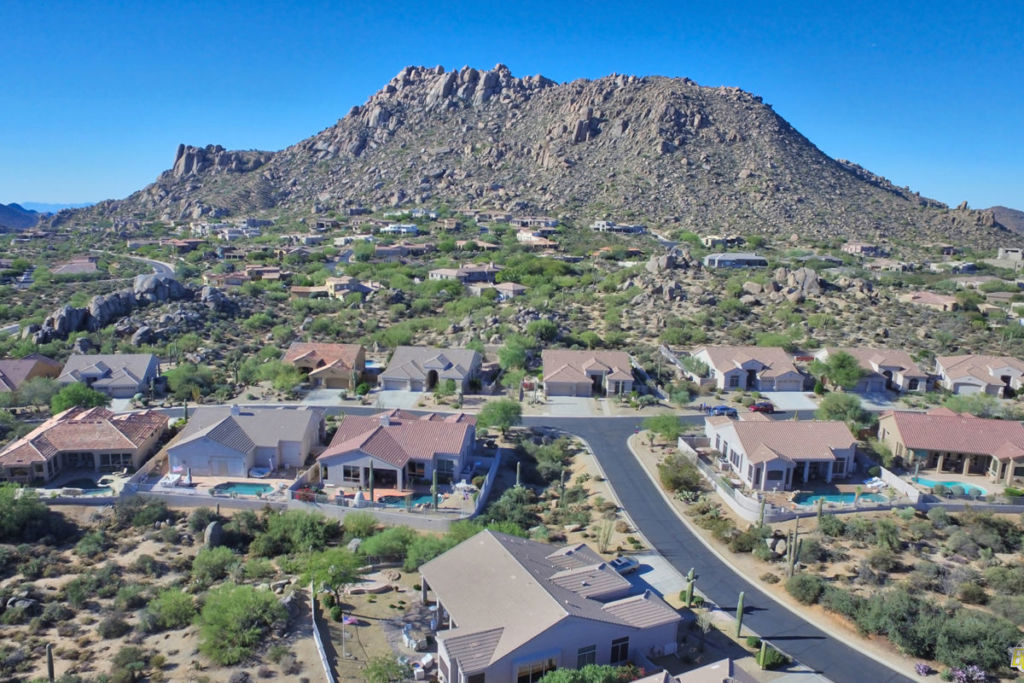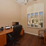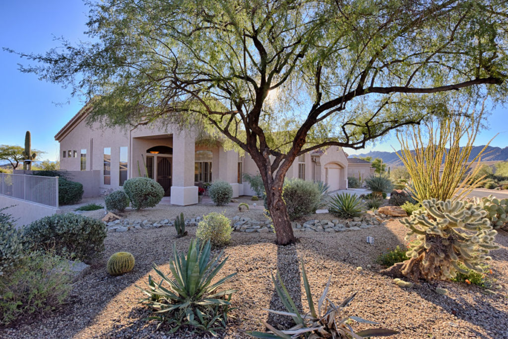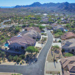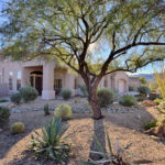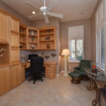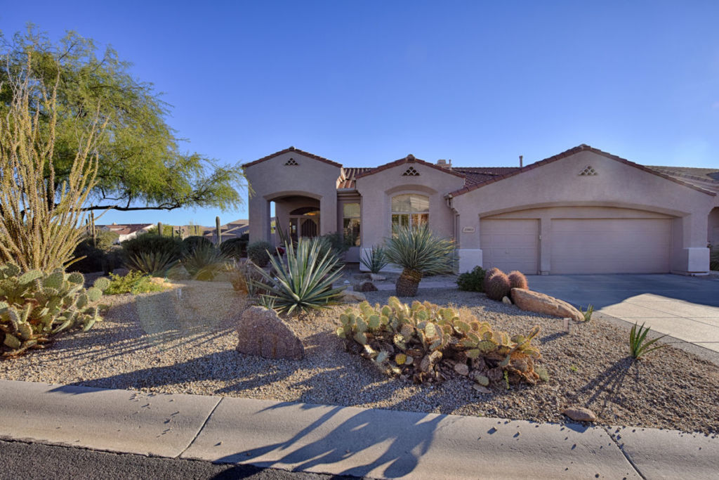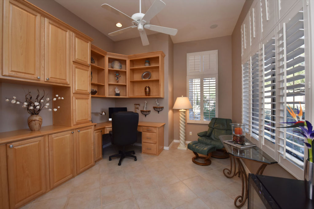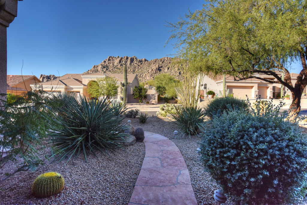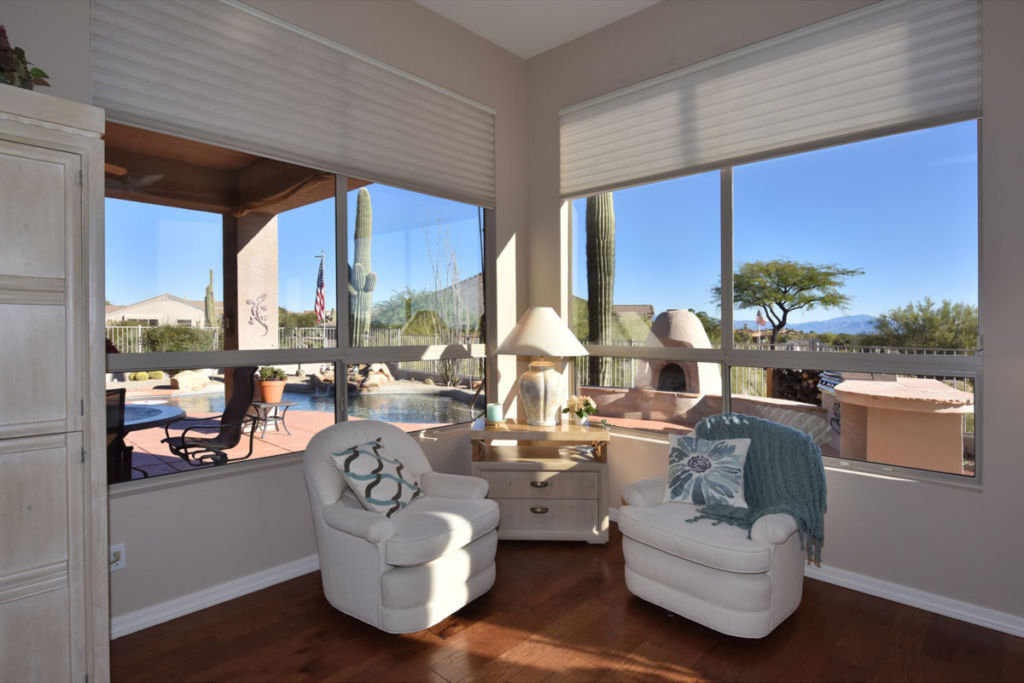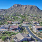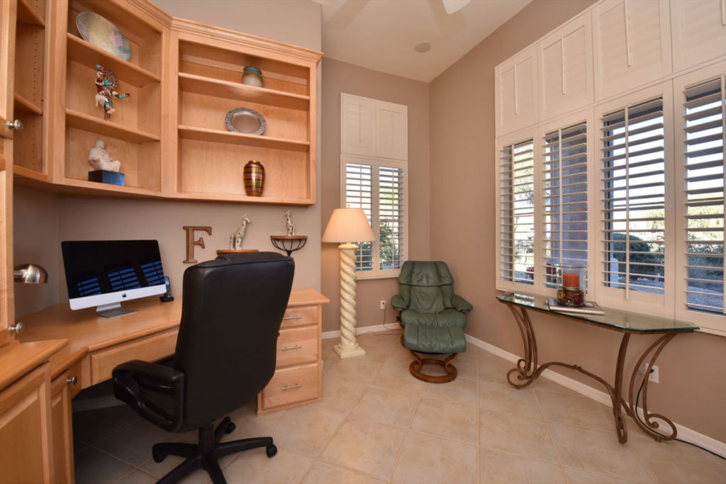 Floor plan features split master bedroom with large walk-in closet; adjacent office; powder bathroom; two secondary bedrooms each with their own vanity that connects to a jack-and-jill bath; 4th guest bedroom with removable Murphy bed cabinet and adjacent full bathroom; full size laundry room; formal living and dining rooms offer flex space for media or billiards room; and eat-in kitchen open to family room. Expansive backyard features travertine covered patio that expands out to surround the heated pool with water features, the stacked stone gas burning fire pit; built-in cook station, flowering desert landscape — all designed to frame the spectacular view.