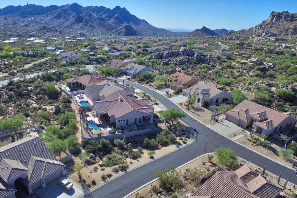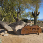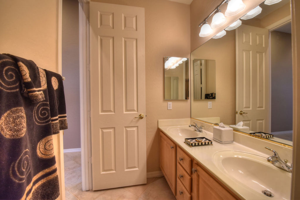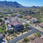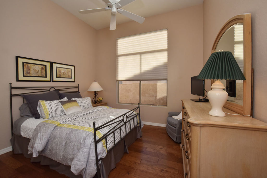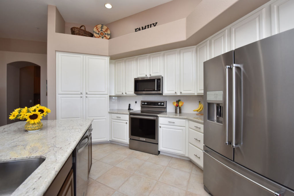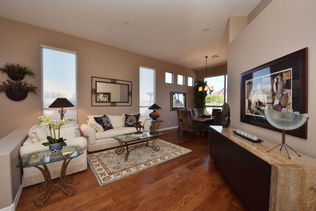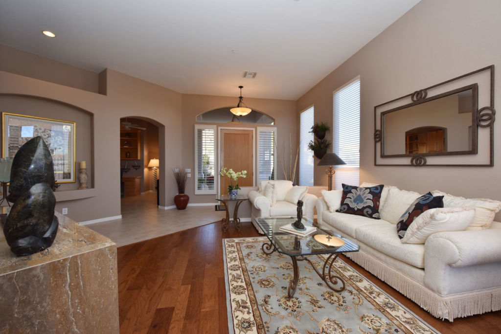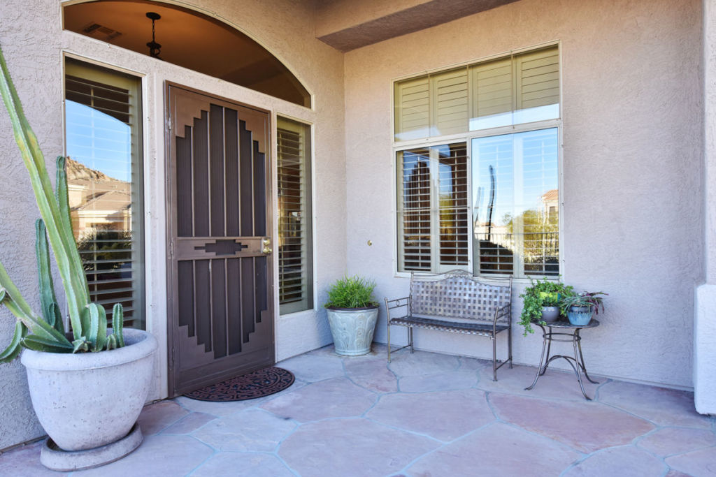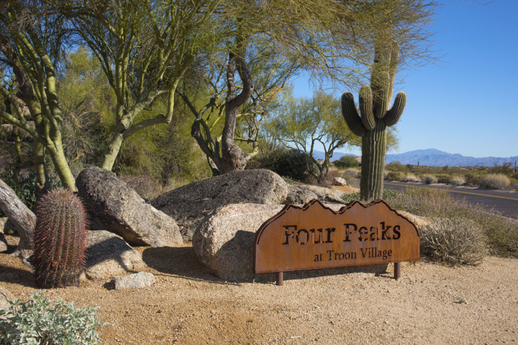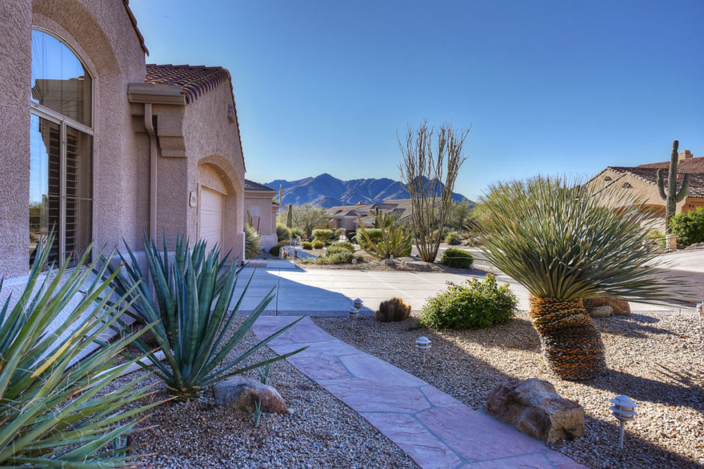 Floor plan features split master bedroom with large walk-in closet; adjacent office; powder bathroom; two secondary bedrooms each with their own vanity that connects to a jack-and-jill bath; 4th guest bedroom with removable Murphy bed cabinet and adjacent full bathroom; full size laundry room; formal living and dining rooms offer flex space for media or billiards room; and eat-in kitchen open to family room. Expansive backyard features travertine covered patio that expands out to surround the heated pool with water features, the stacked stone gas burning fire pit; built-in cook station, flowering desert landscape — all designed to frame the spectacular view.