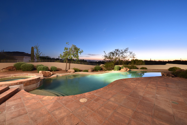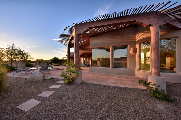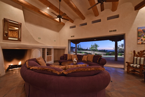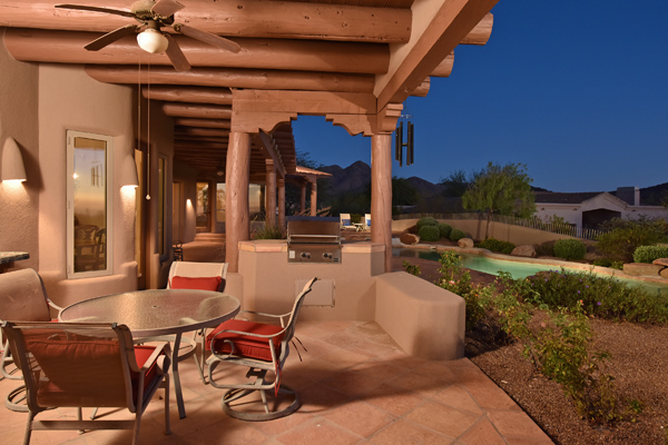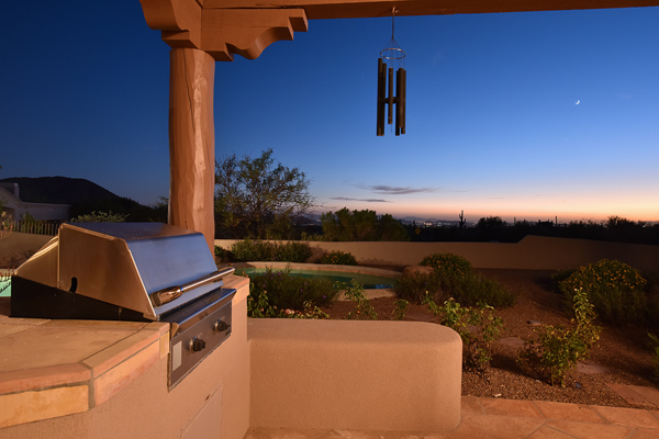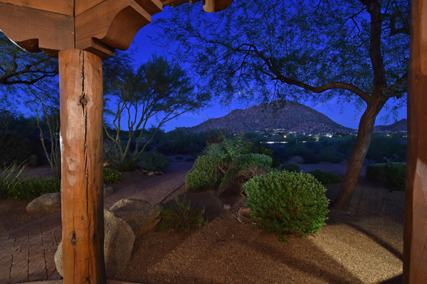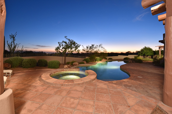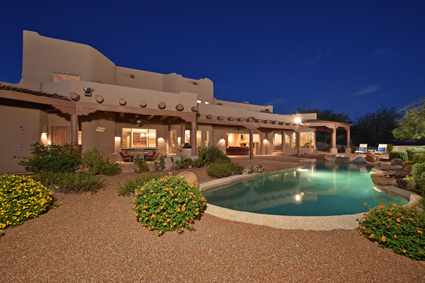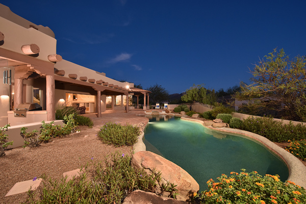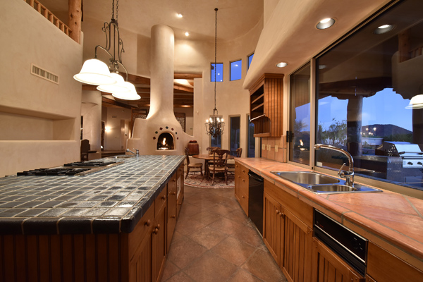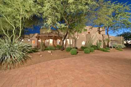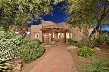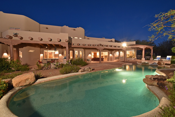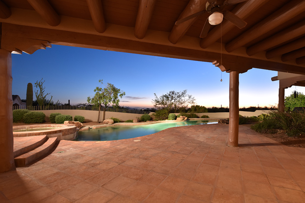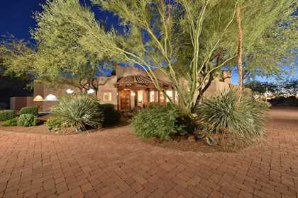 Warm and inviting Southwest custom home in guard gated Glenn Moor with architectural details galore. Nestled on nearly an acre with one of the best lots in the neighborhood, this 3800 plus sq.ft. home has sweeping city light and mountain views from the elevated lot including Troon Mountain views from the front. The sliding pocket doors off the great room allow the inside to flow out to the expansive patio spaces, large pool, heated spa, and the breathtaking city light views. Clay tiles, viga beams, and latillas accent the newly painted stucco exterior. The viga beams and latillas continue throughout the interior of the home accenting the saltillo tile floors, kiva fireplace, and designer paint. The master suite has access to the backyard and a well-appointed bathroom complete with walk-in closet, steam shower, built-in cabinetry and drawers, split vanities, soaking tub and travertine tile. The kitchen featuResan oversized island, two wall ovens, tile counters, high accent windows and skylights letting in lots of light and an eat-in breakfast area. Other features include: three new a/c units, surround sound inside and out, large brick paver driveway, three single bay garages, security system, loft or office space with balcony, hand painted sink with custom vanity in guest bath, built-in wrap around bay seating in dining, well manicured mature landscaping and a built-in bbq. If your looking for a home with good bones to make your own then look no further. The community of Glenn Moor is situated around the back nine holes of Troon Country Club and houses a clubhouse, tennis court, pool, spa and shuffleboard court for residents to use at leisure.