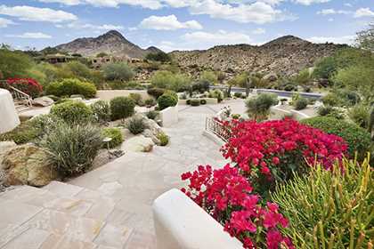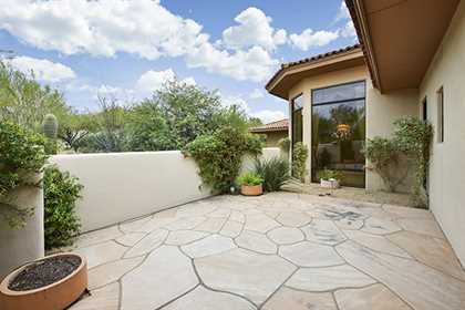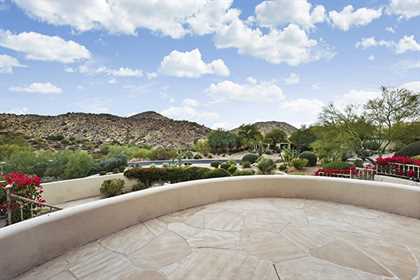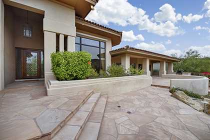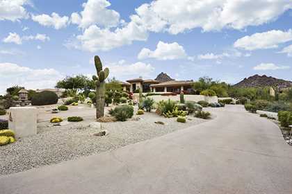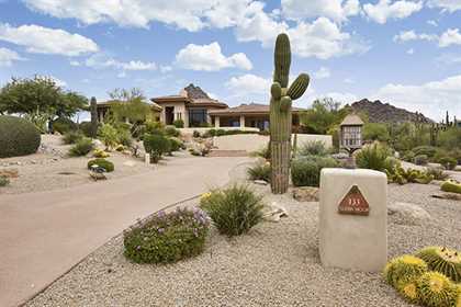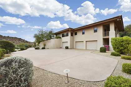 Located in the upscale guard gated community of Glenn Moor at Troon Village, this custom home features clean lines and walls of windows to frame up close views of the McDowells and Troon Mountain. The large circular drive leads you to the home on an elevated setting framing the mountains beyond with commanding curb appeal.