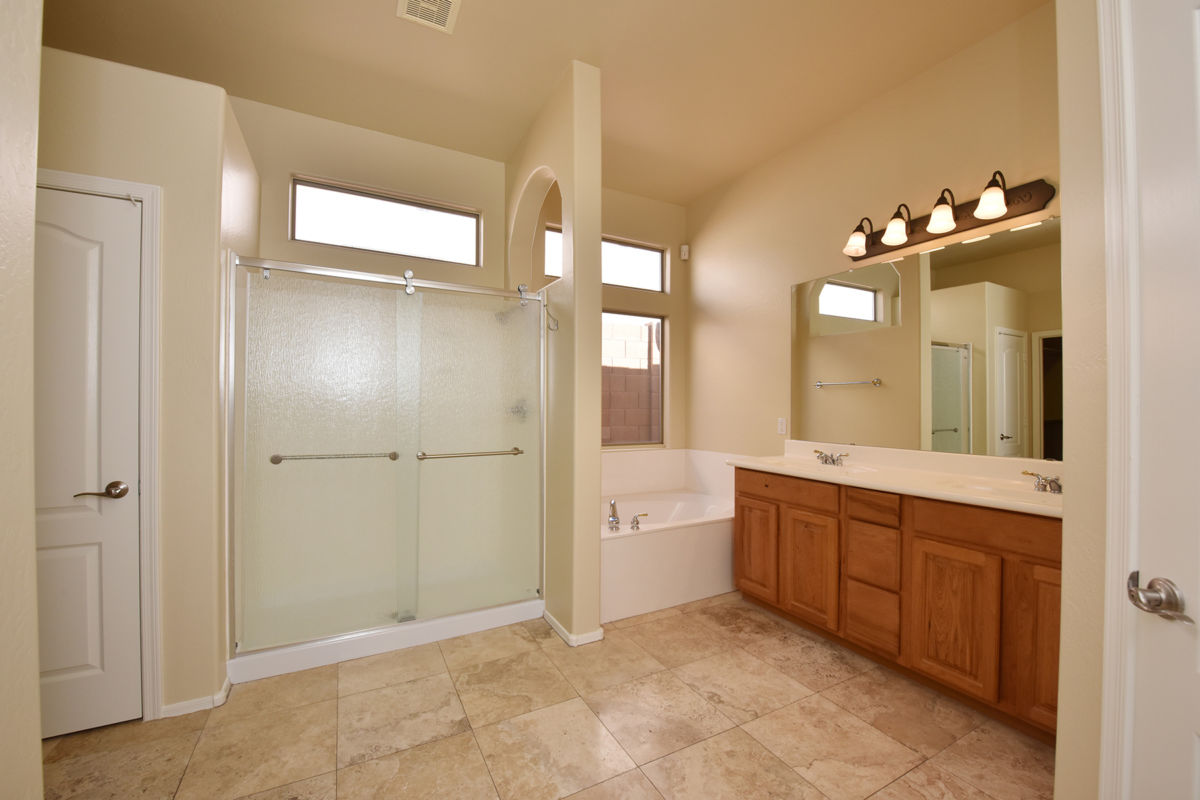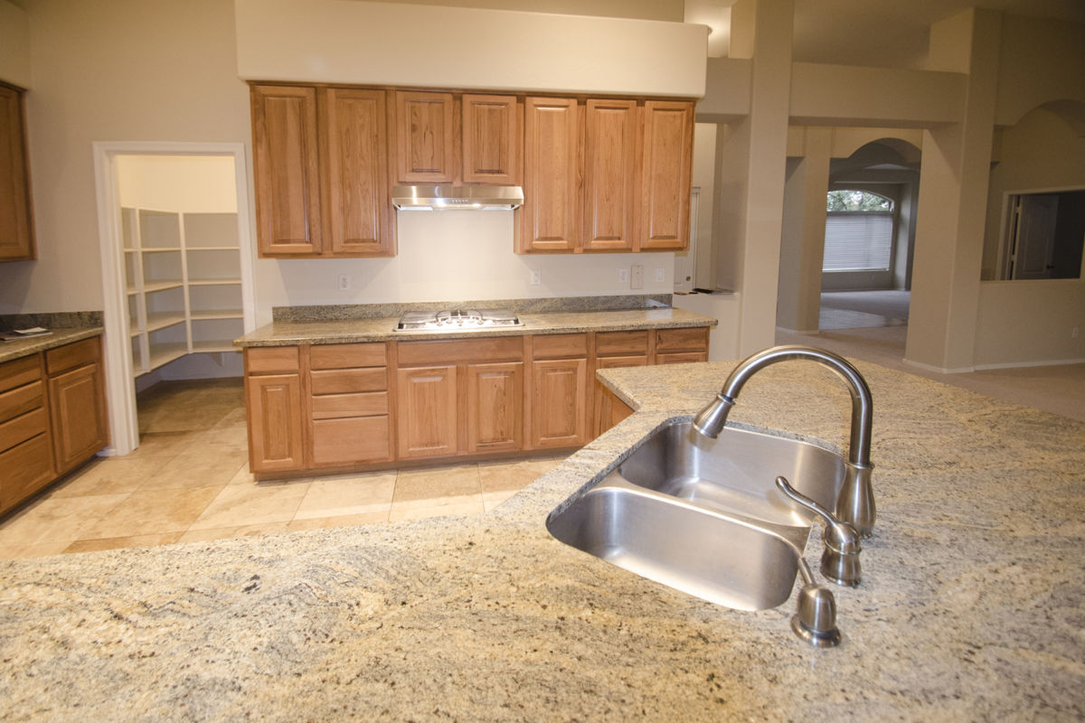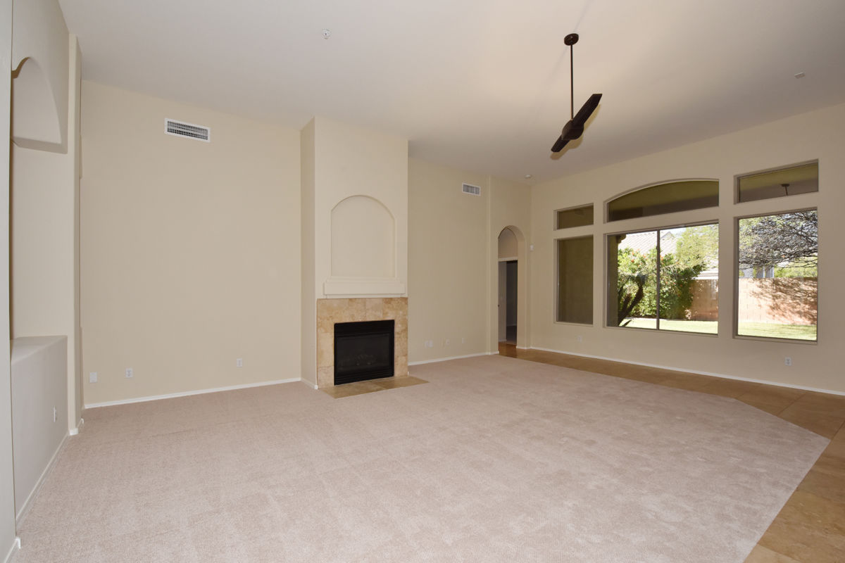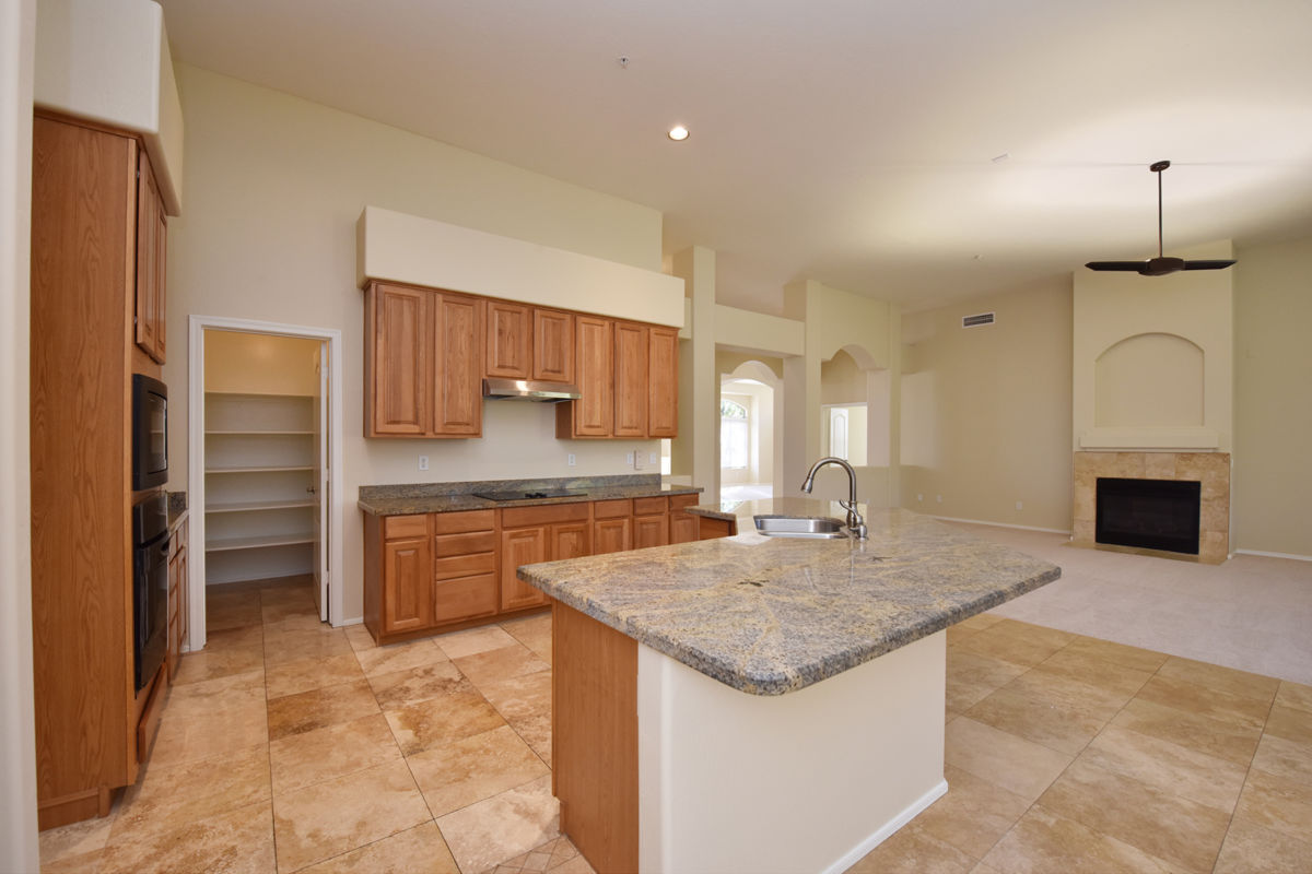 The kitchen features a large center island with granite counters, a large walk in pantry, ample cabinet space and opens to the breakfast nook and family room with fireplace. The split floor plan features four bedrooms and three full baths with formal living and dining spaces. The master bedroom and bathroom are spacious, complete with a soaking tub, walk in shower, large walk in closet with built in shelving, and dual sinks.