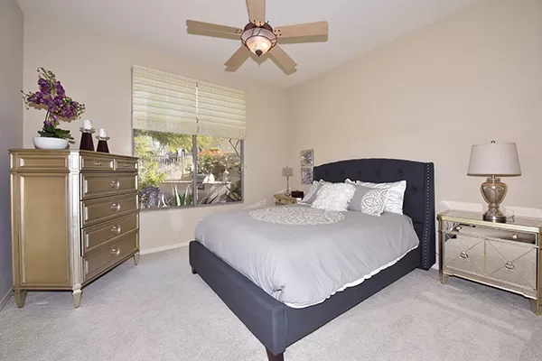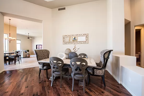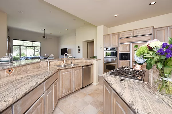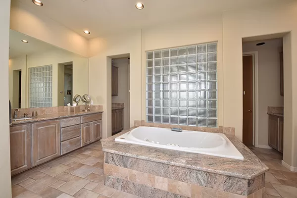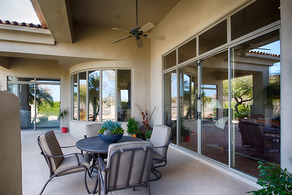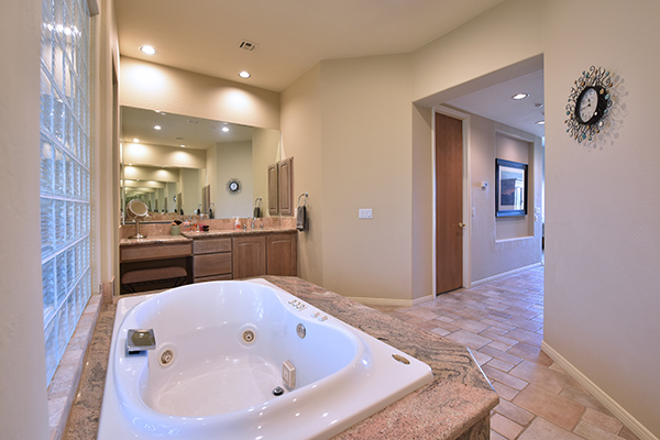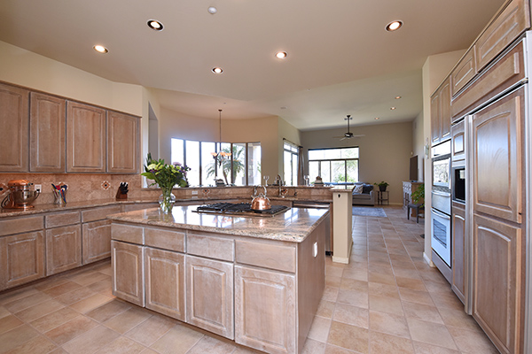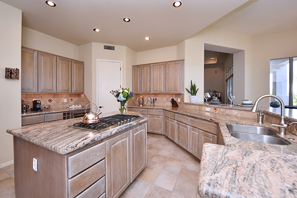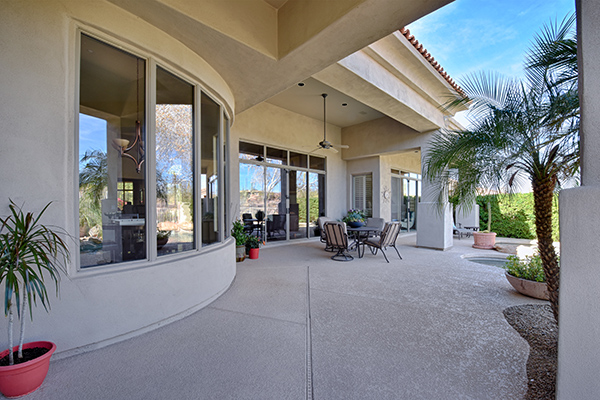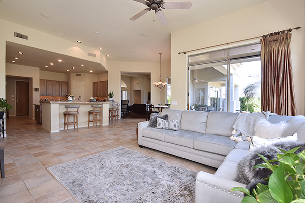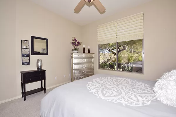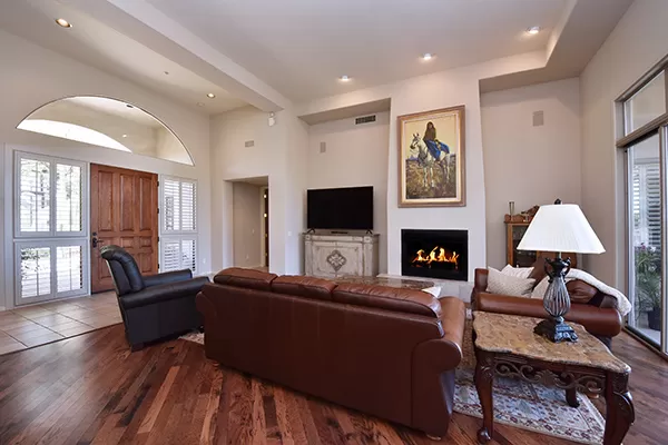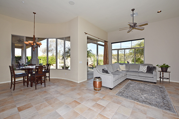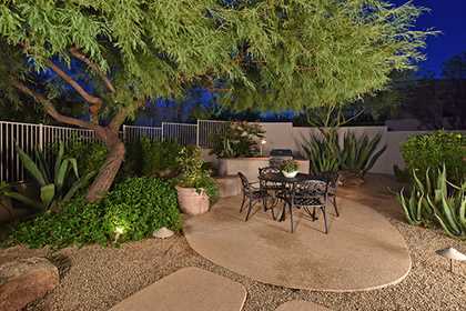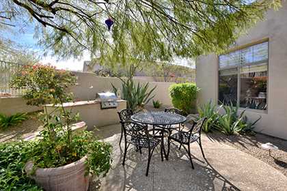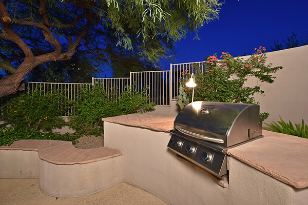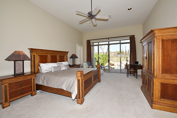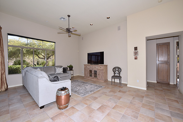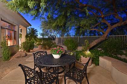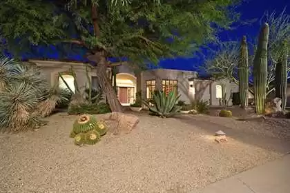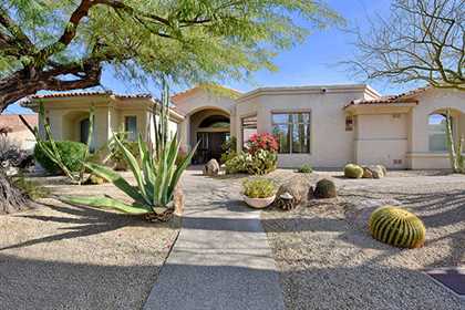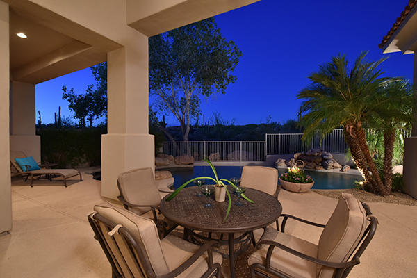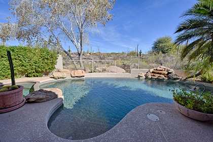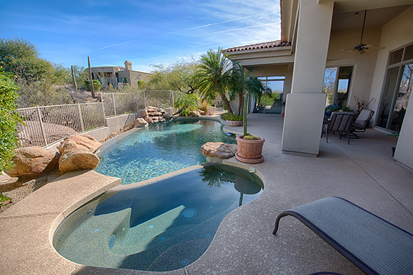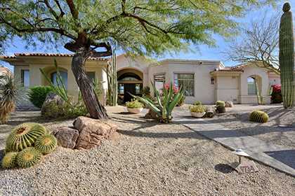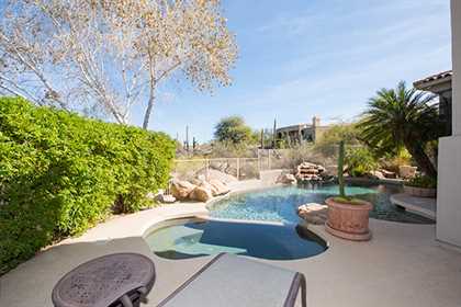 Located in Monument at Troon North this gated Edmunds Toll home sits along the 4th hole of the prestigious Monument Golf Course. The spacious 3,500 plus sq ft home opens to the formal living and dining rooms with beautiful wood floors, centerpiece fireplace, high ceilings and a wall of windows for an open feel. The kitchen opens to the family room and breakfast nook and has plenty of cabinet and counter space with a center island, granite counters, stainless steel appliances, wine refrigerator, gas cooktop, and bar counter top for additional seating. The master bedroom is split from the other rooms and has his and her walk in closets, dual vanities, with a large soaking tub, and dual entry shower. The large covered patio wraps around the backyard for plenty of space to entertain including the private side yard with built in BBQ and the refreshing pool and spa. Two additional bedrooms and a den located off the entry (with a private closet!) complete this great find!