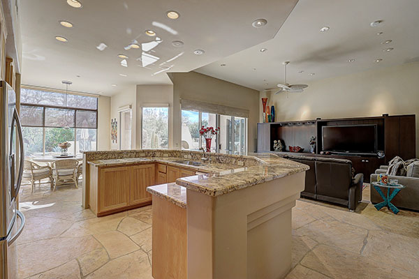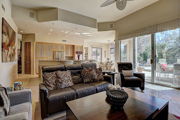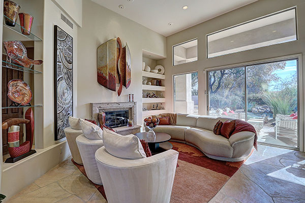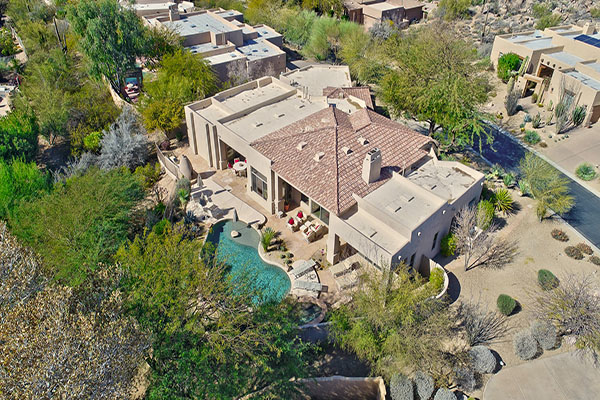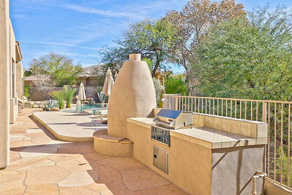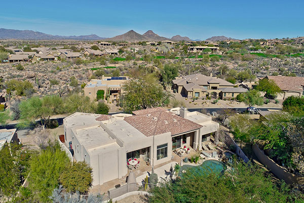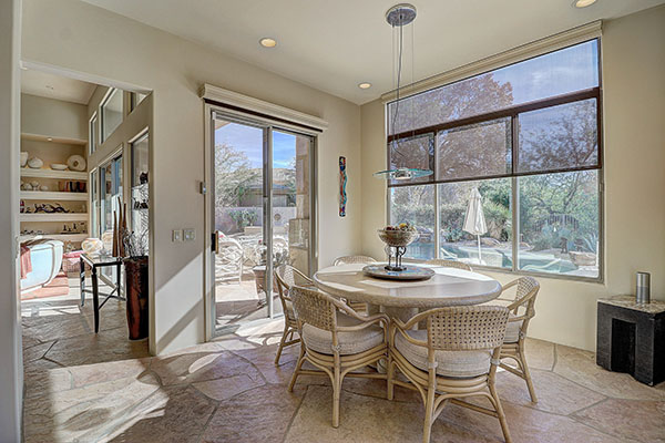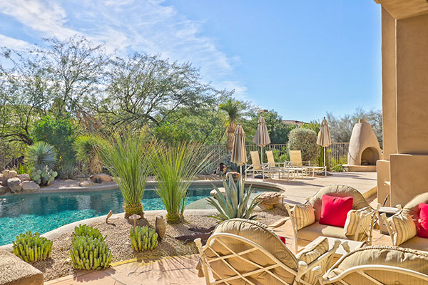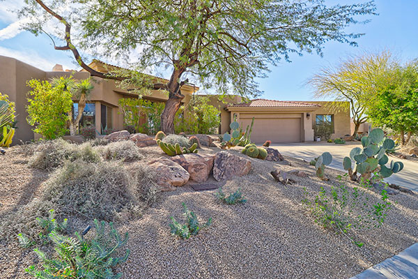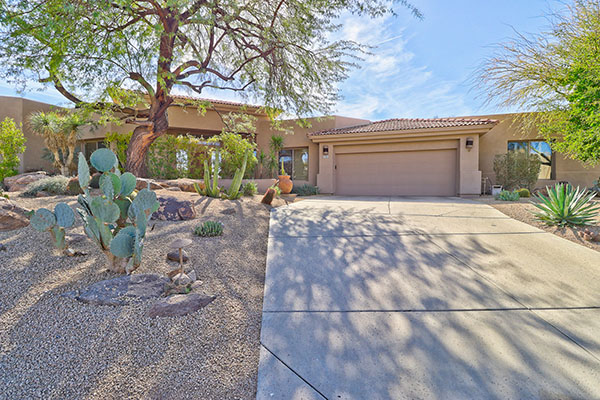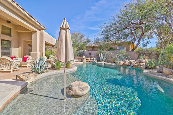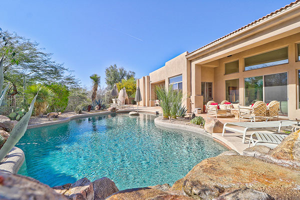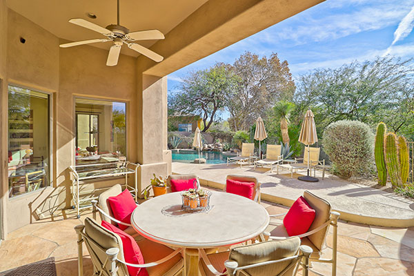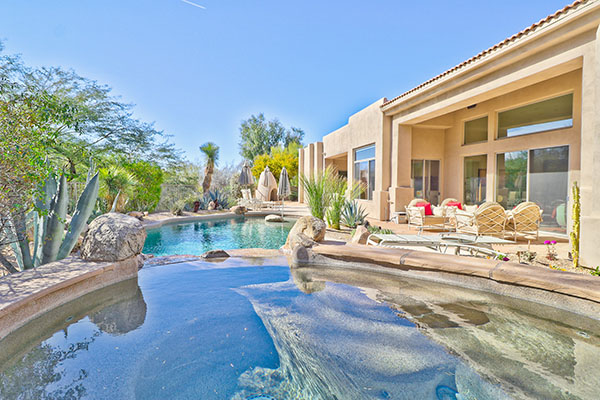 Designers own residence! 4130 sq feet including a 1800 SF addition! Beautiful and meticulous in gated Monument in Troon North. The sun-filled rear yard features a large pool with 2 rock water falls, spa, kiva fire place, 2 covered patios, built-in BBQ, and flagstone hardscape. Pool and professionally landscaped backyard visible from master suite, living/dining room, kitchen, and family rooms.